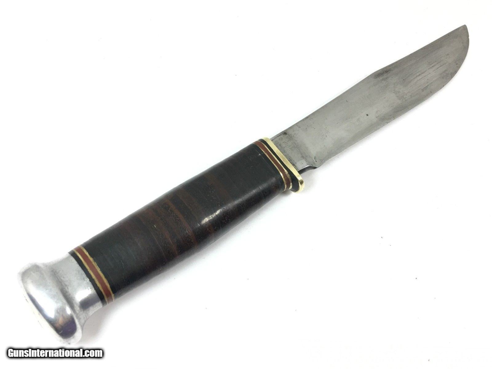 Description: Stacked leather handles were produced starting in 1919, and the large pommel nut was used until 1924 when the small nut pommel was introduced. Awesome, vintage Marbles USA, very high quality, fixed blade knife. This model is hard to find in this condition, made circa 1919-1924 Blade is in good condition, with some wear from age and use. Blade has some discoloration. Some sharpening wear, very small nicks in the blade that could be sharpened out. Beautiful handle made of stacked leather discs accented with an aluminum pommel and brass half guard. Knife measures 9-1/16" long with a 4-9/16" blade (measured from the tip to the guard) *****Shipping via USPS priorty mail with insurance is $10. I accept paypal, USPS money order, cashiers check and cash on pick up. I have hundreds of collectible knives listed on eBay, search for these seller names: irogusi blessbil wabbabubba SOLD |