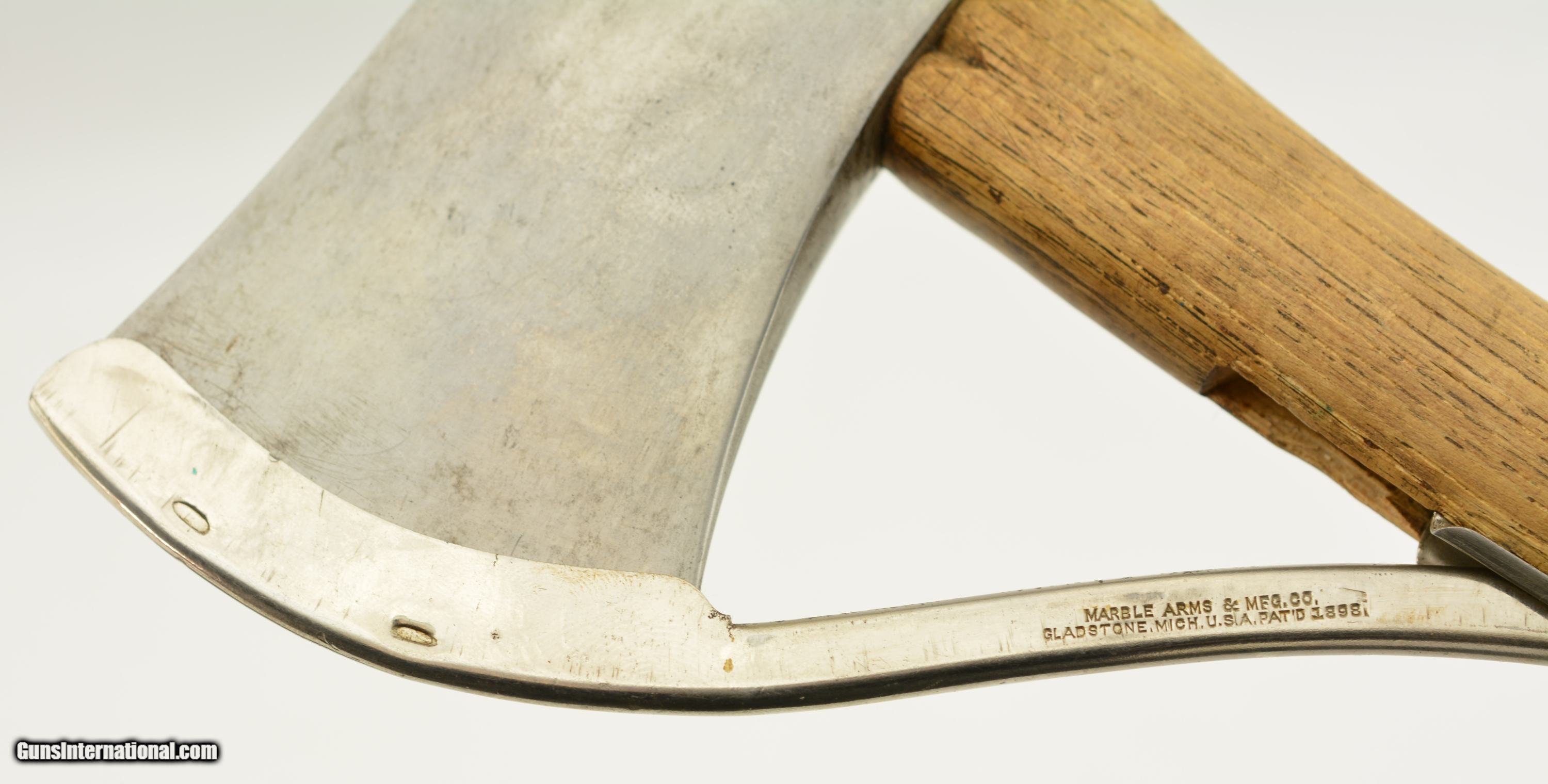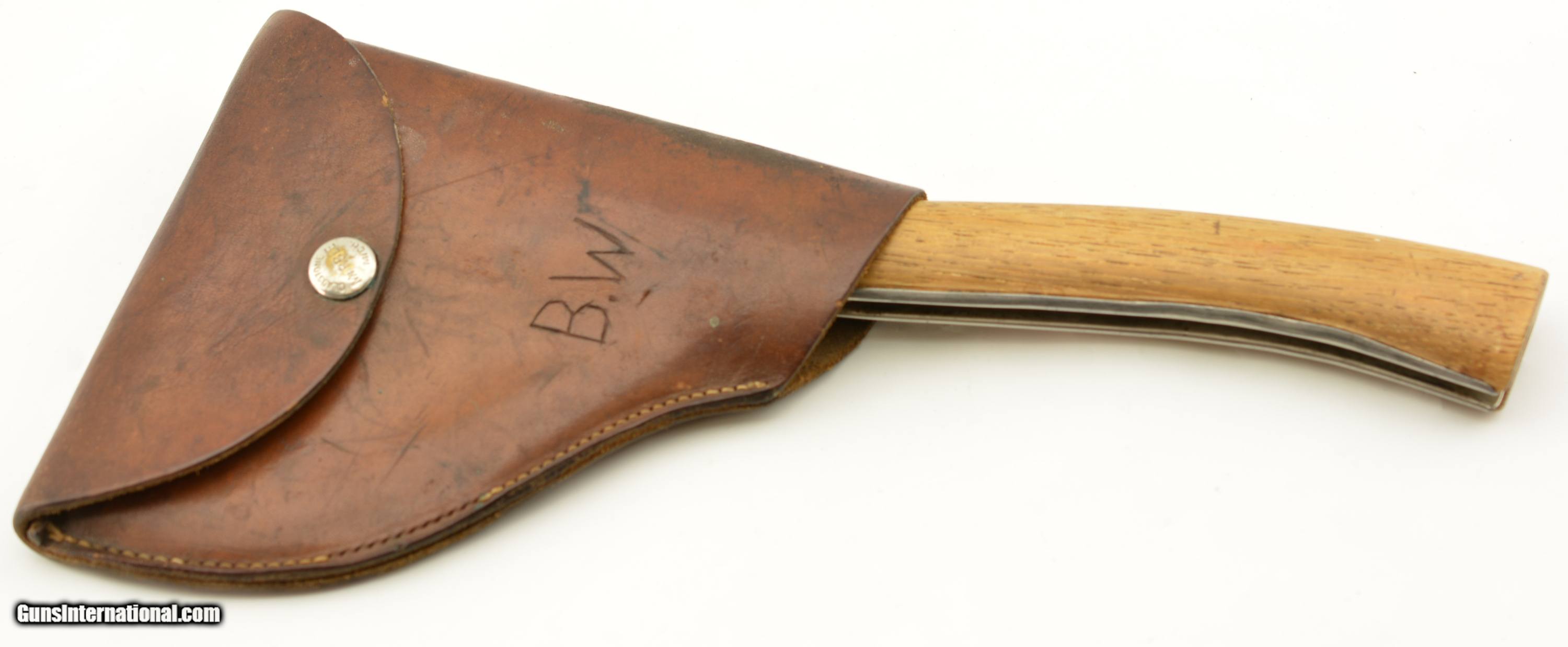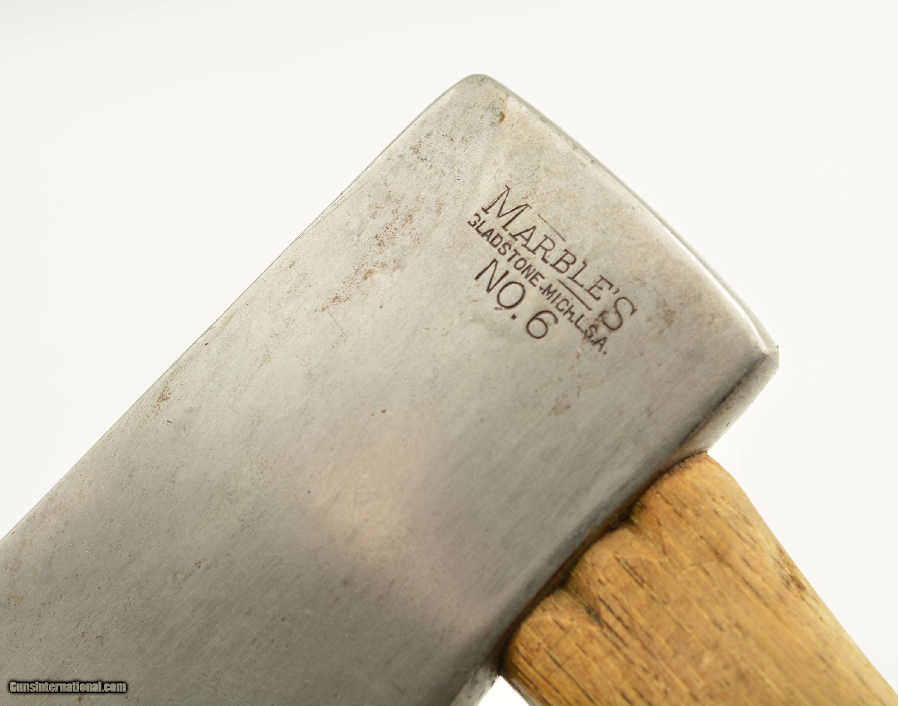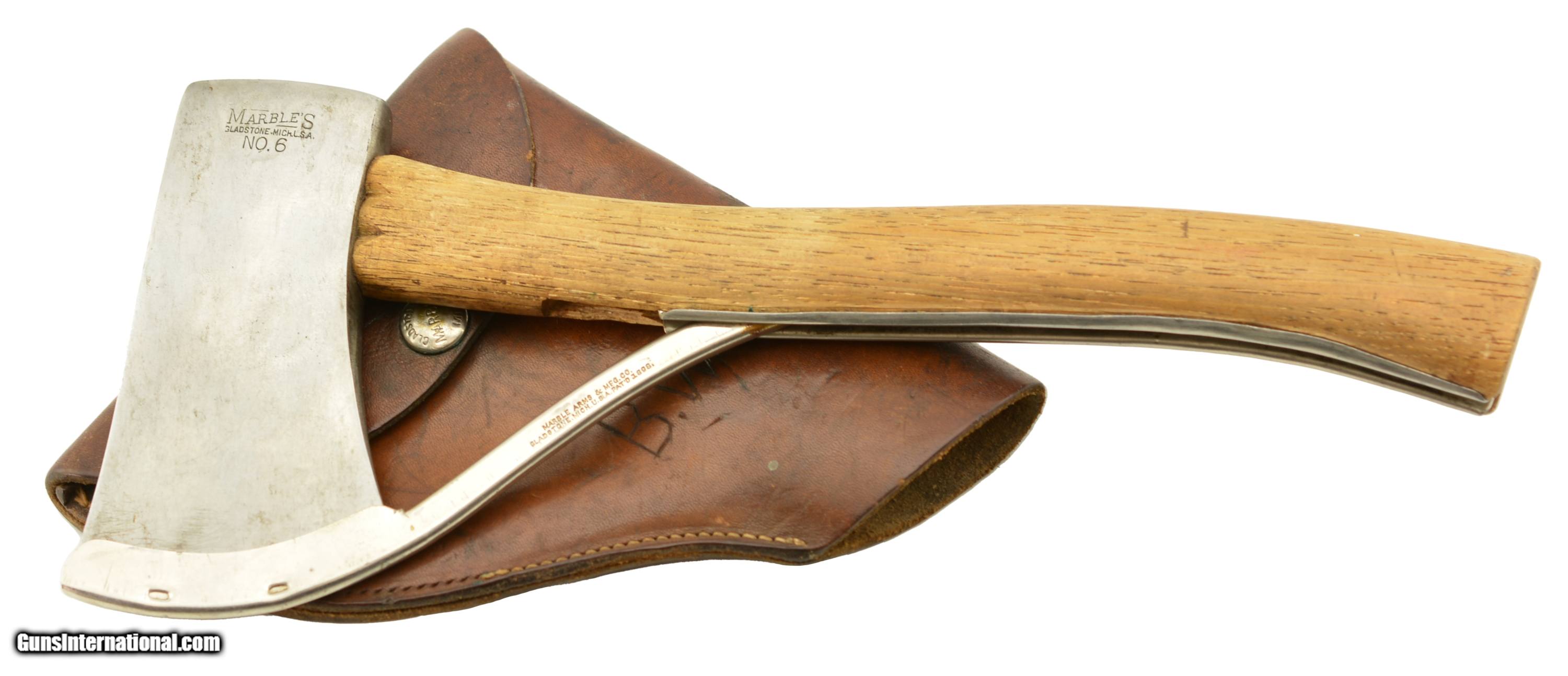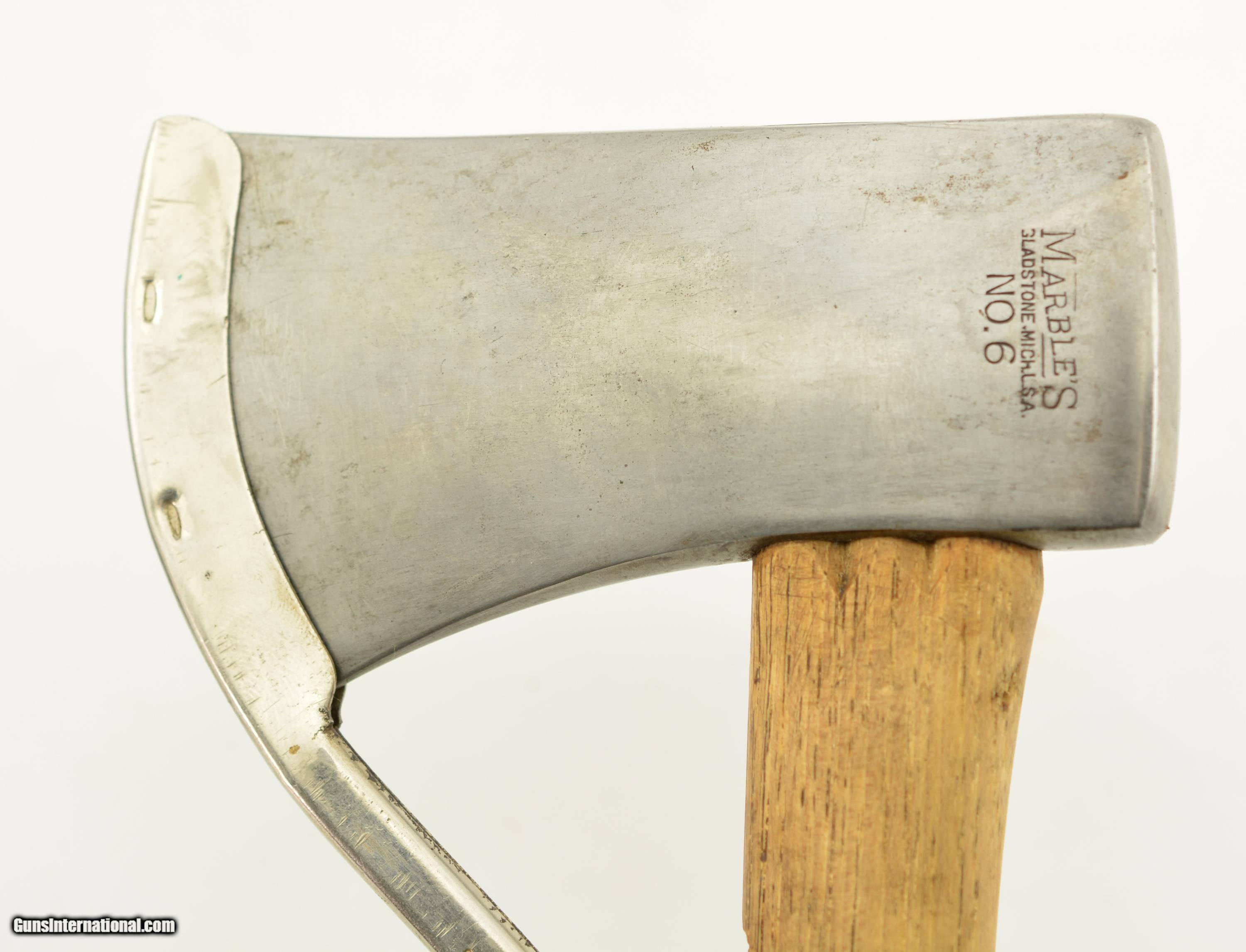 Description: Very Nice Vintage Marbles No. 6 Safety Axe. Stamped on guard Marble Arms & MFC. CO Gladstone, Mich. U.S.A. Patn. 1898. This dates the manufacture time between 1920’s and 50’s. The excellent condition carbon steel axe head has a 2 3/4? cutting edge which is free of chips and pitting. The 11 1/2? wood handle is in very good to excellent condition with only a slight impact near the end of the metal guard. The safety guard has 99% of it’s original finish and fully functional. The medium brown sheath is in very good condition with no real cosmetic injuries, one small area in the past has been re-dyed, is missing about an inch of stitching. It is stamped with a 6 on the back for identification, with a carved “BW" on the front. SOLD Manufacturer: Marbles Model: Axe |