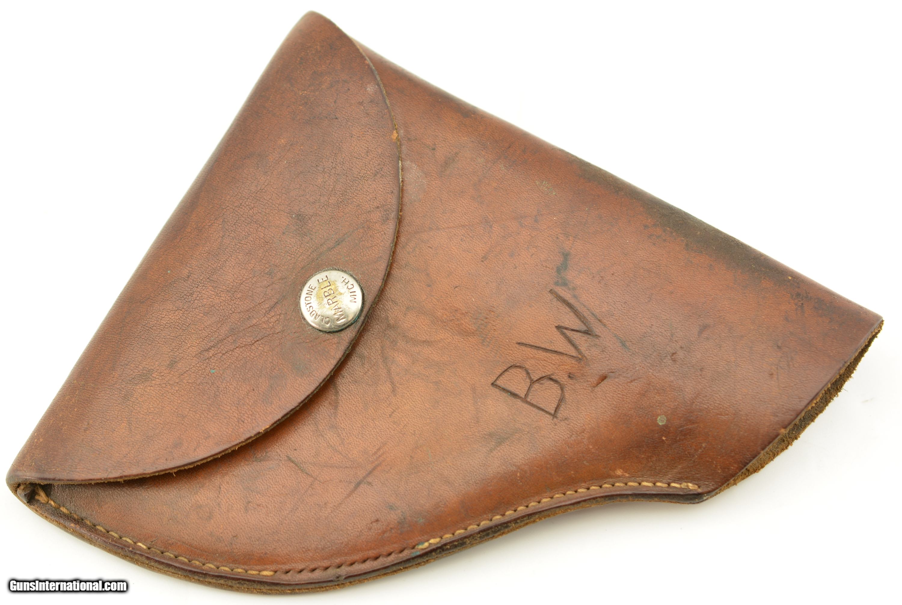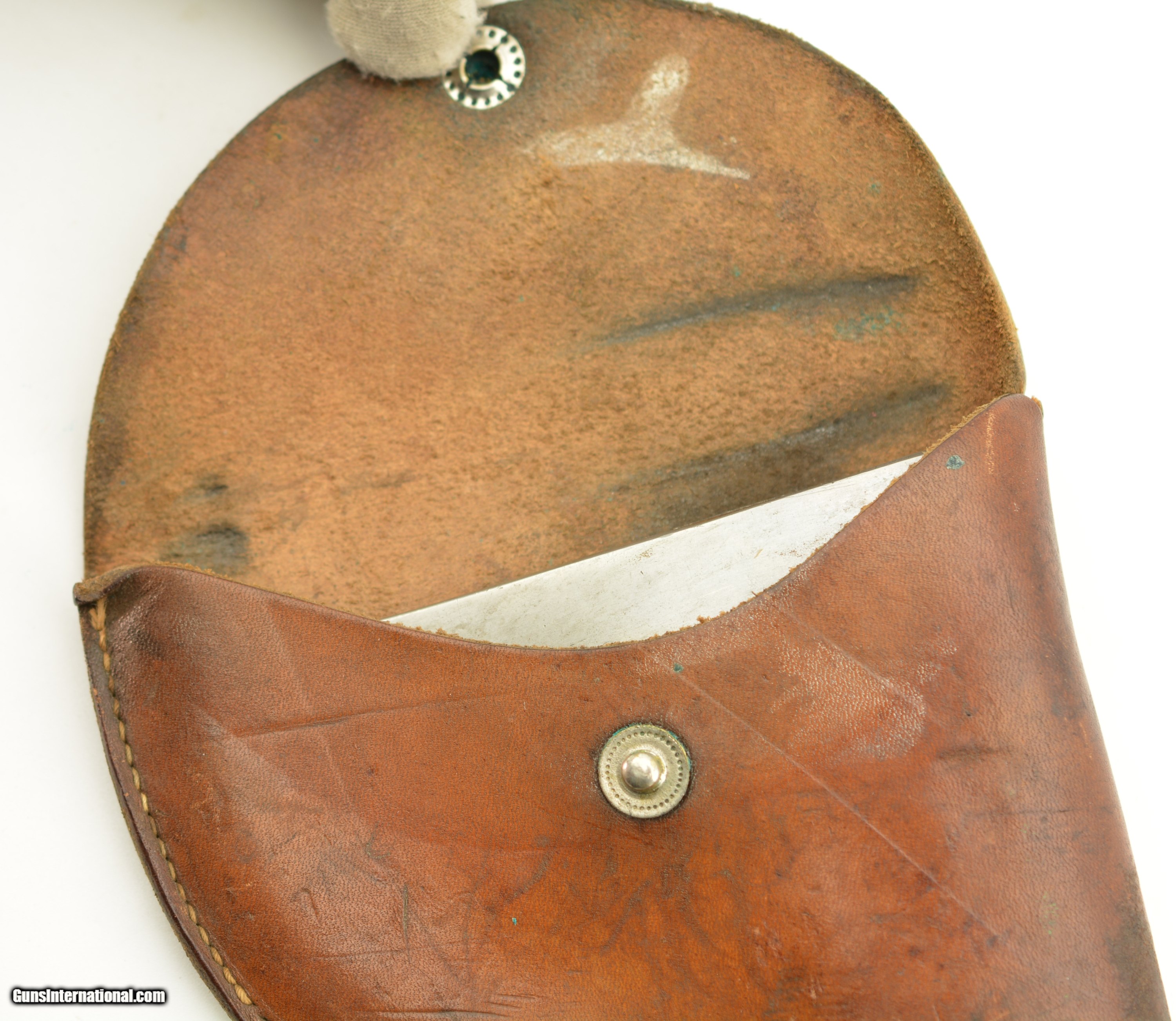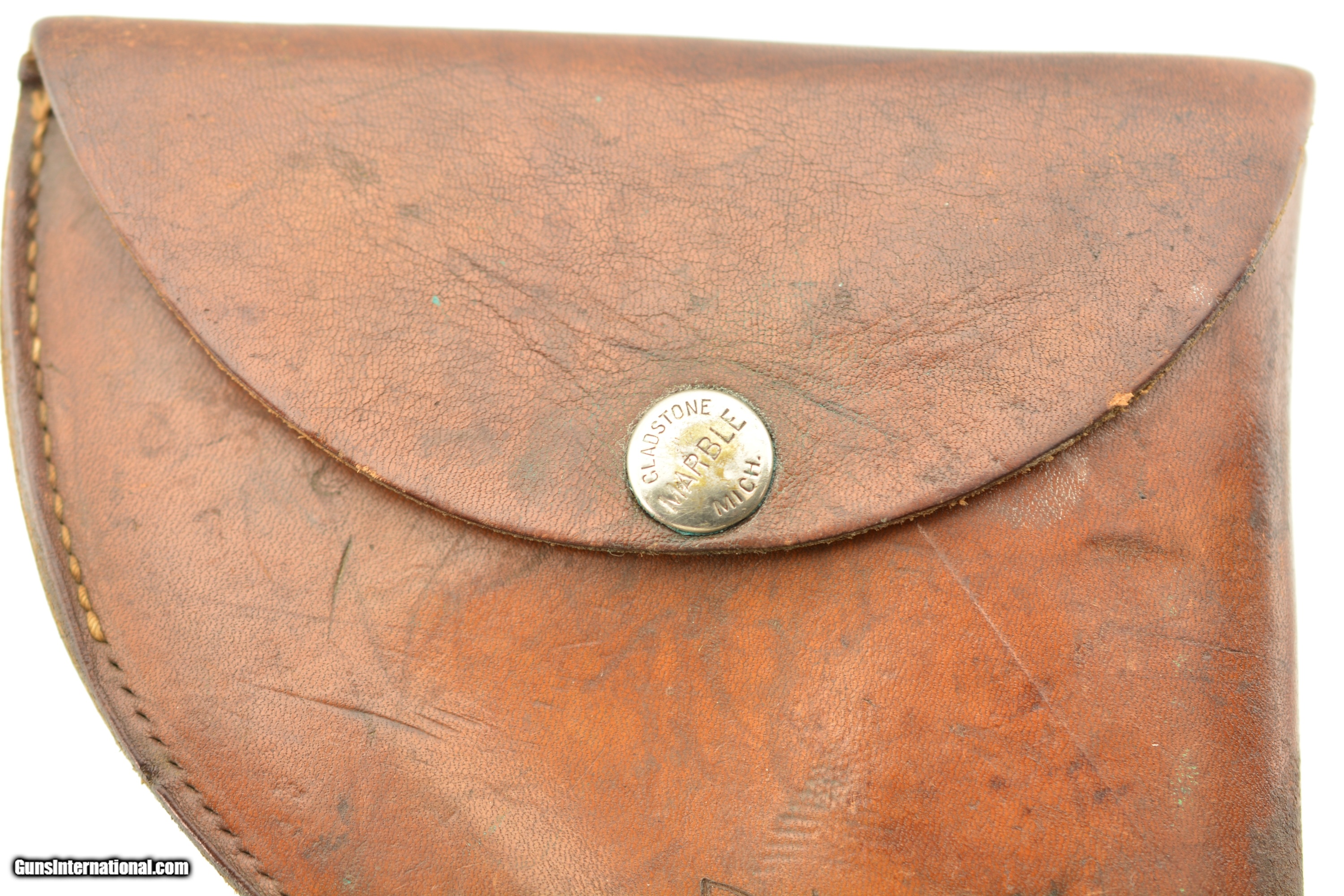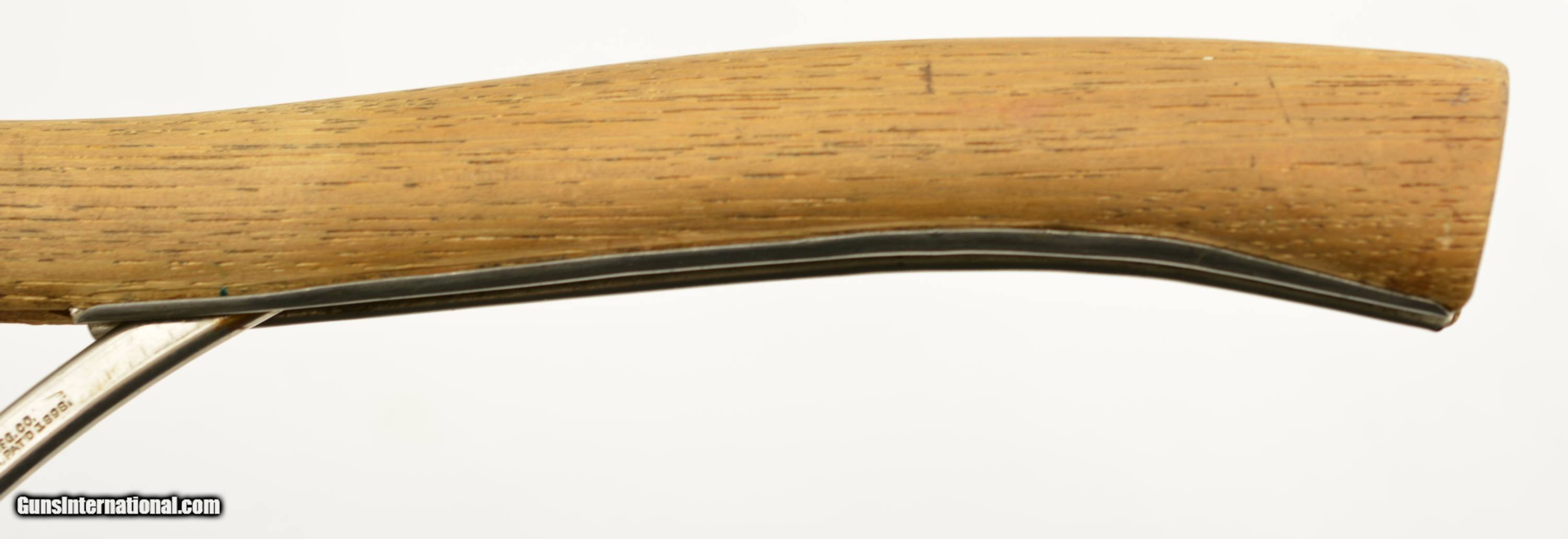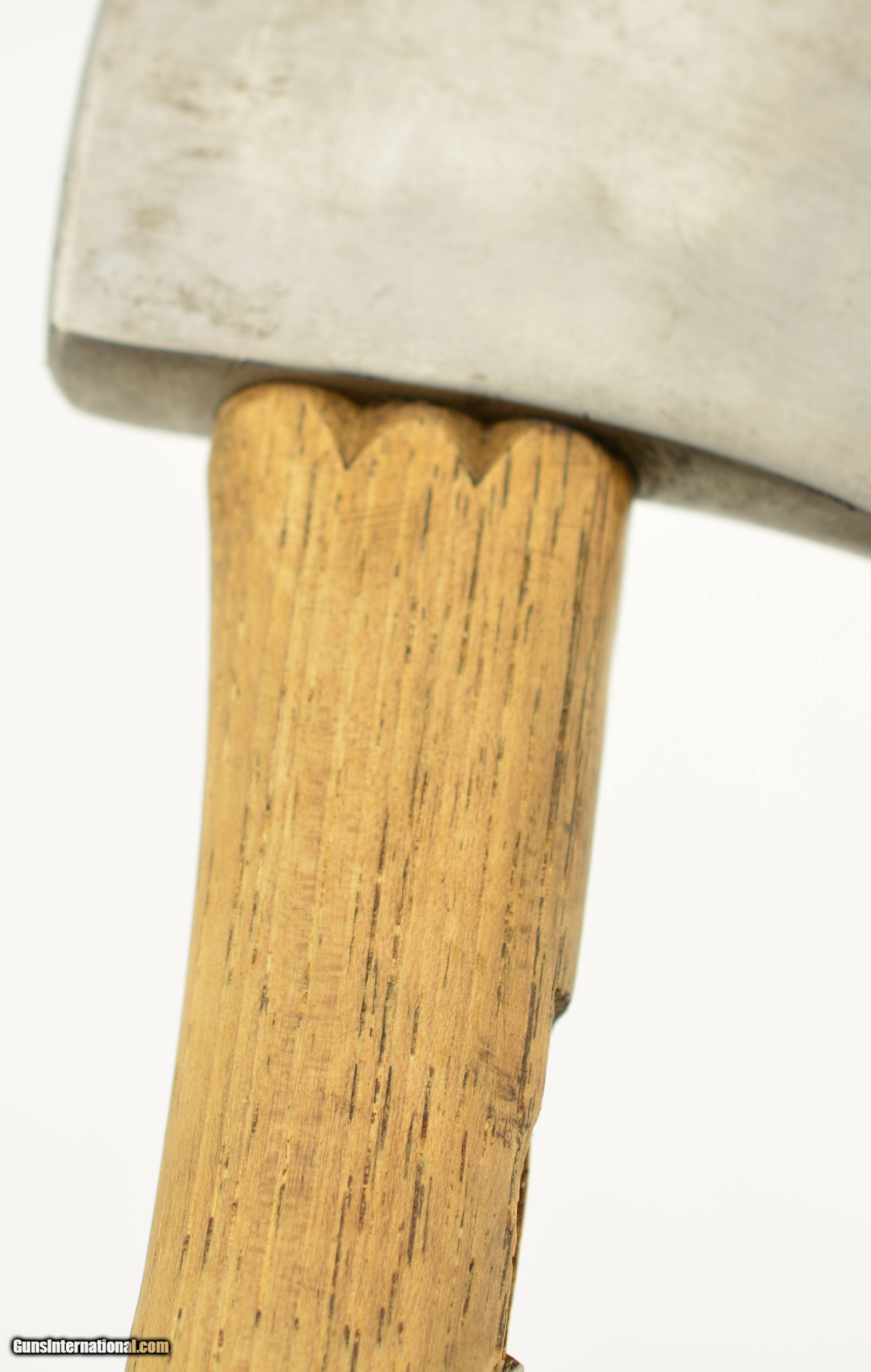 Description: Very Nice Vintage Marbles No. 6 Safety Axe. Stamped on guard Marble Arms & MFC. CO Gladstone, Mich. U.S.A. Patn. 1898. This dates the manufacture time between 1920’s and 50’s. The excellent condition carbon steel axe head has a 2 3/4? cutting edge which is free of chips and pitting. The 11 1/2? wood handle is in very good to excellent condition with only a slight impact near the end of the metal guard. The safety guard has 99% of it’s original finish and fully functional. The medium brown sheath is in very good condition with no real cosmetic injuries, one small area in the past has been re-dyed, is missing about an inch of stitching. It is stamped with a 6 on the back for identification, with a carved “BW" on the front. SOLD Manufacturer: Marbles Model: Axe |