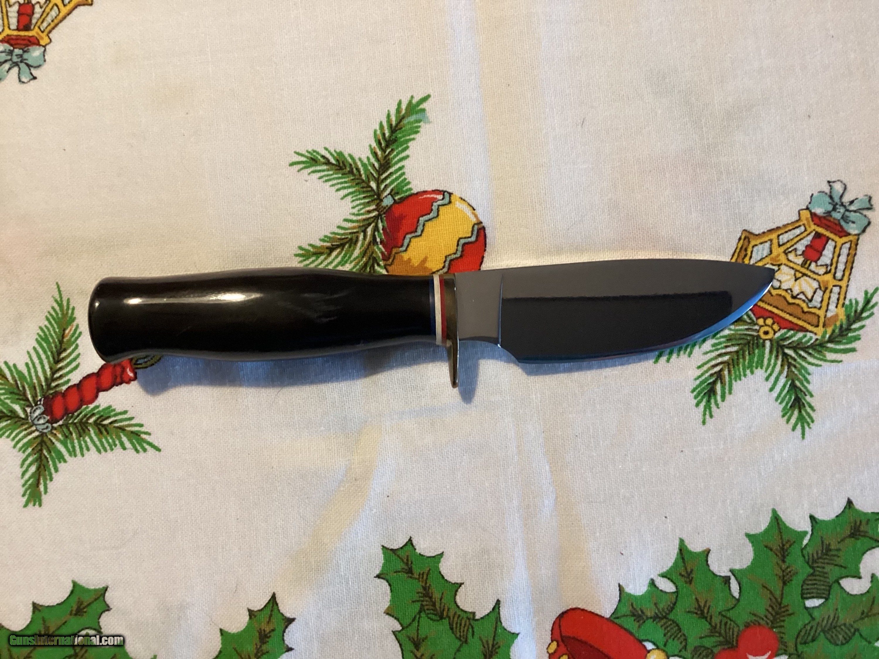 Description: I purchased this many years ago from Marbles of upper Michigan when they were going out of business. I purchased several dull finished blanks 52-100 steel from them and had some of them finished into knives. Most I sold as blanks. I met a knife maker at a knife show and he agreed to finish them. I picked out the hardware I wanted on the knives.There are no markings on the blade, never was any. There is no sheath. The maker did a beautiful job. Blade is 3 7/8”, overall 8 1/8”. Blade is 3/16” thick. The handle is genuine Buffalo horn, with brass finger guard and a brass cap at the rear of the handle. I only accept USPS postal M/O’s as payment. Shipping to CONUS only for shipping price stated, I will consider offers. Please see my other knives for , thanks for looking, good luck Price: $200.00 Shipping: $15.00 Contact Seller |