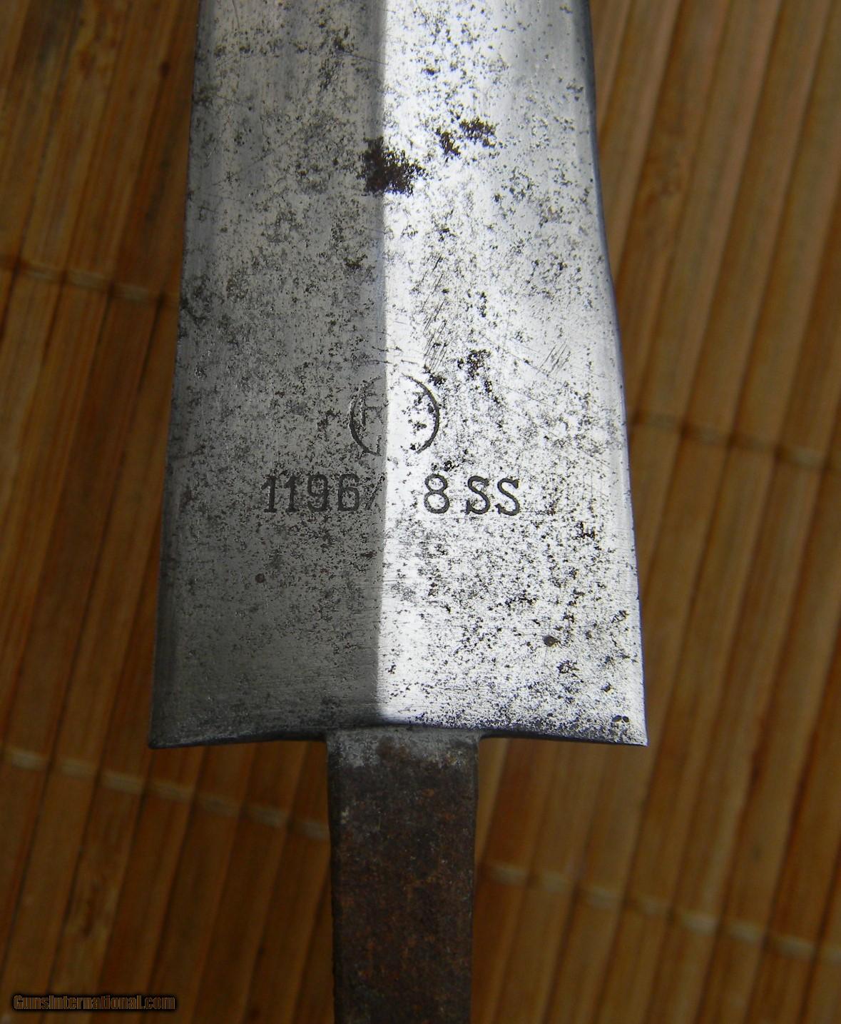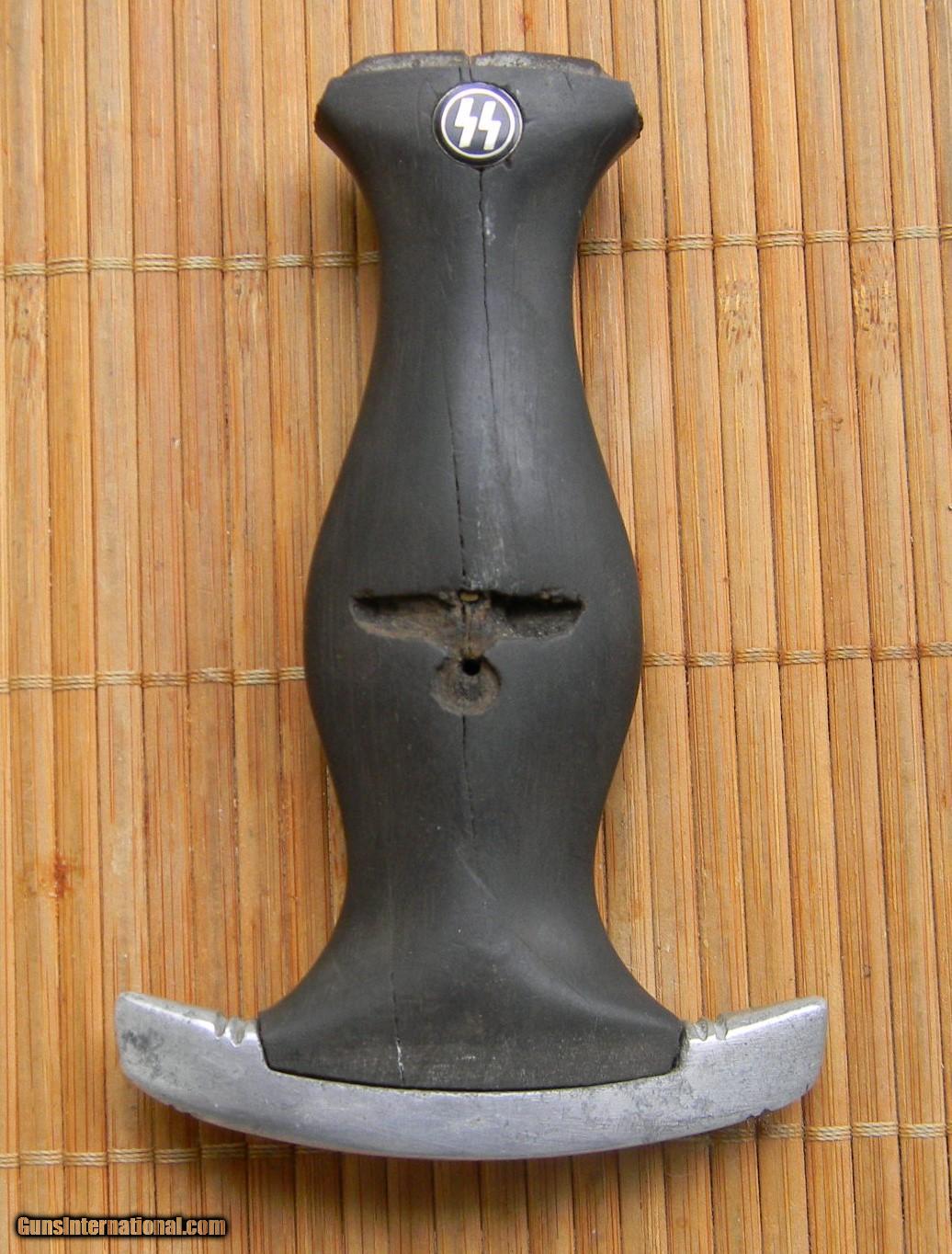 Description: Affordable authentic German World War II SS Dagger with correct un identified makers mark for early 1938 production. See Germam Daggers . Disassembled and assembled to see all the parts. All parts are authentic and original to the knife with the exception of the small SS insignia in the grip for exactness. Verbal provenance of early battlefield pick up Kurland pocket. Bought from a reputable collector. Honest wear. SOLD |