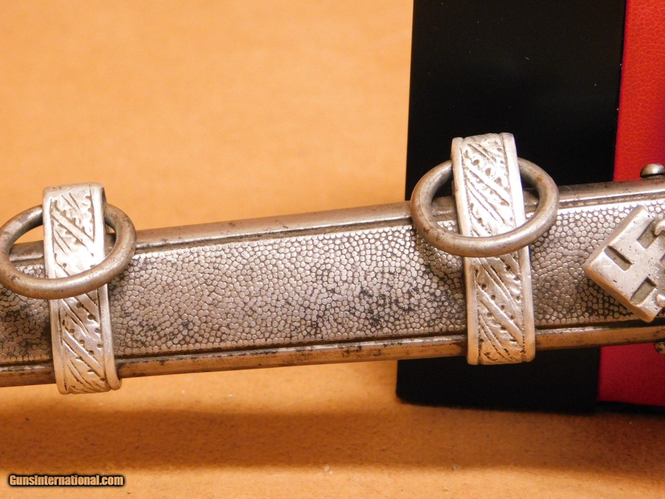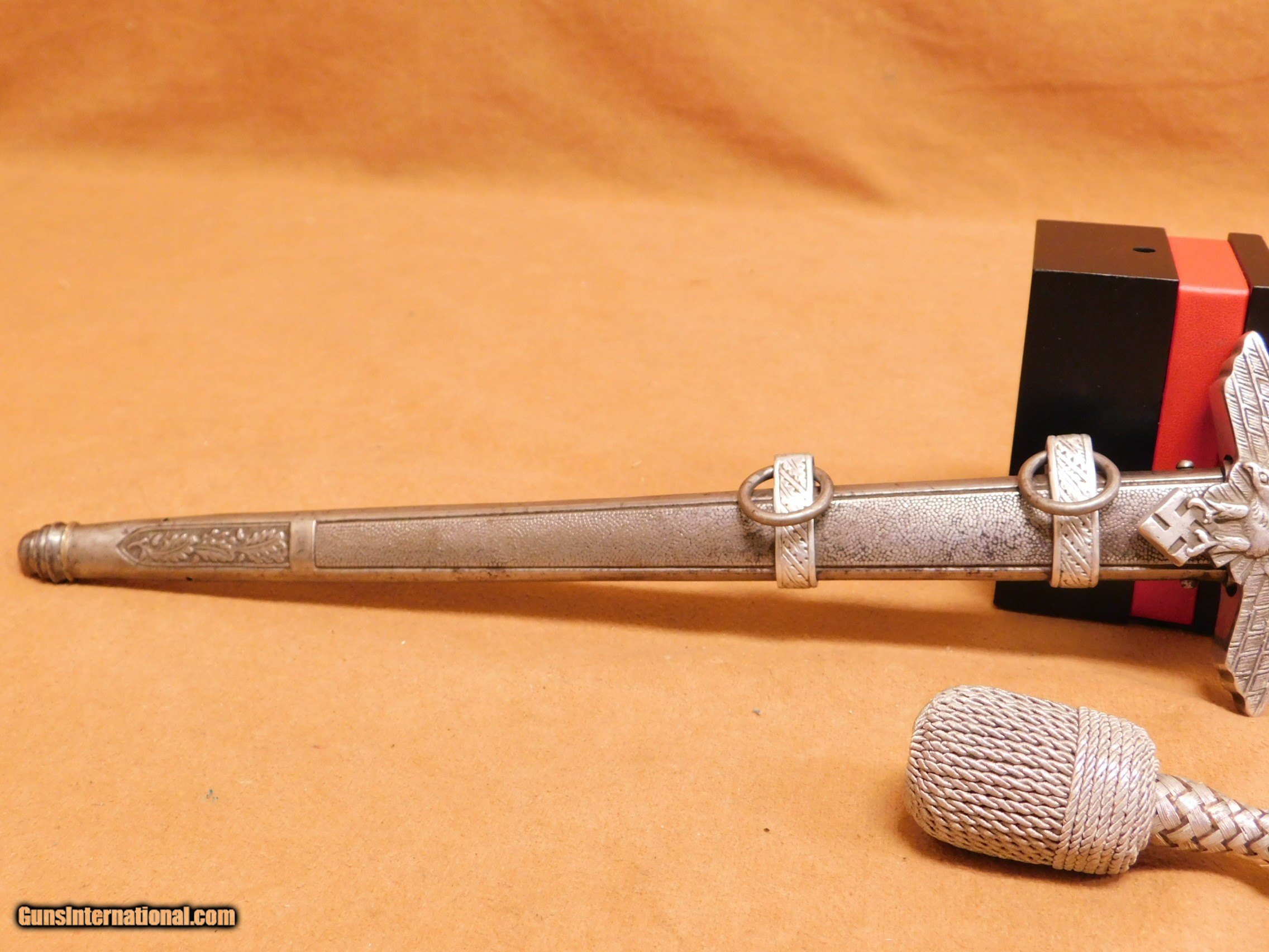 Description: This Emil Voos produced 2nd Model Luftwaffe Dagger is a nice example and is equipped with choice generic mounts. These mounts have the pebble pattern style pommel with oak leaves going around a double circle that encloses a mobile swastika on both sides. The pebbling throughout the pommel is also nice and crisp. The cross guard is also the generic type, featuring the large pebble pattern on the reverse side. The obverse features a Luftwaffe eagle flying to the viewer’s left. The detail is outstanding throughout this bird’s wings, head, breast feathering, talons and smooth mobile swastika that he clutches in his claws. These generic cross guards are easily identified by the large pebbles on the reverse as well as the slight cantilever of the upper portion of the obverse cross guard that goes over the eagle’s wings. The upper quillons have cast in oak leaves and acorns. The blade retains approximately 90% of the original plating with few scratches to the finish. The tip is needle-sharp and perfect. It comes with the original aluminum portapee, which has a little fraying on its cord. All items are also available for sale in our brick & mortar store and are subject to prior sale. Think long, think wrong. Payment On firearms, we typically only accept credit cards or money orders/cashier's checks.