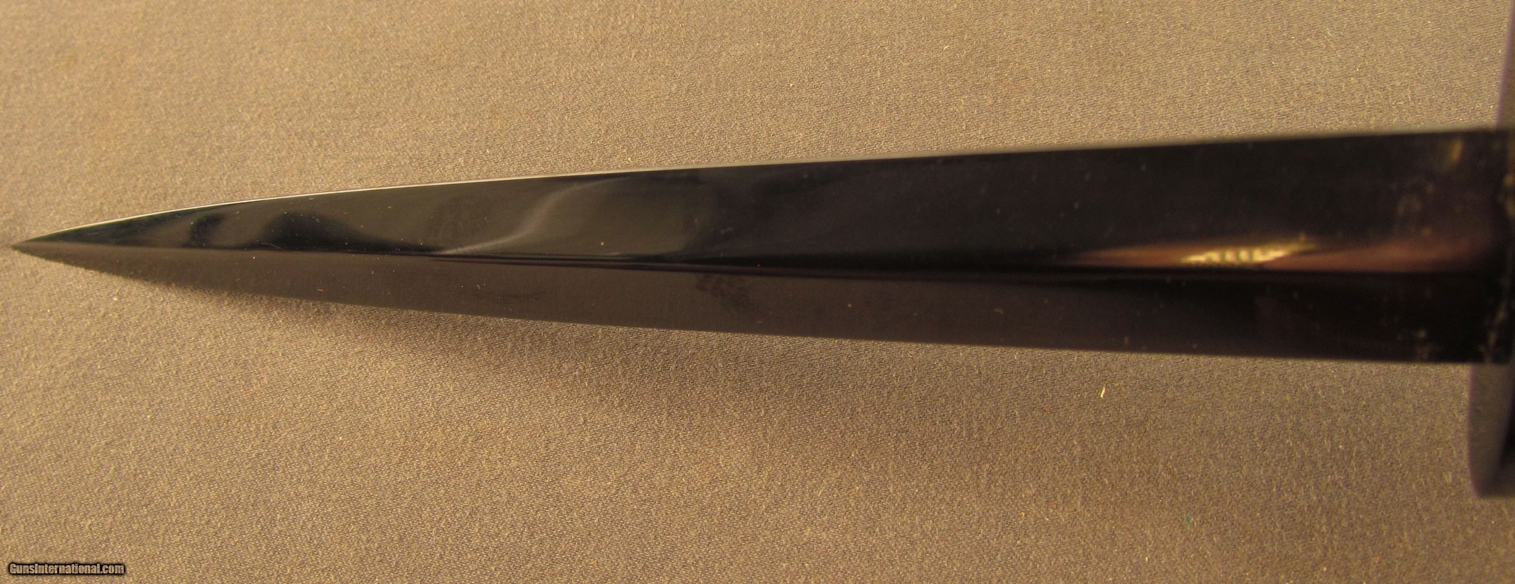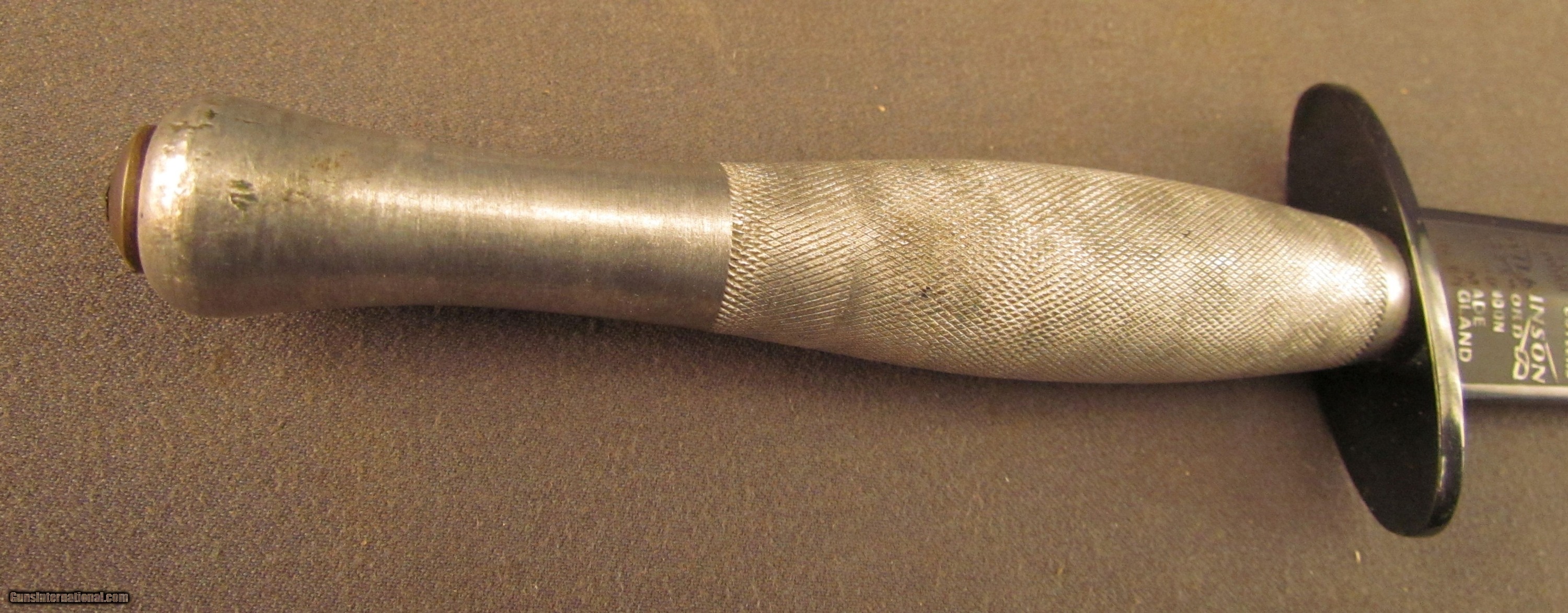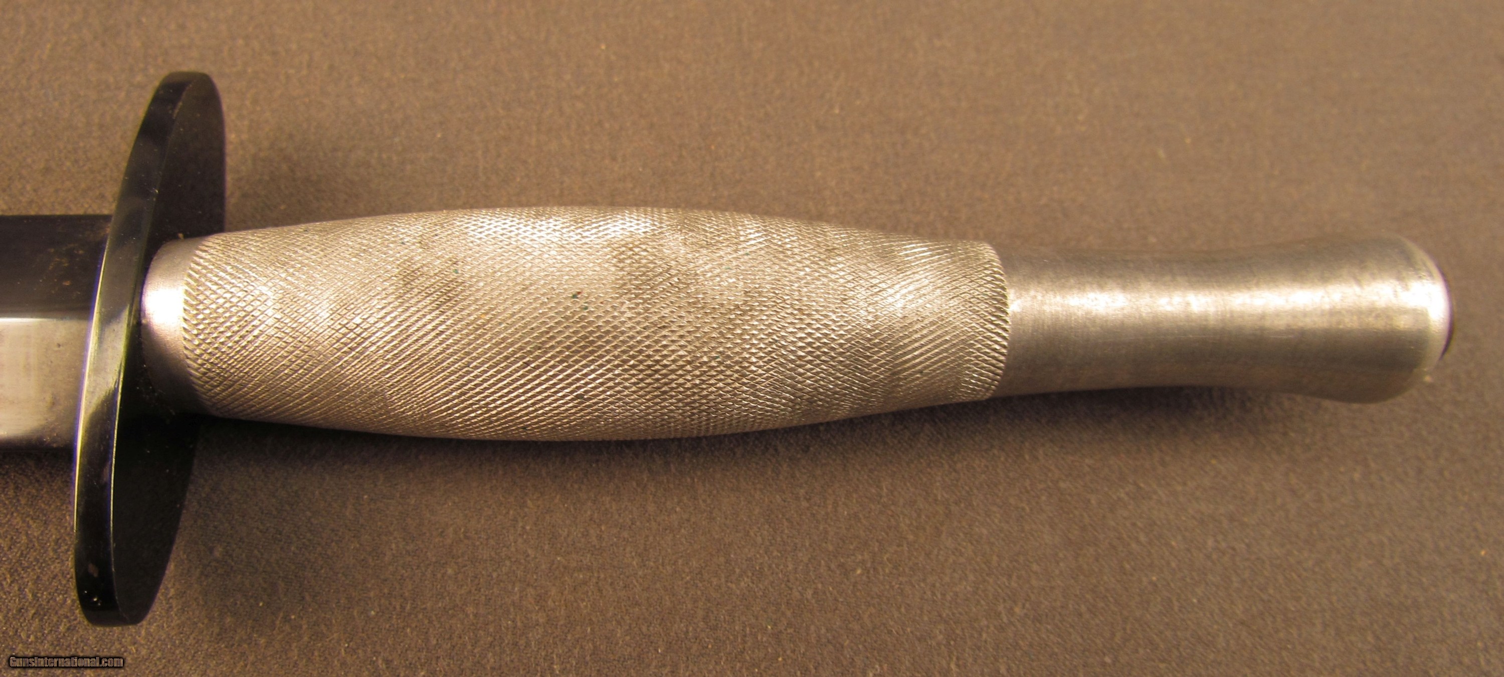 Description: A Less common example of a post war aluminum hilted command or dagger. This well made piece shows a 7" blade blackened with the later Wilkinson sword logo. The blued cross guard is unmarked. The hilt is knurled aluminum with a smooth bolster and a brass screw disk. This example was one possibly built by the J. Newill & Sons for reference see Commando Dagger by Leroy Thompson page 134 and page 64. This piece came froma collection of knives sourced out of South Africa. We cannot verify anything related to this example other than present. it has a very well built post war FS Dagger, identical if not the same dagger as show in the above reference. SOLD Manufacturer: British Model: Knife |