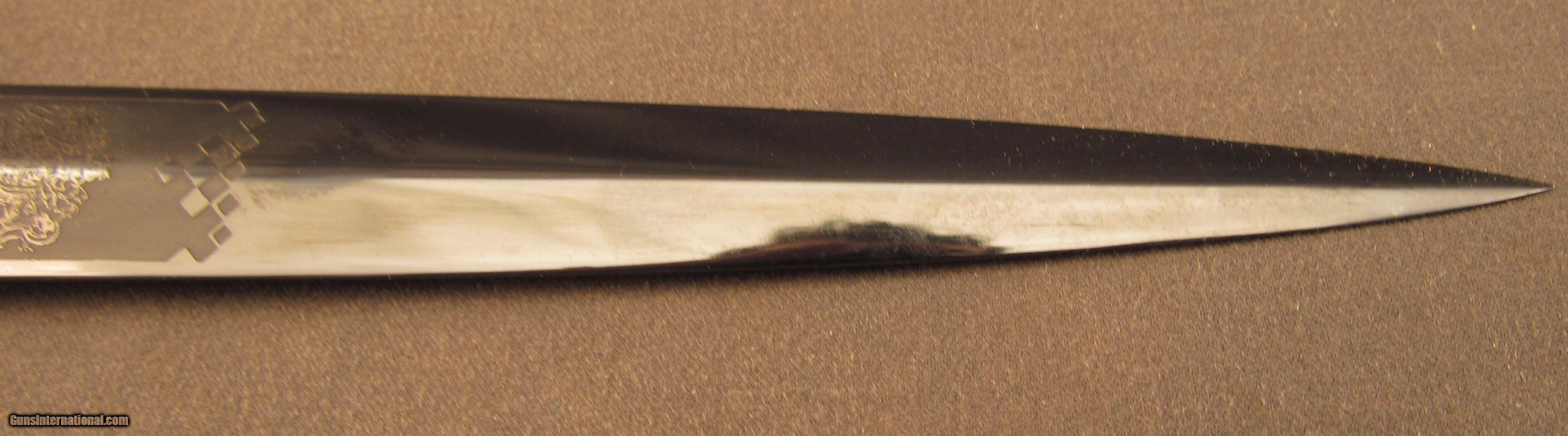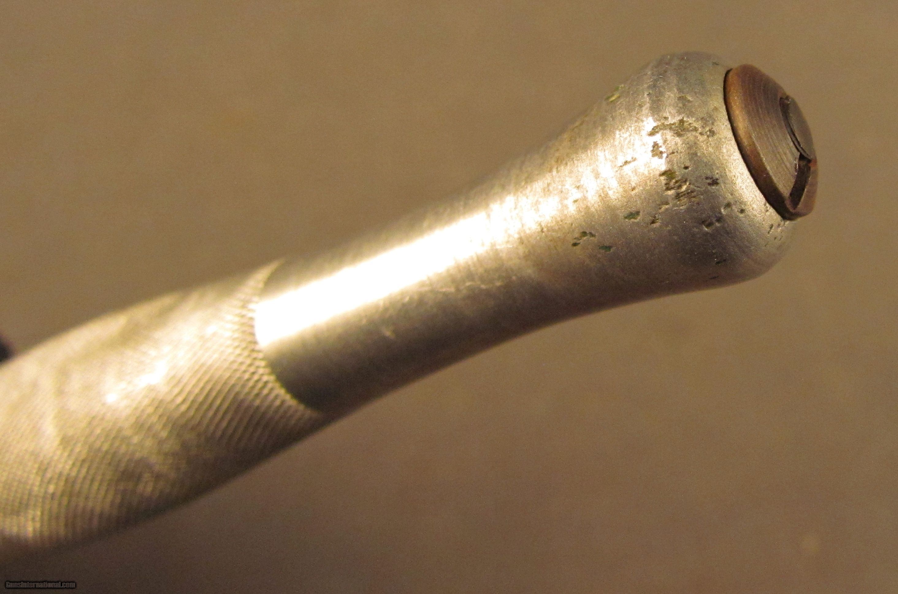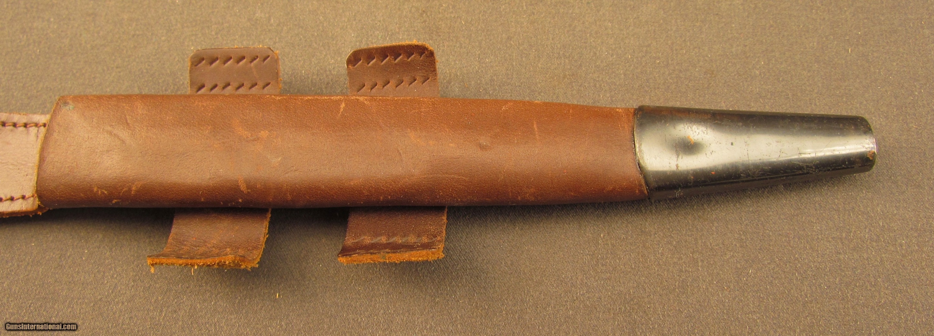 Description: A Less common example of a post war aluminum hilted command or dagger. This well made piece shows a 7" blade blackened with the later Wilkinson sword logo. The blued cross guard is unmarked. The hilt is knurled aluminum with a smooth bolster and a brass screw disk. This example was one possibly built by the J. Newill & Sons for reference see Commando Dagger by Leroy Thompson page 134 and page 64. This piece came froma collection of knives sourced out of South Africa. We cannot verify anything related to this example other than present. it has a very well built post war FS Dagger, identical if not the same dagger as show in the above reference. SOLD Manufacturer: British Model: Knife |