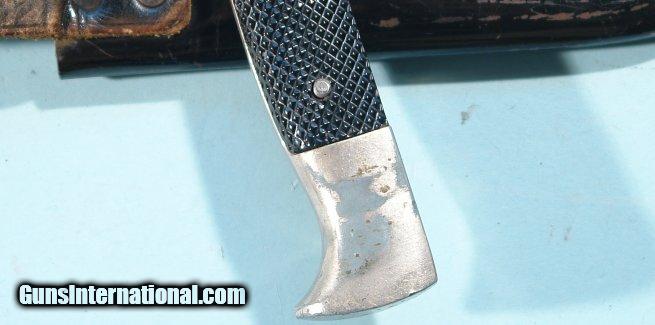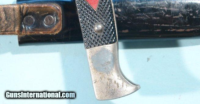 Description: PRE WW2 RZM HITLER YOUTH DAGGER DATED 33 AND SCABBARD. Very good and all original with original washer. Scabbard paint with scratches and blade with minor wear. Blade lightly sharpened. Nickel plating on pommel worn at the scabbard leather metal snap on the sides. Early and rare. SOLD |