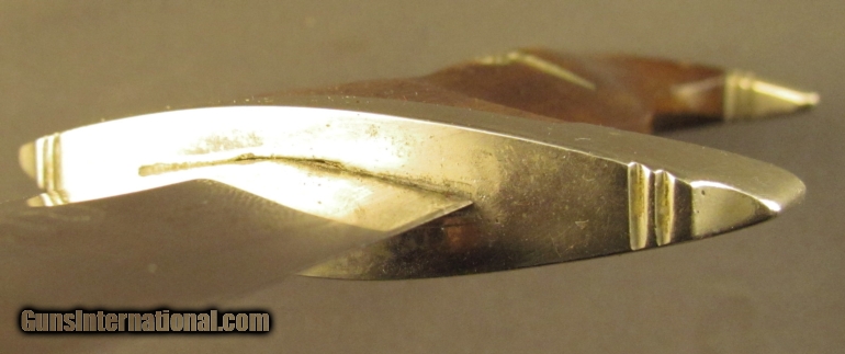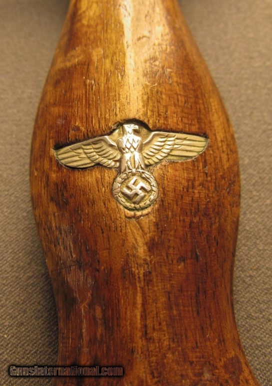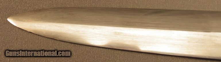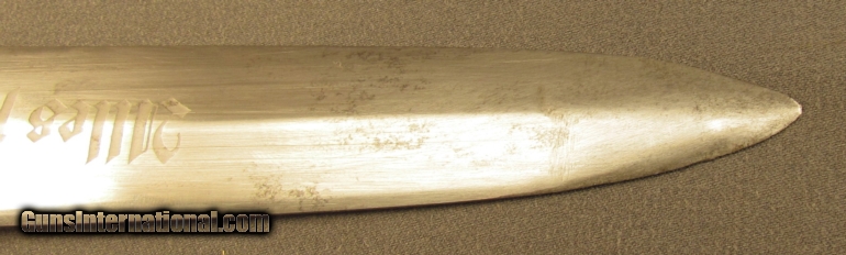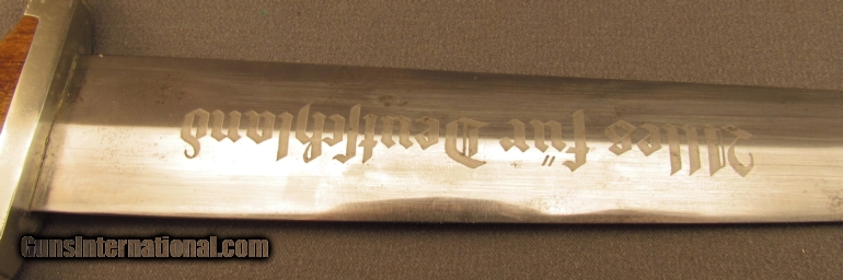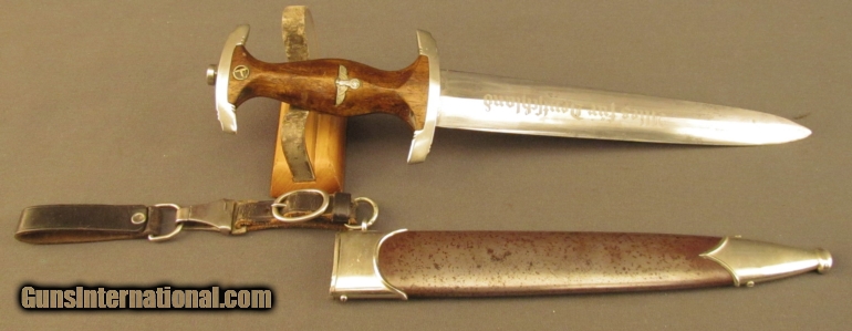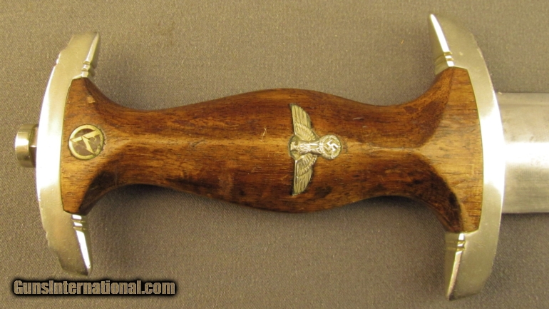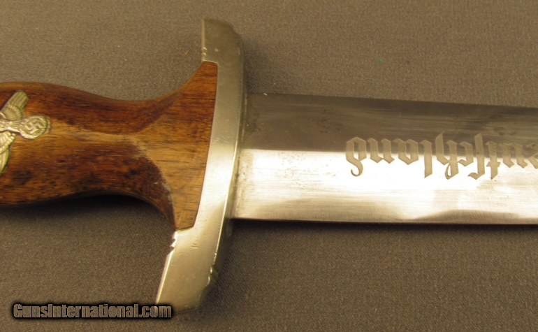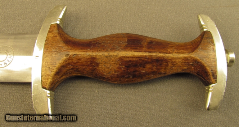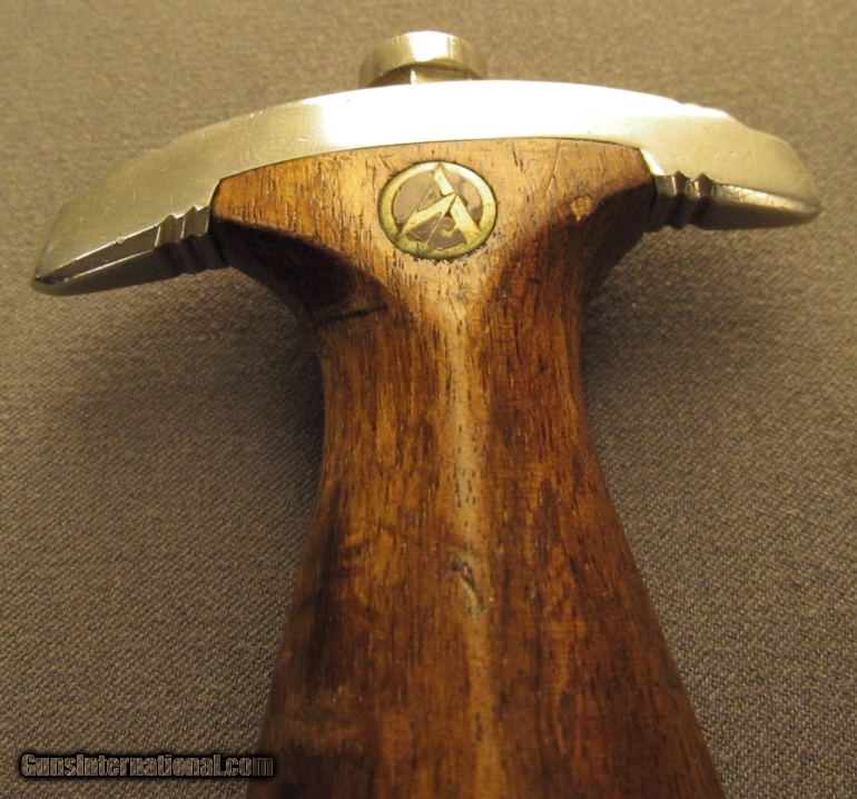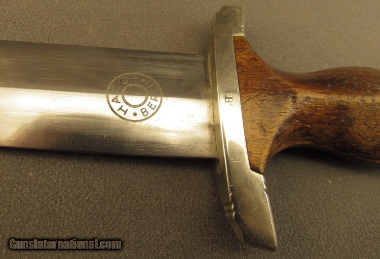 Description: This rare dagger measures 13 1/2" overall with an 8 3/8" straight, single-edged blade that has most of the original bright polish remaining on the forte and moderate-heavy grind marks at the tip on both sides. The "Alles fr Deutschland" motto is still crisp, as is the "HACO/BERLIN" roundel trademark on the reverse. The hilt fittings are in very good condition and have bright nickel with a few scattered spots of freckling and a crisp "B" (Gau Berlin) marking on the reverse of the counterguard. The hardwood grip is moderately worn and retains about 75% of the original varnish and the S.A. rune inlay and eagle are in fine shape. The metal scabbard has a few minor dents along the body and retains traces of the original brown anodized finish with a mixed brown-gray patina on the balance and specks of brown freckling throughout. An original R.Z.M. marked brown leather hanger is included which has very good leather; lightly flaked but still intact and fully serviceable. HACO-made daggers are quite desirable in any condition and this example is in good plus condition. SOLD Manufacturer: German Model: Dagger |