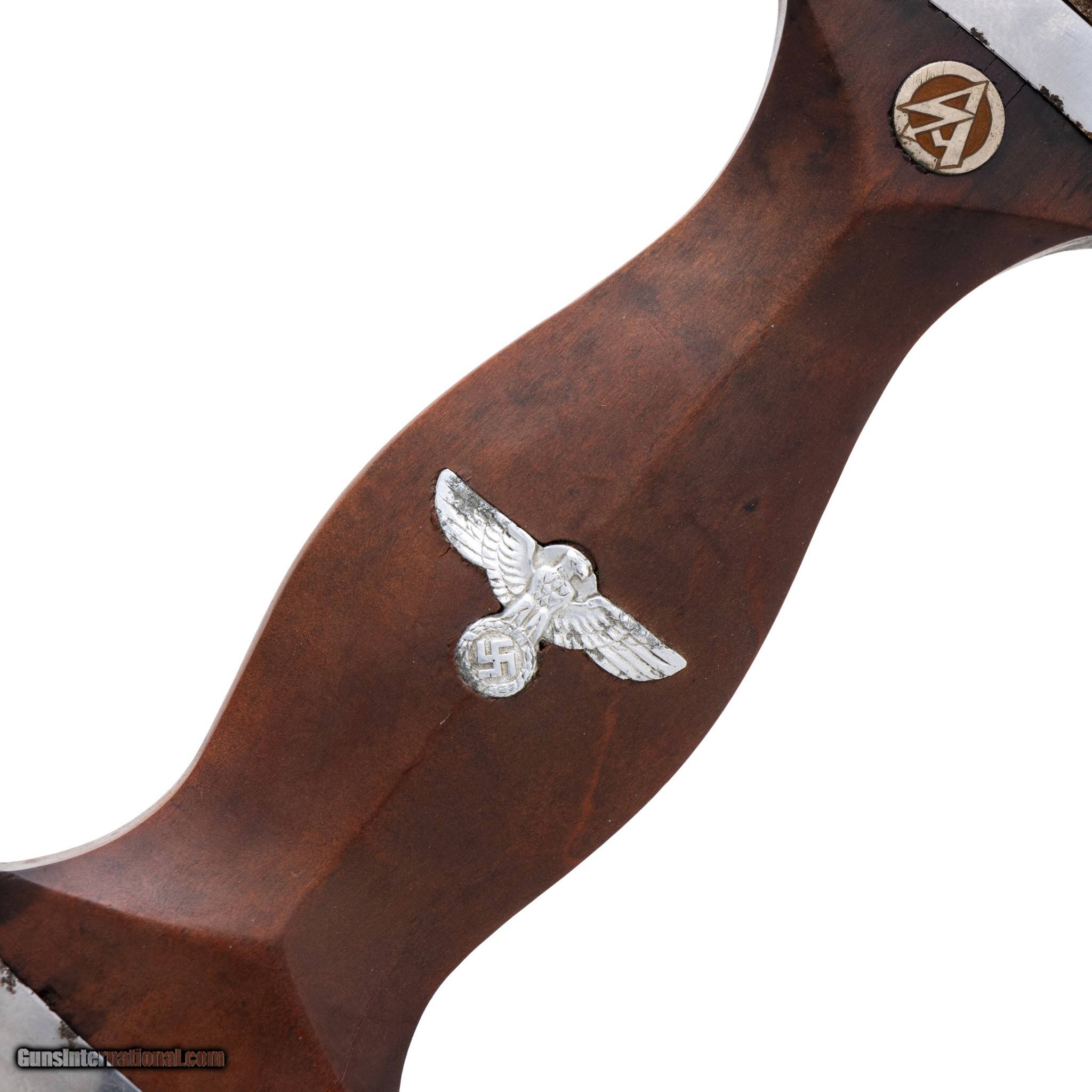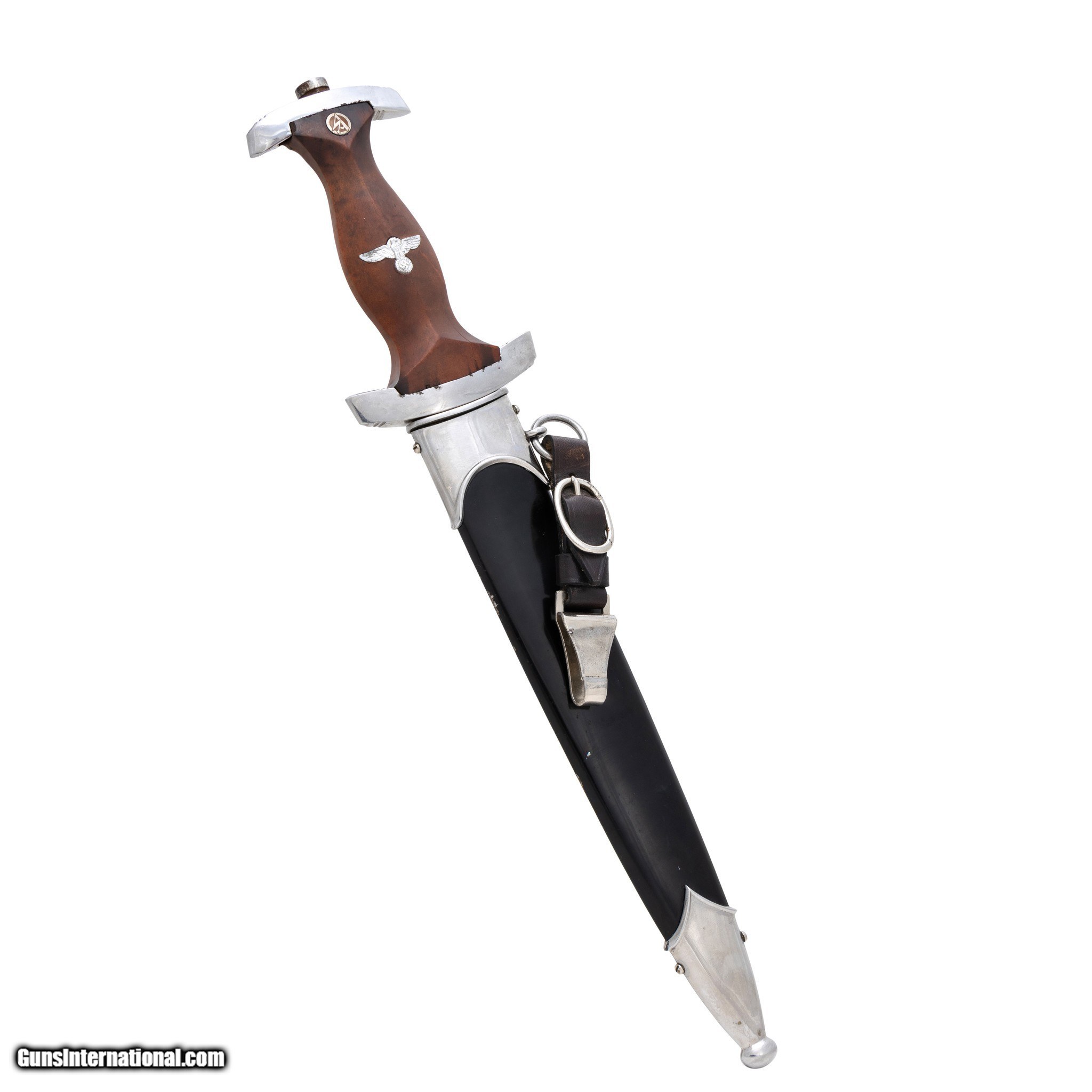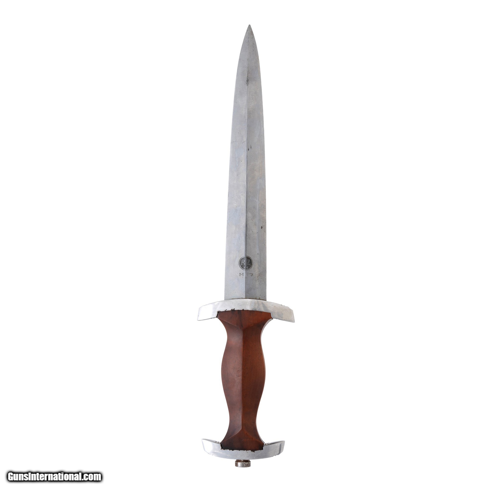 Description: This SA dagger features an RZM trademark produced by the F.U.A. Helbig, Steinbach (RZM M7/73) firm. Nickel plated fitting on the cross guards exhibiting contact marks and wear where it butts the wooden handle, along with the rim of the pommel itself. Medium brown wood handle with aluminum eagle. Good condition with few minor cracks and black staining on the handle where it meets the cross guards. Scabbard is in excellent shape and free of dents. Circa 1940. Size: 8 3/4" blade, overall 14" Family Owned & Operated Cisco’s Gallery deals in the rare, exceptional, and one-of-a-kind pieces that define the history of America and the Old West. Our pieces range from American Indian to Cowboy Western and include original items of everyday life, commerce, art, and warfare that tamed America’s frontier. Our 14,000 square foot gallery opened in 1996 in beautiful Coeur d’Alene, Idaho. Personal Service Cisco’s operates on old fashioned values – honesty and integrity, and all of our items are backed by our money back guarantee. We appreciate the opportunity to earn your business. Whether you desire assistance with a jewelry purchase, choosing a gift, identification, or even selling – we hope to be your trusted source. SOLD |