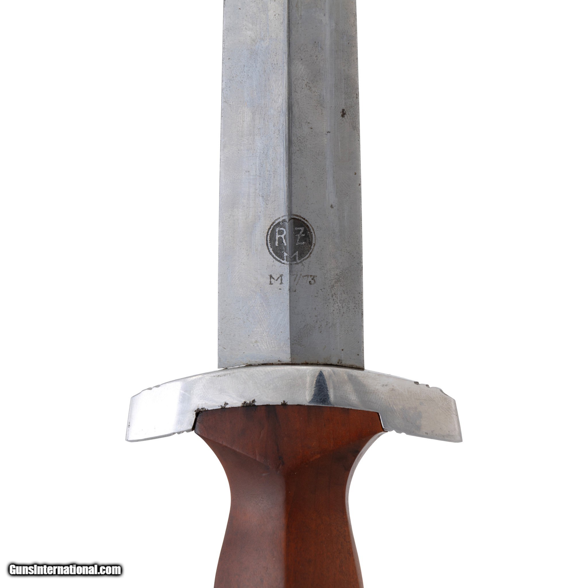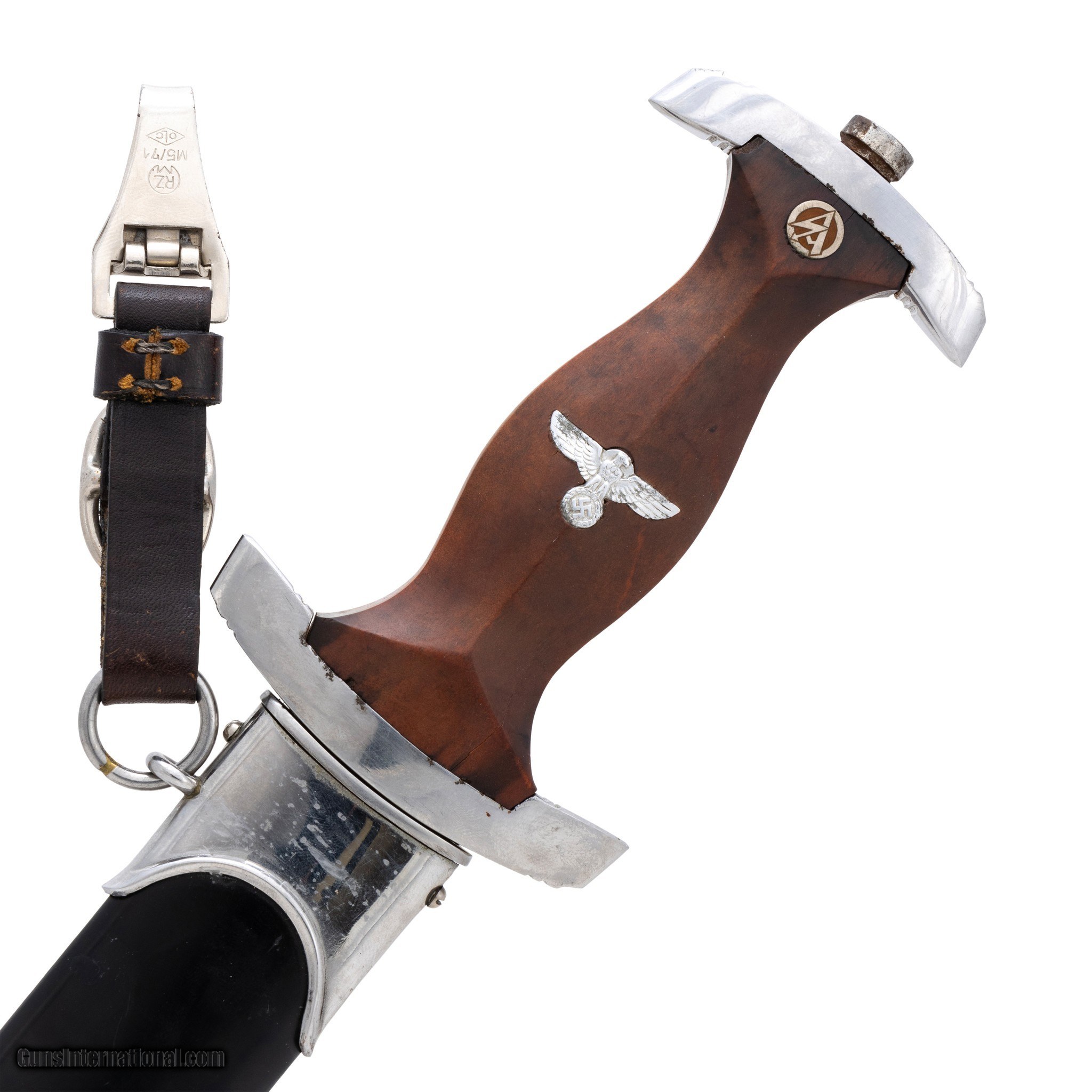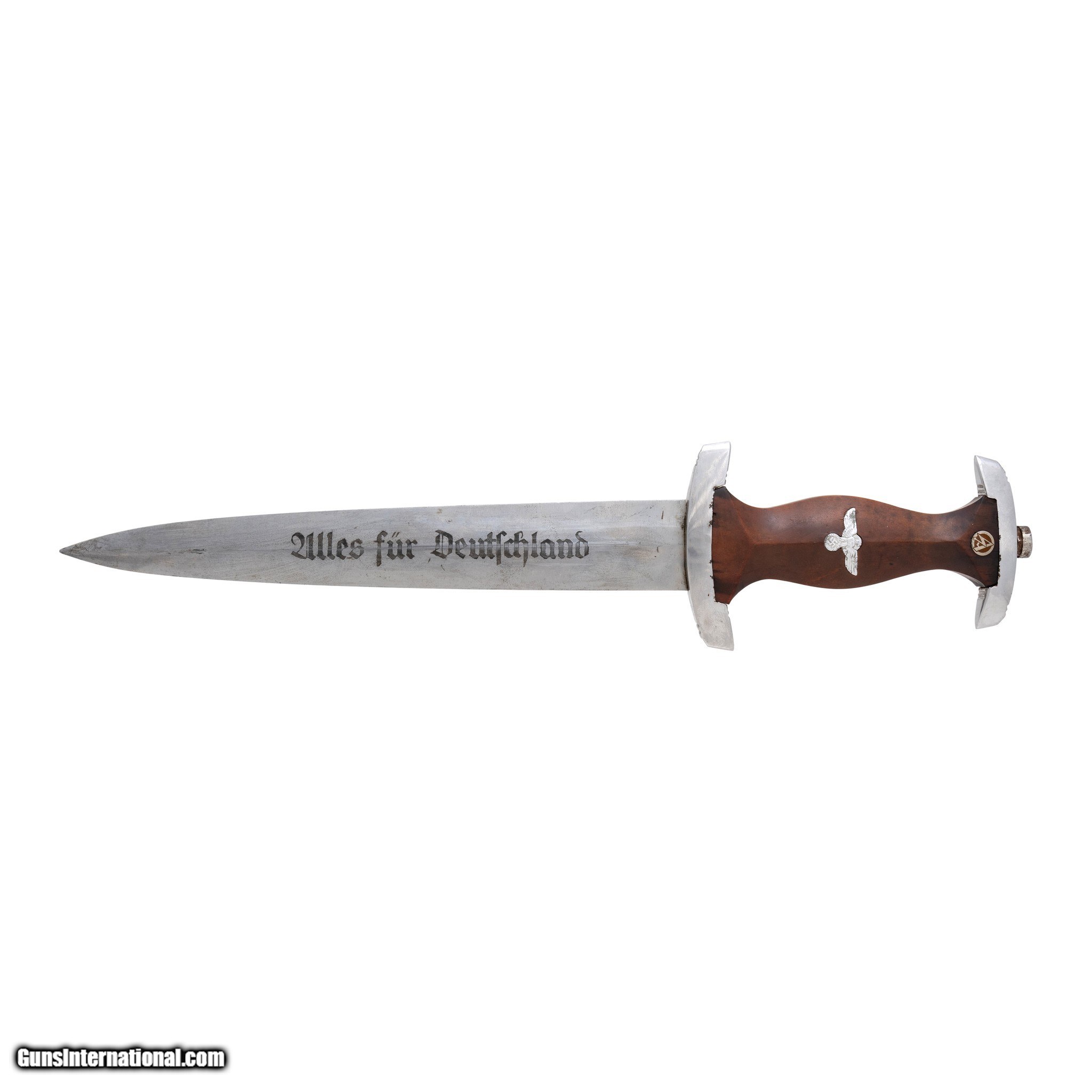 Description: This SA dagger features an RZM trademark produced by the F.U.A. Helbig, Steinbach (RZM M7/73) firm. Nickel plated fitting on the cross guards exhibiting contact marks and wear where it butts the wooden handle, along with the rim of the pommel itself. Medium brown wood handle with aluminum eagle. Good condition with few minor cracks and black staining on the handle where it meets the cross guards. Scabbard is in excellent shape and free of dents. Circa 1940. Size: 8 3/4" blade, overall 14" Family Owned & Operated Cisco’s Gallery deals in the rare, exceptional, and one-of-a-kind pieces that define the history of America and the Old West. Our pieces range from American Indian to Cowboy Western and include original items of everyday life, commerce, art, and warfare that tamed America’s frontier. Our 14,000 square foot gallery opened in 1996 in beautiful Coeur d’Alene, Idaho. Personal Service Cisco’s operates on old fashioned values – honesty and integrity, and all of our items are backed by our money back guarantee. We appreciate the opportunity to earn your business. Whether you desire assistance with a jewelry purchase, choosing a gift, identification, or even selling – we hope to be your trusted source. SOLD |