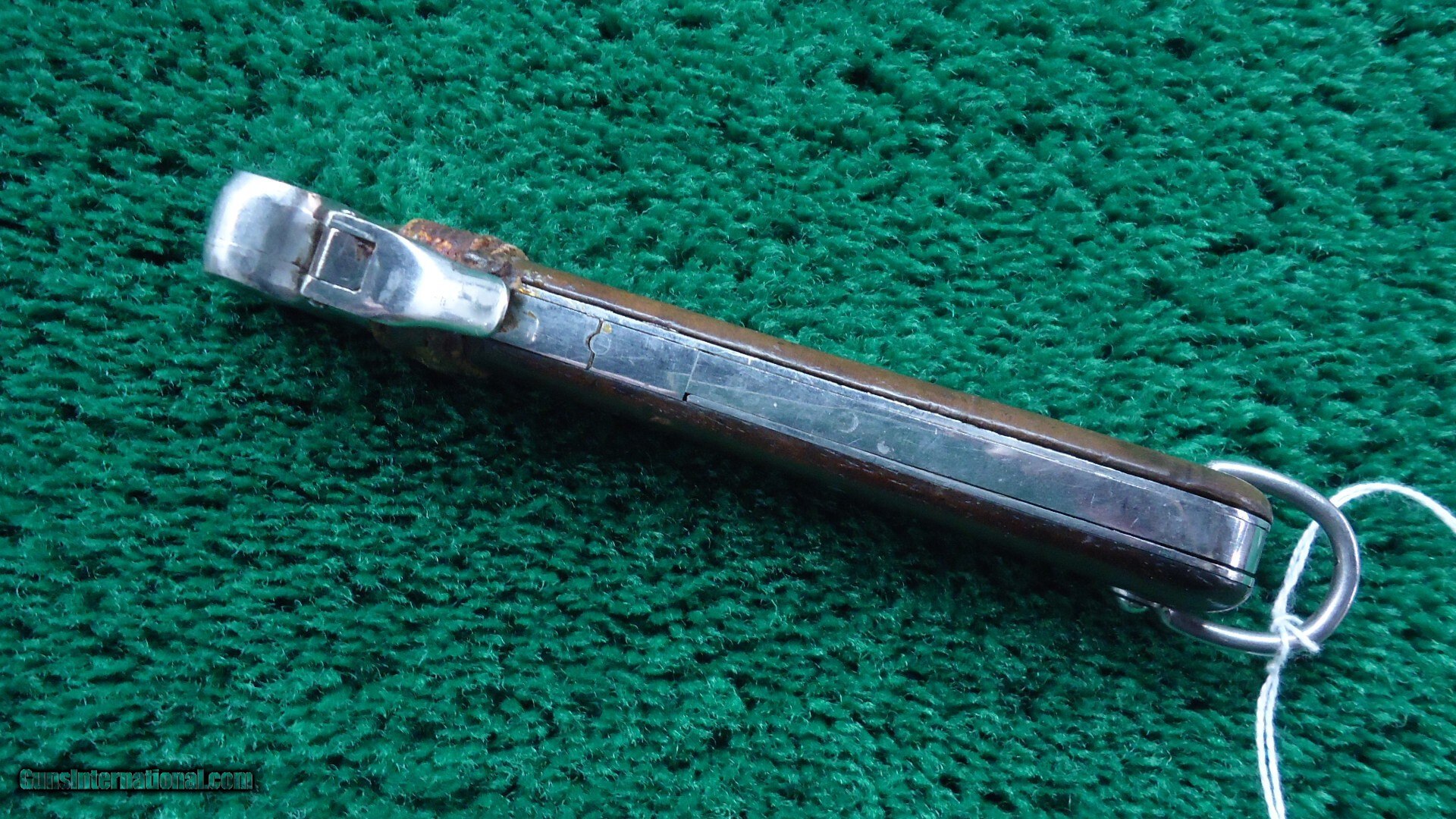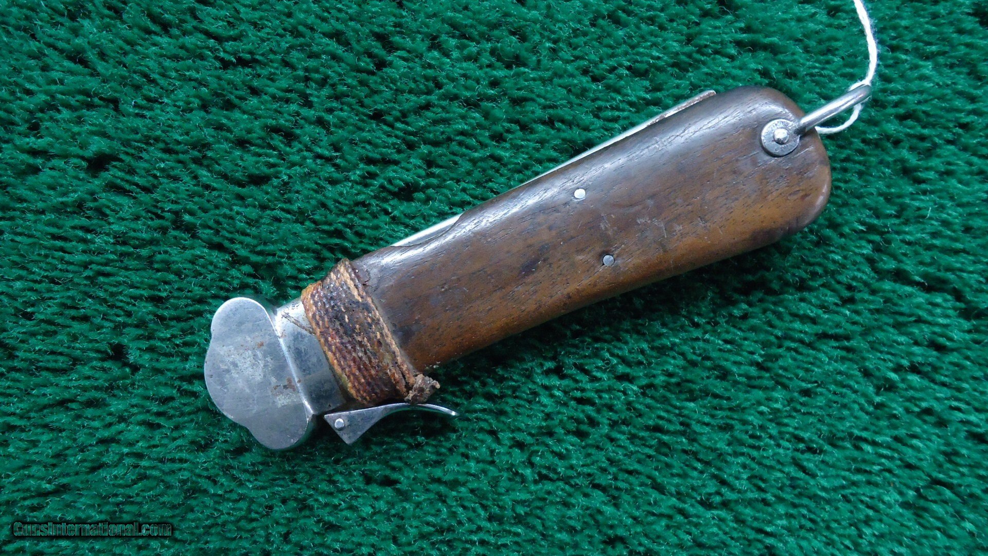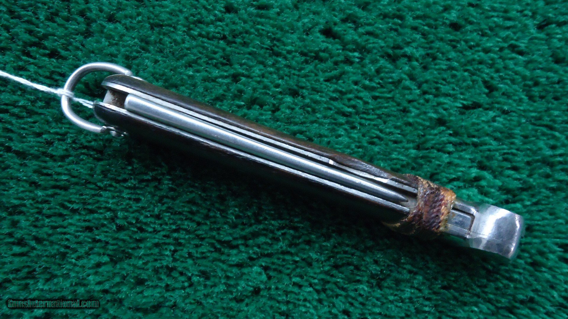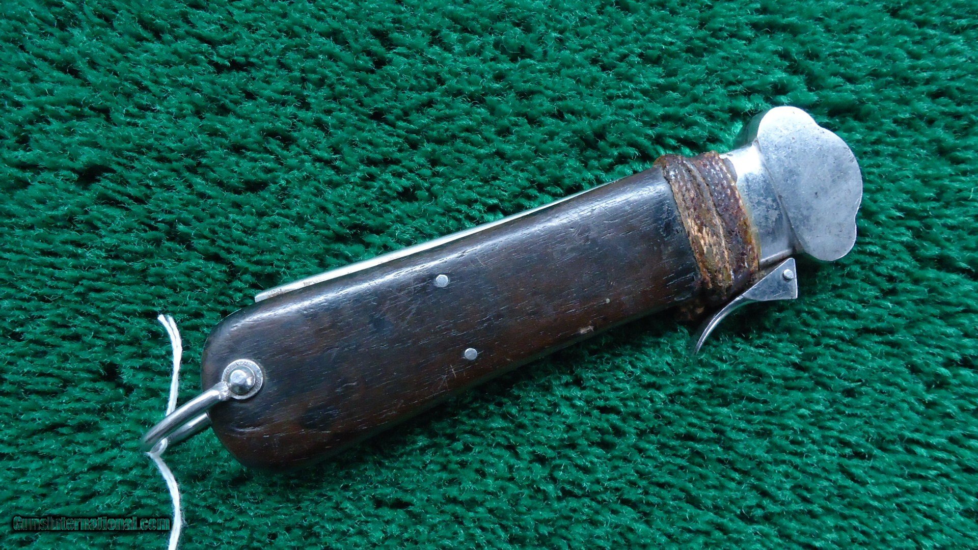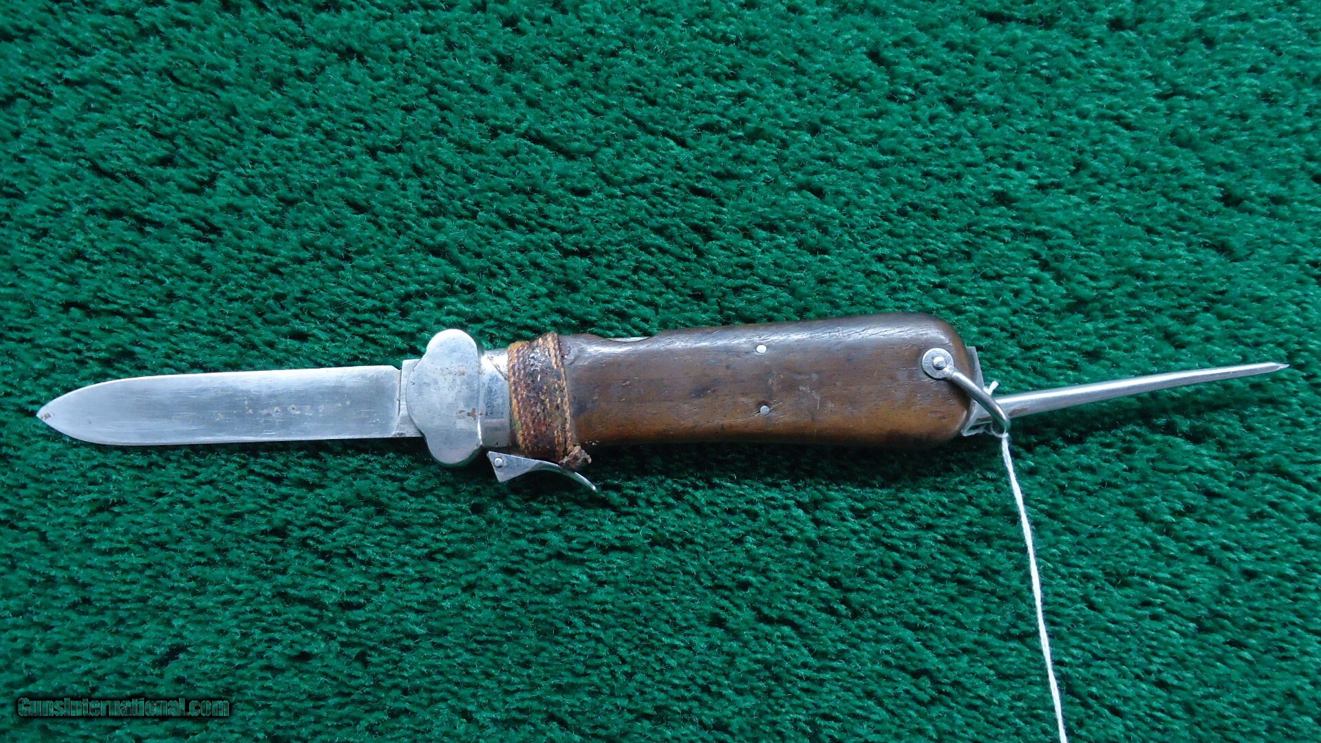Description: Paul Weyersberg & Co. maker's mark stamp and the Solingen mark. Blade length 4 inches, spike is 3-1/2 inches and an overall length 10 inches. Some cordage is wrapped near the top. This knife is in good condition except the blade will not lock in place. Leroy Merz Antique Firearms specializes in antique and vintage Winchesters and other fine American firearms. Since 1965 Mr. Merz has taken part in the world of firearms and has been a contributor to many well known reference books. We have hundreds of additional guns in every price range at our home online. Search for Merz Antiques in google. Price: $800.00 Contact Seller |
