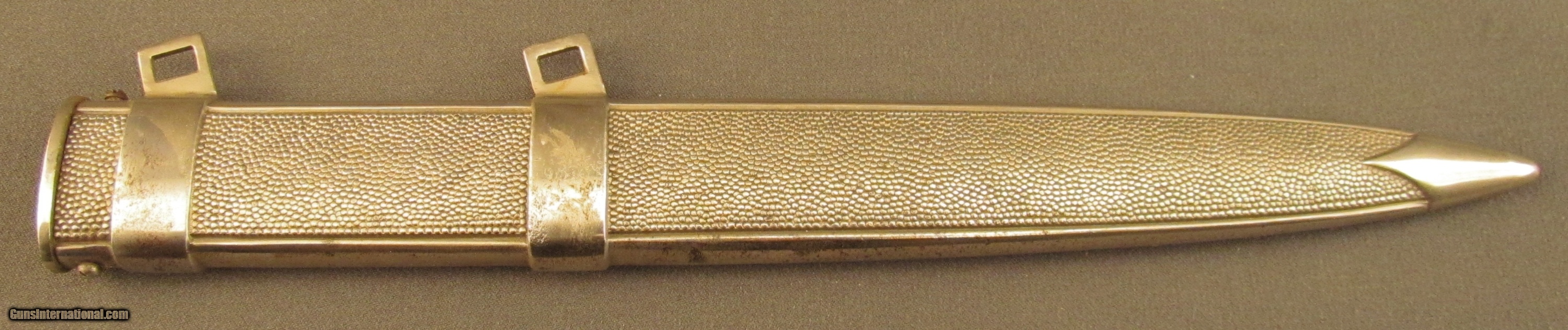 Description: Very good representative leader's dagger. Bright, very good blade with spotted light pitting (staining). The cross grain can still be seen and original tip. The original washer is in place. Original finish on crossguard and pommel. Some loss on the top edge of the pommel and retraining nut. The scabbard shows most of its original finish with minor loss mostly on the hanger bands. There is a small opening on the loading edge of the scabbard 3/16" long and some denting for 5/8" ahead of the hole. Otherwise the scabbard is very sound with a very good appearance. The orange grips are complete accept for a 1/2" chip in the base of the pommel and the top of the crossguard. SOLD Manufacturer: German Model: Knife |