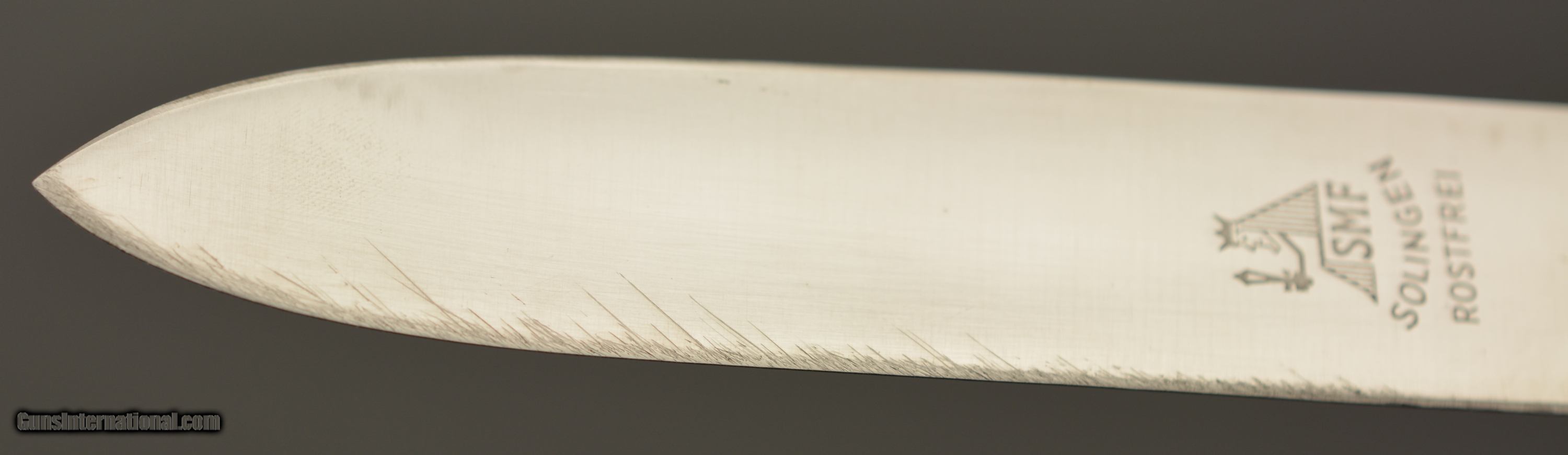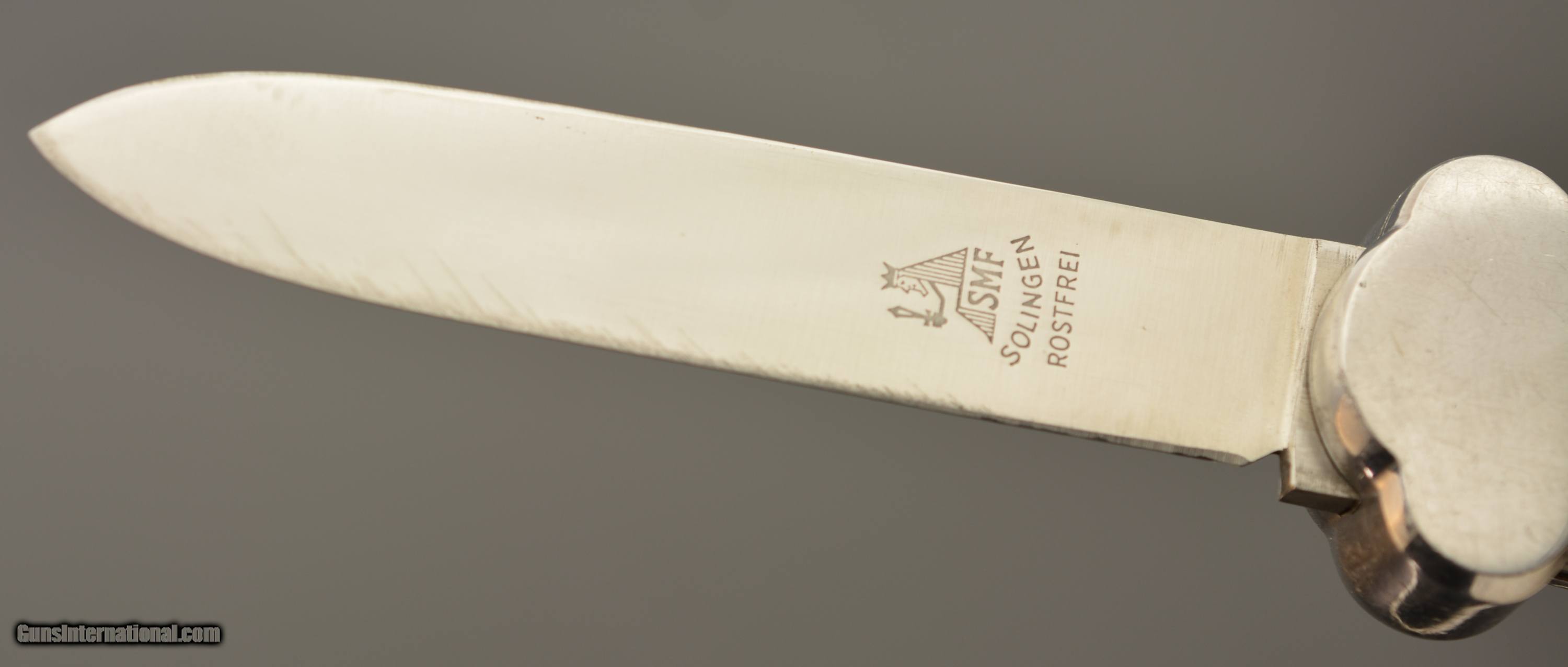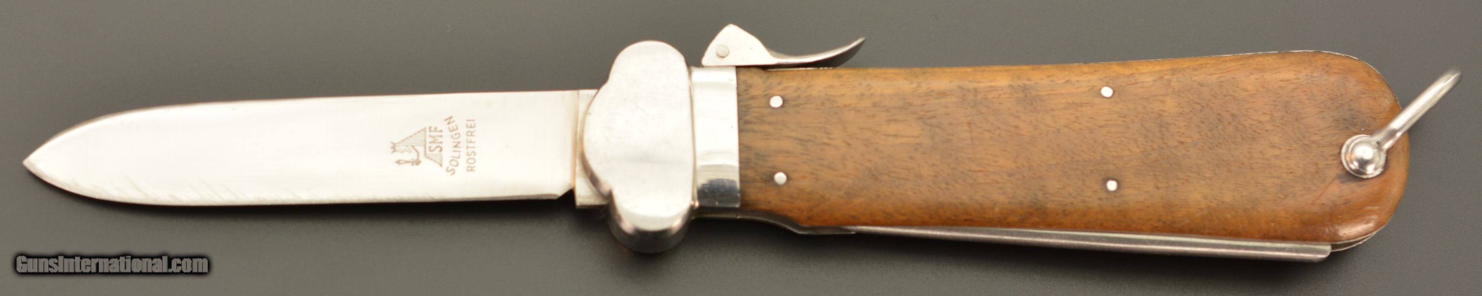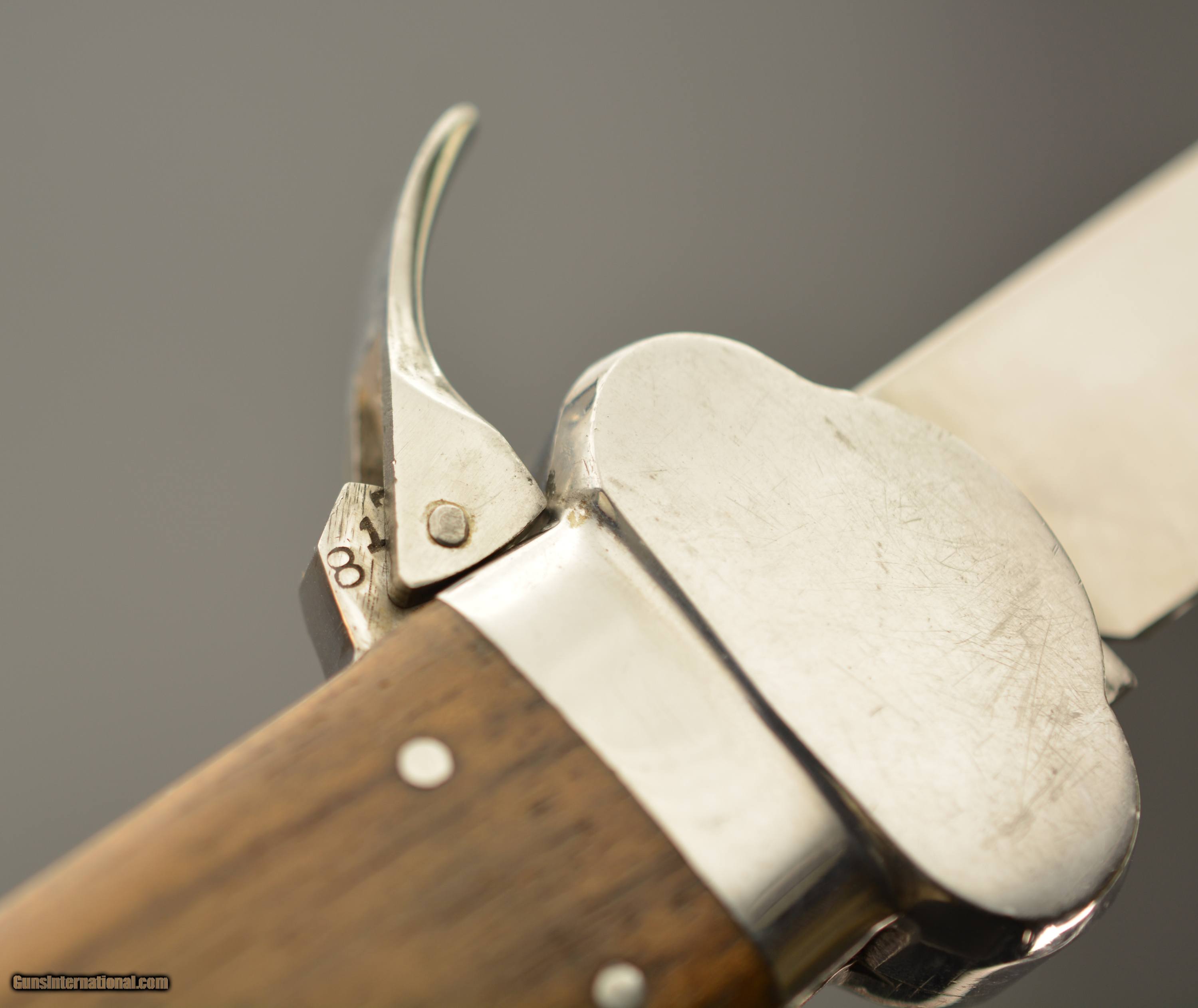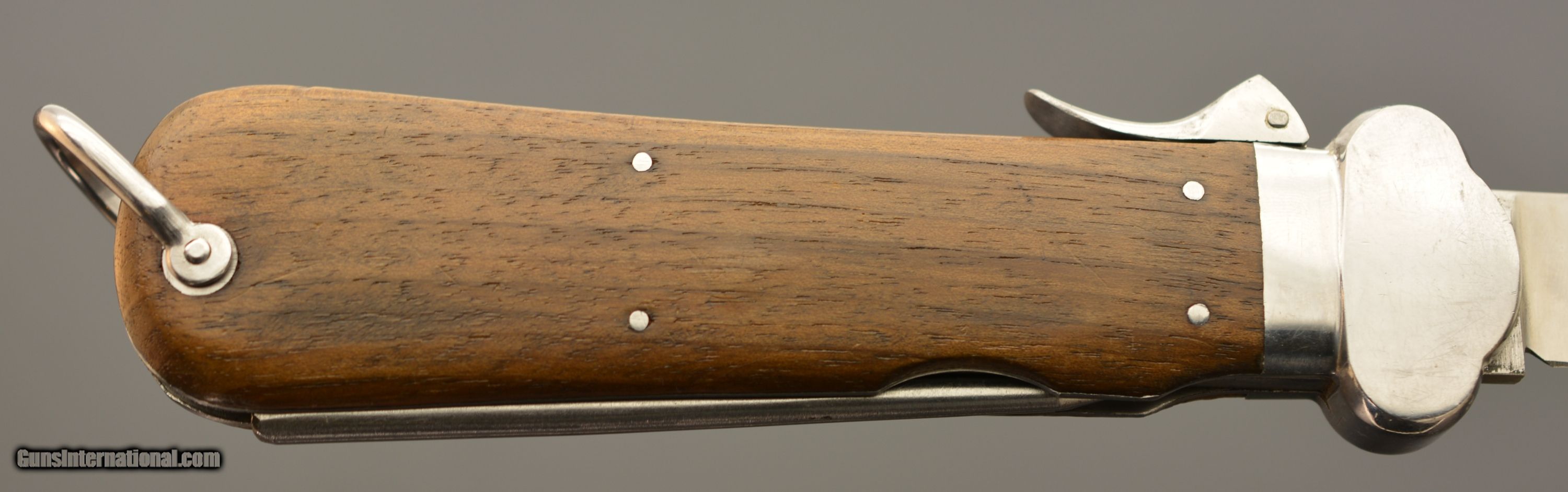 Description: Serial #817. This knife measures 10 1/8" overall (with blade extended) and has a 4" single-edged “ROSTFREI" stainless blade with the SMF “Sitting King" trademark on the obverse face. The steel is in nearly excellent condition overall with only minor scratches and scuffs, some mild sharpening marks along the edge, as well as matching serial numbers on the retention spring and on the thumb-latch. The folding awl has a clear and crisp “(eagle)/L 5" Luftwaffe inspection proof at the base and otherwise matches the condition of the rest of the metal perfectly. The wooden grip panels are in fine shape and have several minor handling marks in the original oil finish on either side. This is an extremely nice Luftwaffe gravity knife, and rates excellent condition overall. SOLD Manufacturer: SMF Model: Gravity Knife Serial Number: 817 |