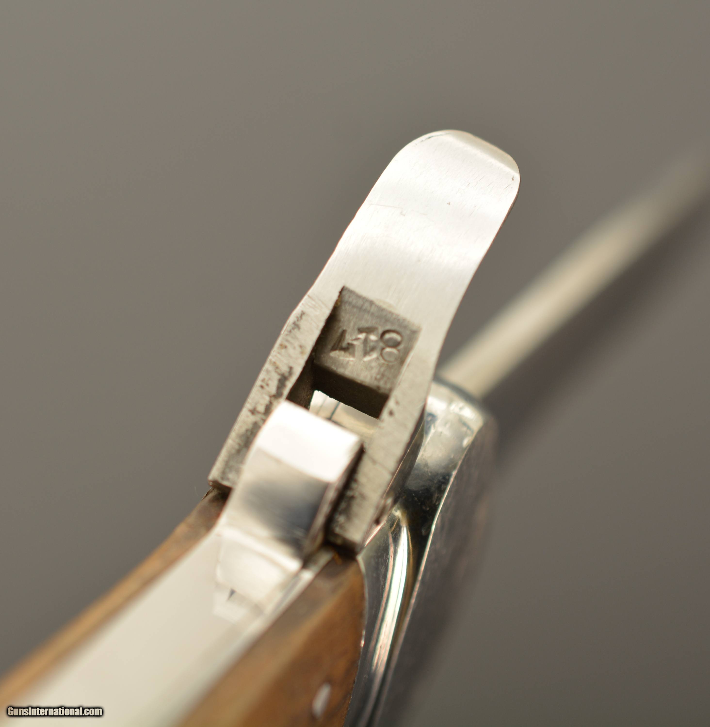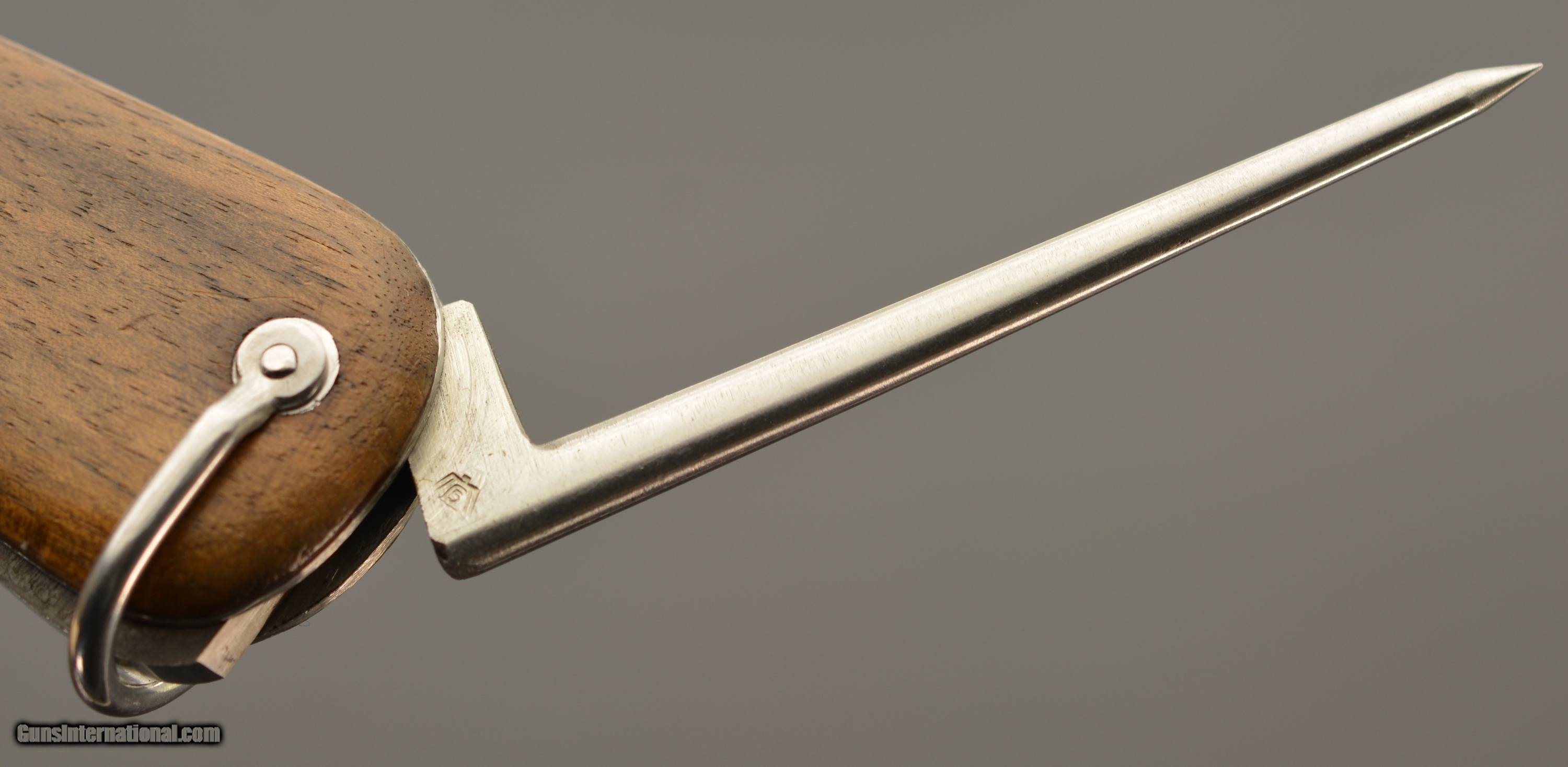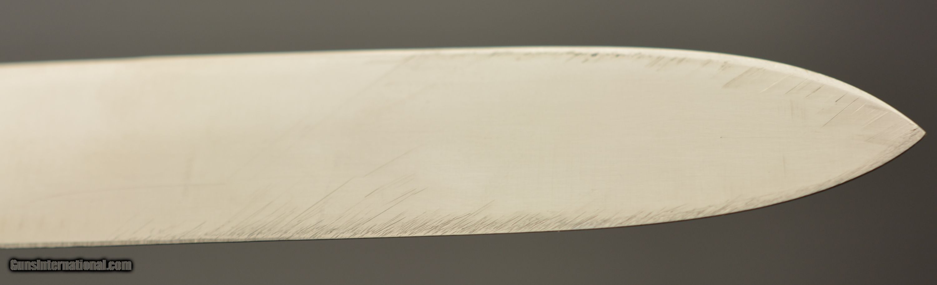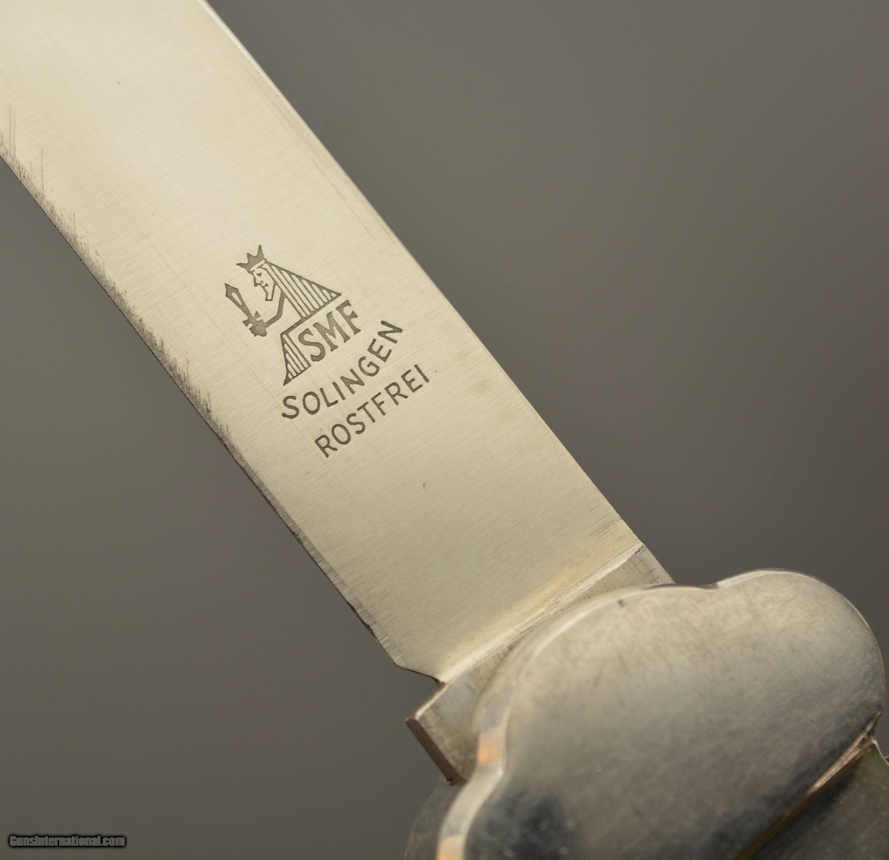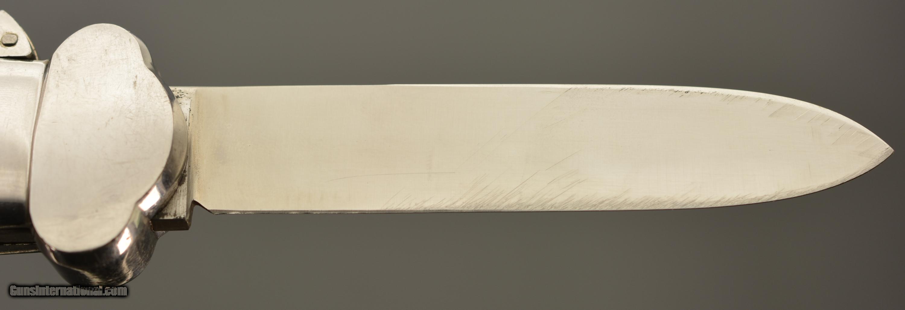 Description: Serial #817. This knife measures 10 1/8" overall (with blade extended) and has a 4" single-edged “ROSTFREI" stainless blade with the SMF “Sitting King" trademark on the obverse face. The steel is in nearly excellent condition overall with only minor scratches and scuffs, some mild sharpening marks along the edge, as well as matching serial numbers on the retention spring and on the thumb-latch. The folding awl has a clear and crisp “(eagle)/L 5" Luftwaffe inspection proof at the base and otherwise matches the condition of the rest of the metal perfectly. The wooden grip panels are in fine shape and have several minor handling marks in the original oil finish on either side. This is an extremely nice Luftwaffe gravity knife, and rates excellent condition overall. SOLD Manufacturer: SMF Model: Gravity Knife Serial Number: 817 |