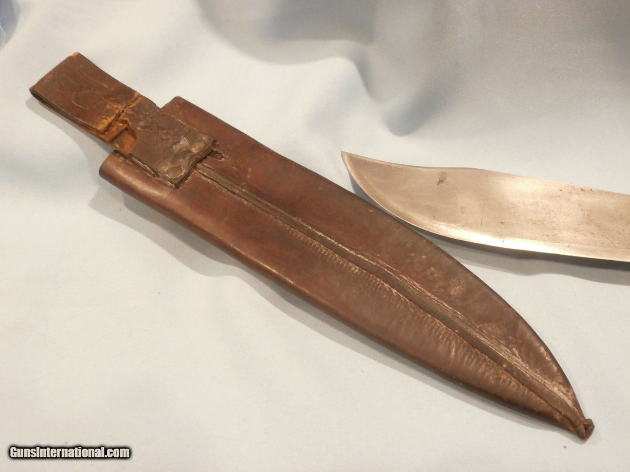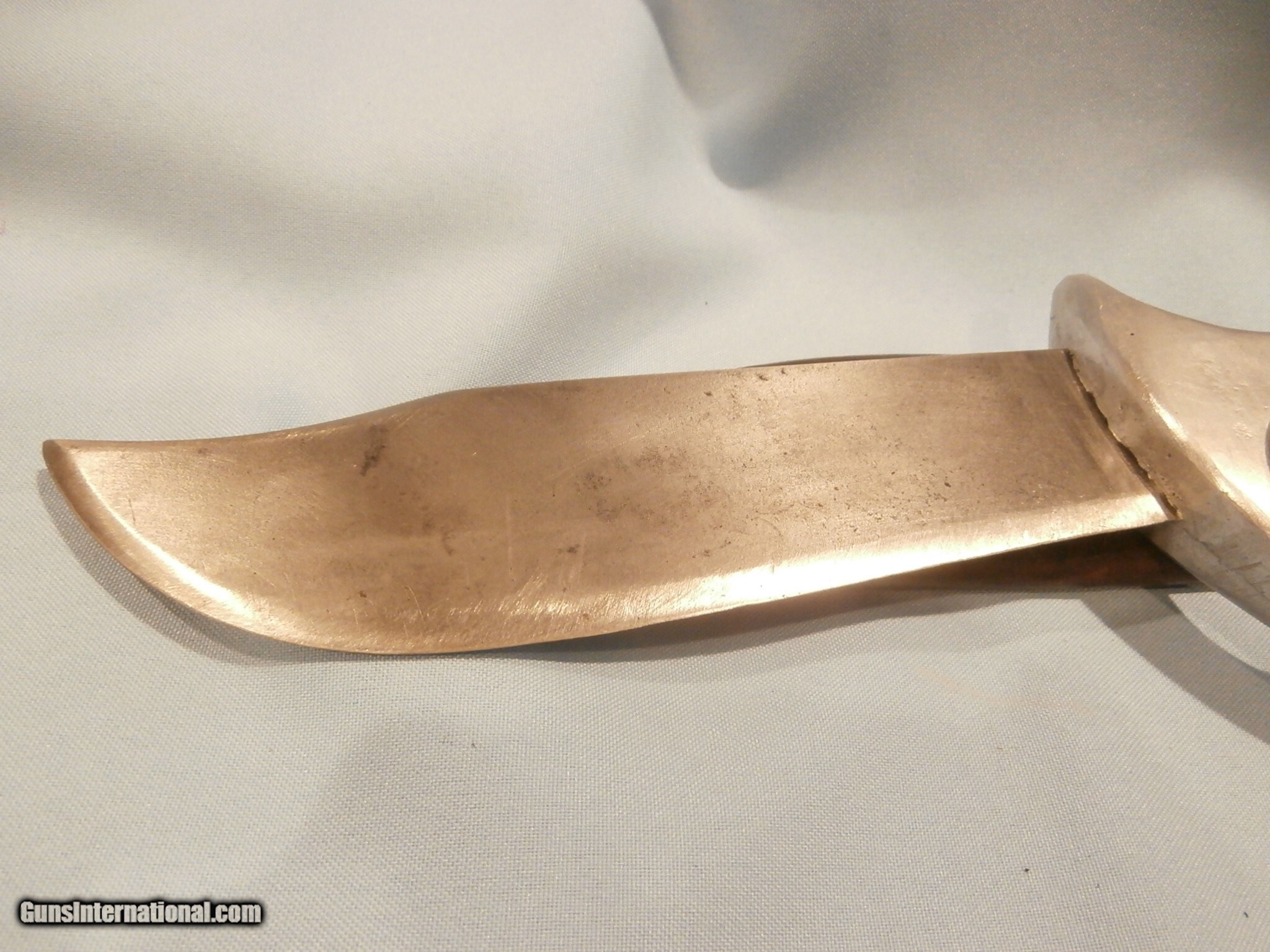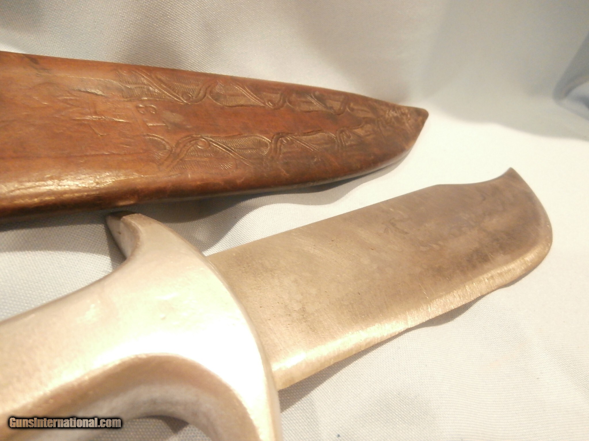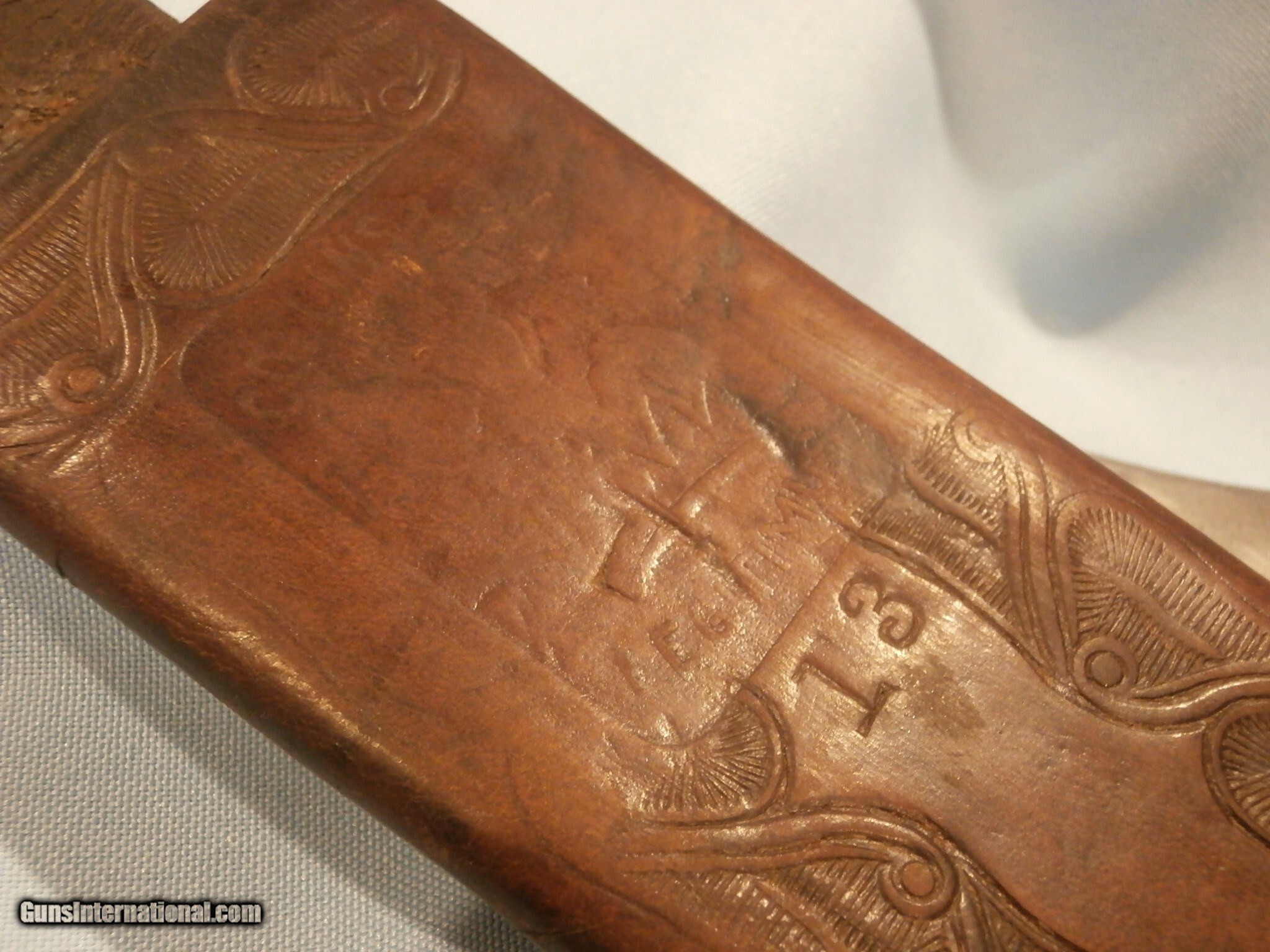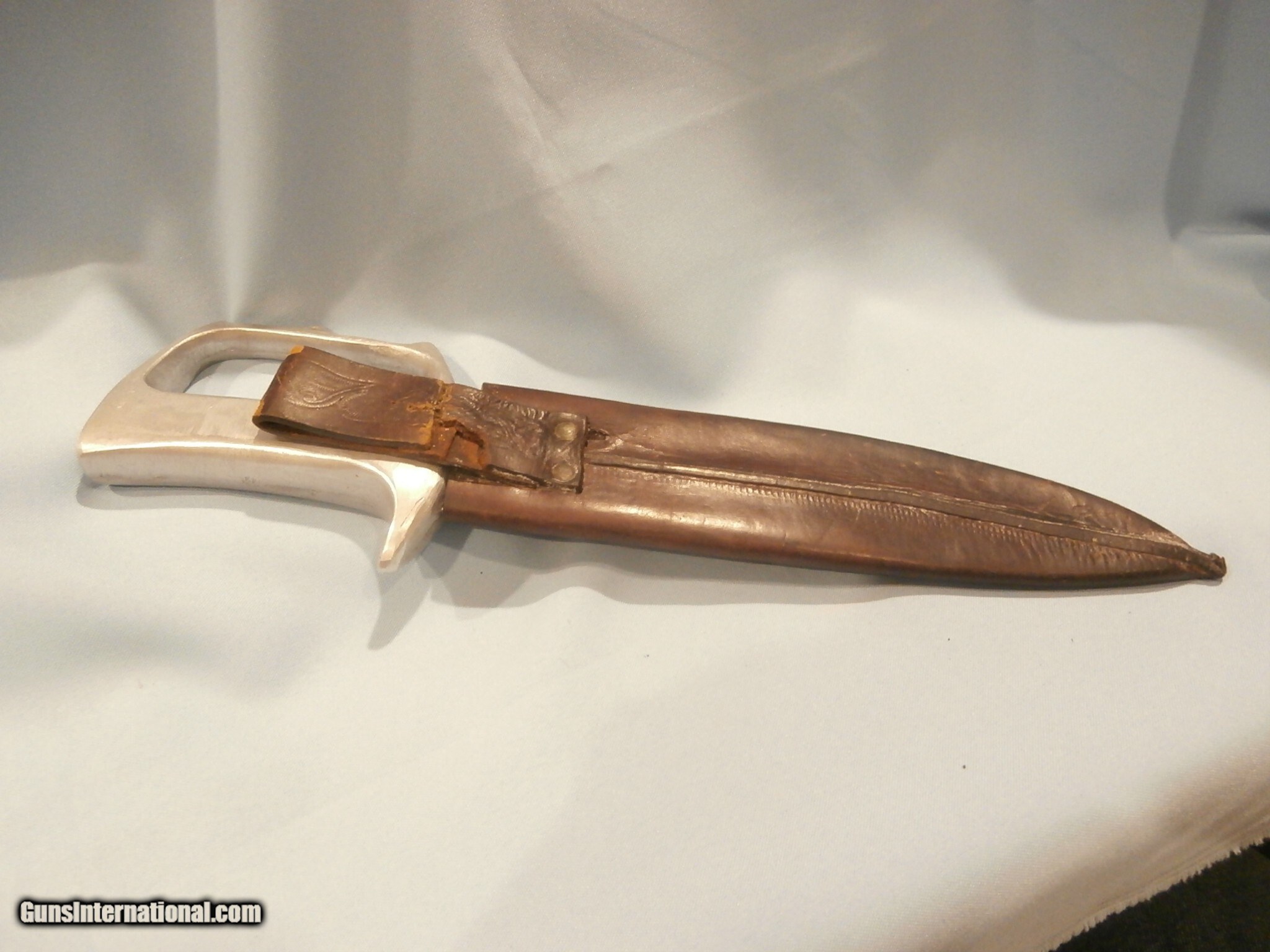 Description: WWII AUSTRALIAN D-GUARD 3-POINT RANGER BOWIE. 8" X 2 3/16" EXTRA-WIDE, CLIP-POINT BOWIE BLADE IN VERY-GOOD-PLUS FINISH!!...SEE ALL PICS. 2 3/4" TOP-EDGE...SEE PICS. 12 5/8" OVERALL LENGTH...SEE PICS. BLADE EDGES AND TIP ALL REMAIN SHARP!!...SEE PICS. HEAVY, SOLID, FINGER-GROOVE GRIP, WITH 3-POINT, D GUARD...SEE ALL PICS. COLLINS No. 13 SCABBARD SHOWS REPAIR TO REAR BELT-LOOP...SEE PICS. SEE SILVEY WWII KNIVES P.72 FOR REFERENCE. Price: $949.95 Contact Seller |