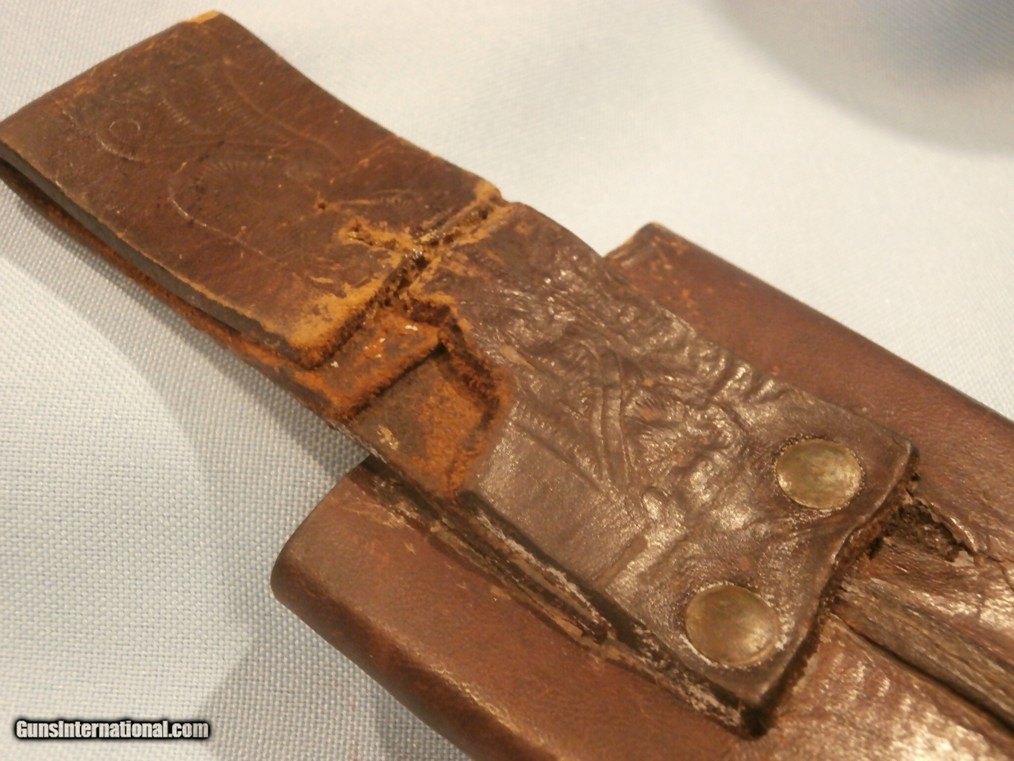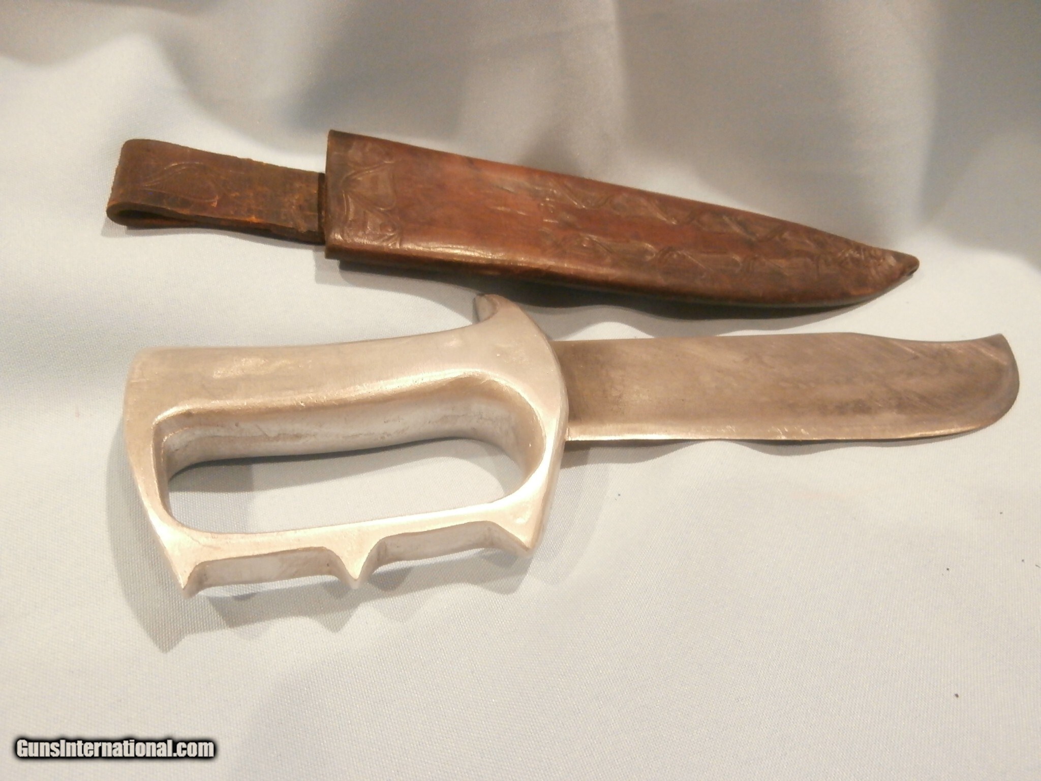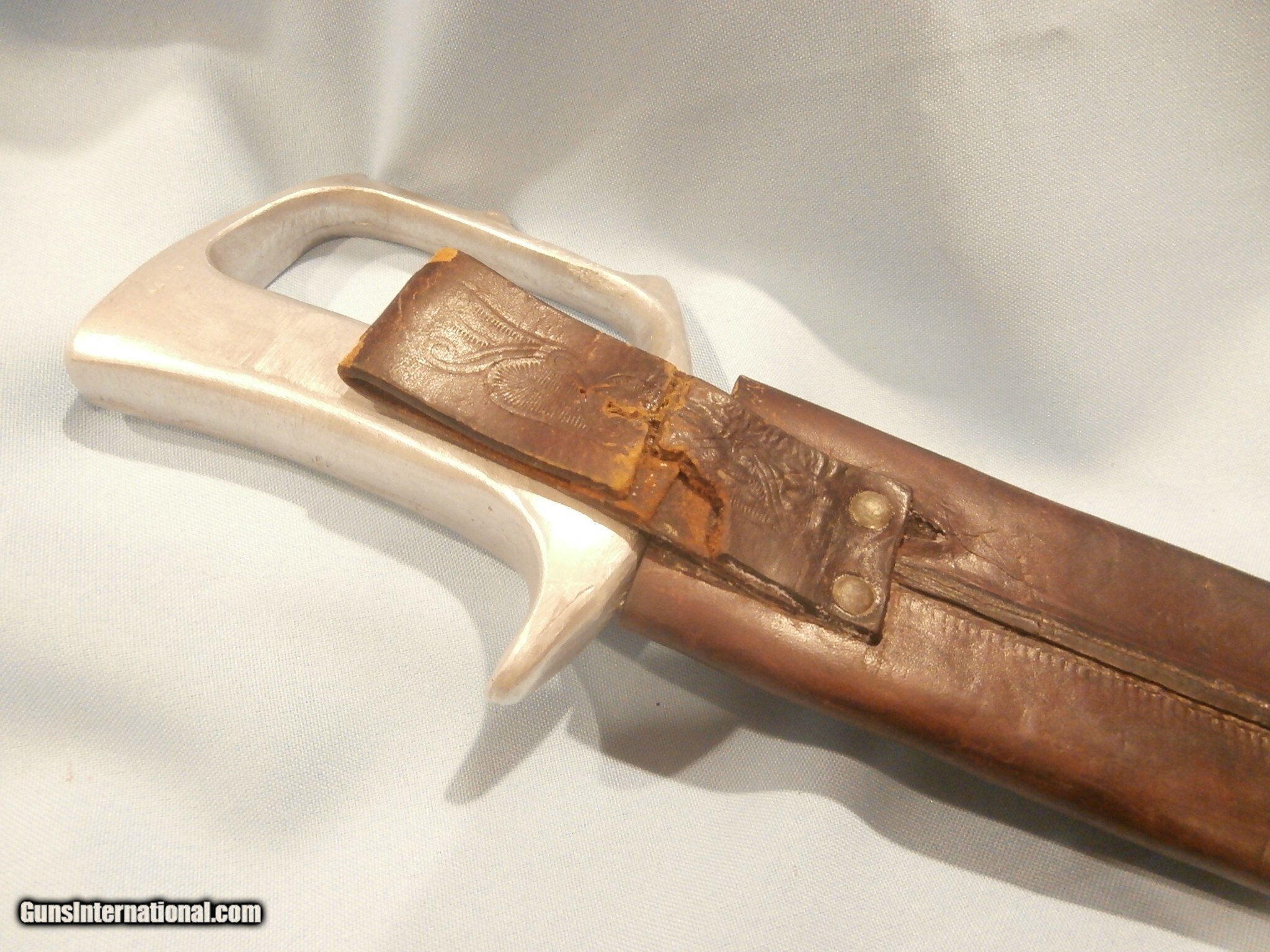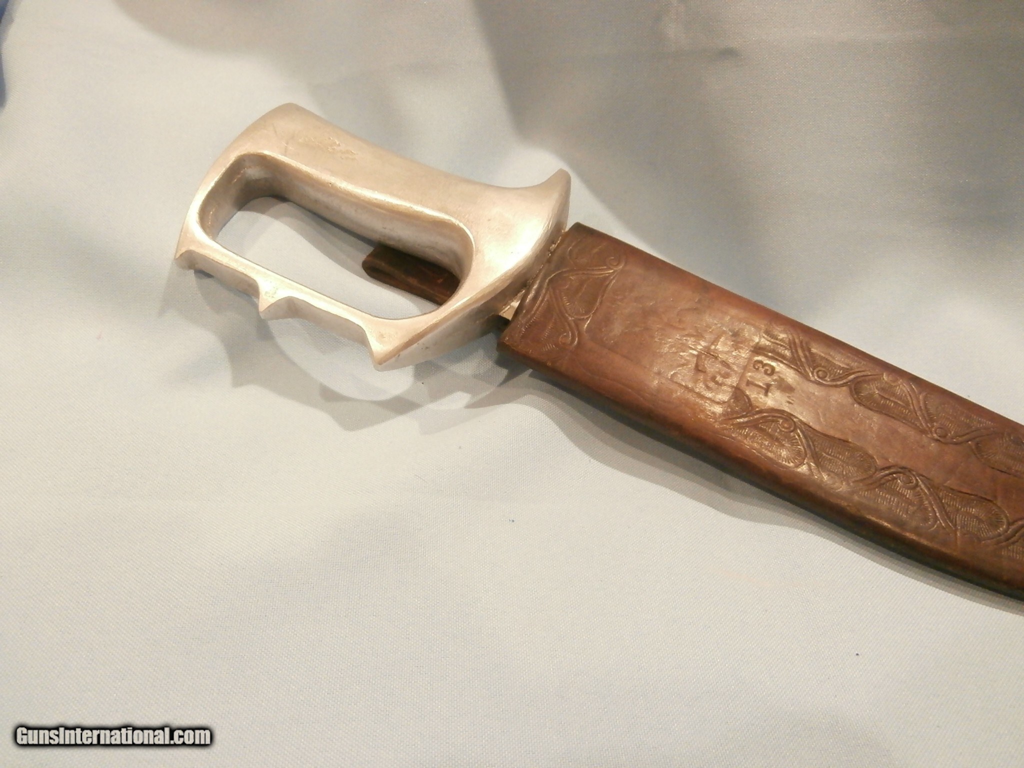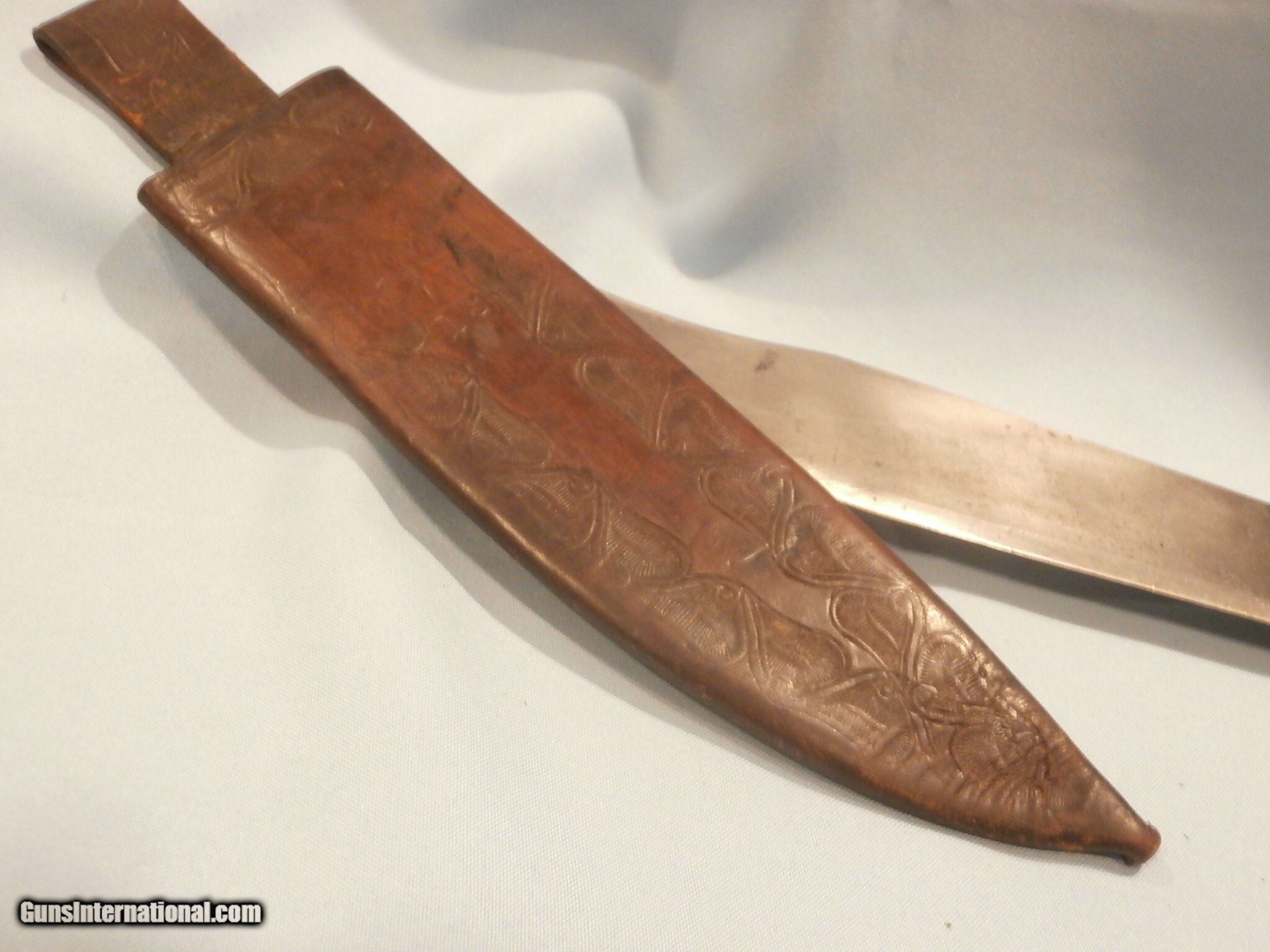 Description: WWII AUSTRALIAN D-GUARD 3-POINT RANGER BOWIE. 8" X 2 3/16" EXTRA-WIDE, CLIP-POINT BOWIE BLADE IN VERY-GOOD-PLUS FINISH!!...SEE ALL PICS. 2 3/4" TOP-EDGE...SEE PICS. 12 5/8" OVERALL LENGTH...SEE PICS. BLADE EDGES AND TIP ALL REMAIN SHARP!!...SEE PICS. HEAVY, SOLID, FINGER-GROOVE GRIP, WITH 3-POINT, D GUARD...SEE ALL PICS. COLLINS No. 13 SCABBARD SHOWS REPAIR TO REAR BELT-LOOP...SEE PICS. SEE SILVEY WWII KNIVES P.72 FOR REFERENCE. Price: $949.95 Contact Seller |