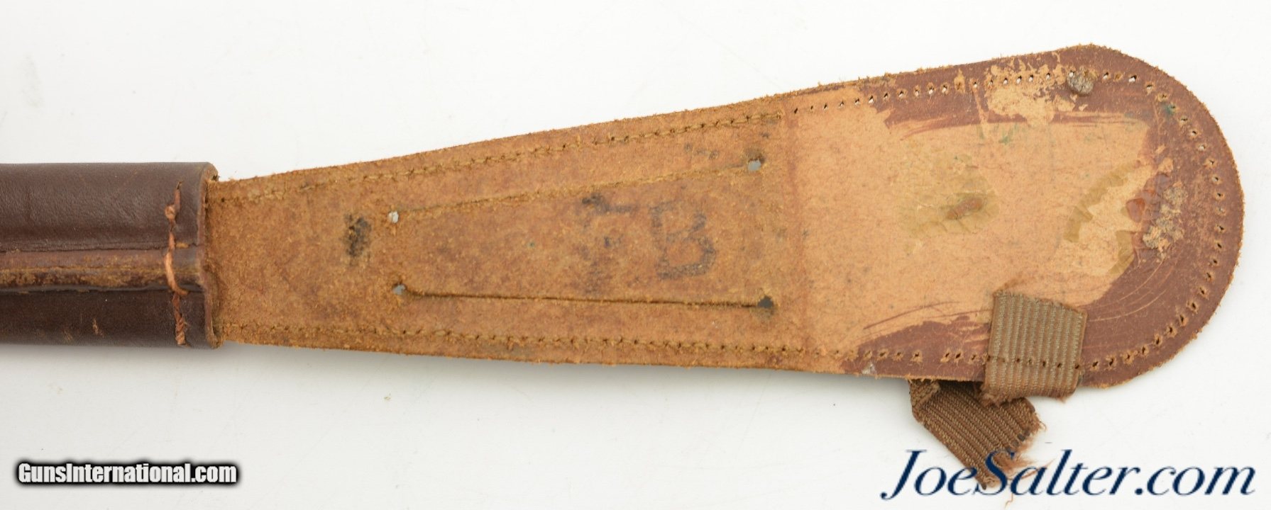 Description: This is a WWII Fairbairn-Sykes Third Pattern British Commando Knife with war Sheath. The blade is machined and retains most of the original finish with light surface oxidation and no nicks with a nice tip. This knife was carried and used as seen from the blade and use of the sheath. The guard is stamped ENGLAND for import and has light oxidation were it meets the blade. The cast handle is a #3 casting, marked with Broad Arrow B2 and ends in the correct brass nut, a touch of the finish is missing on the handle. The sheath is leather is in very good condition with the no tabs, stamped ENGLAND, elastic broke. This example is round at the end of the chape. Blade length 6 1/2" with OAL of 11 1/4". SOLD |