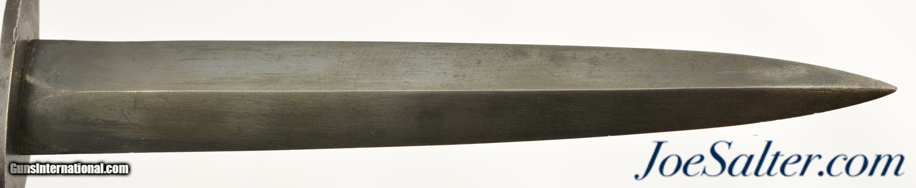 Description: This is a WWII Fairbairn-Sykes Third Pattern British Commando Knife with war Sheath. The blade is machined and retains most of the original finish with light surface oxidation and a few tiny nicks on one edge with a nice tip. This knife was carried and used as seen from the blade and use of the sheath. The guard is stamped ENGLAND for import and has light oxidation were it meets the blade. The cast handle is a #2 casting, marked with Broad Arrow over I and ends in the correct brass nut. The sheath is leather is in very good condition with the correct tabs. This example is open at the toe of the chape. Blade length 6 3/4" with OAL of 11 3/8". Over-all and excellent example of a classic knife. SOLD |