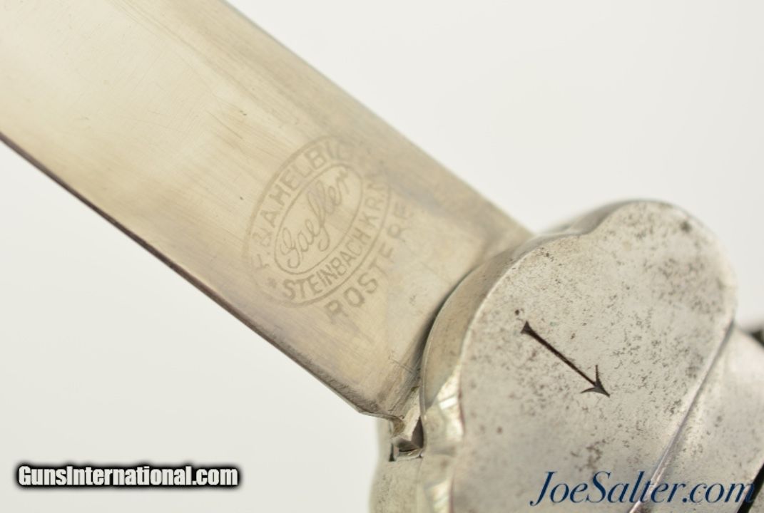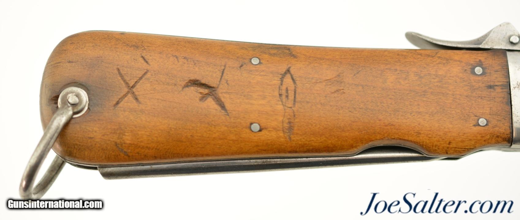 Description: This is a Type II LW gravity Flieger-Kappmesser/Paratrooper Knife comprised of the blade, a fine stainless steel "ROSTFREI" 4 1/8 inch cutting blade SN# 6875 which was manufactured from 1938 to 1940 by the knife maker F&A Helbig Garfler Steinbach Kr.M which only produced Type I knives. According to Bruning’s book only 2100 of these Helbig knives where made. The body of this knife was manufactured by SMF, Metall Warenfabrik and is a Type IIA. This example is in vey good to excellent original condition with very good makers marks with matching frame #286 and bolster and correct R.B NR 0561/0019 and #5 inspection mark, Solingen. This knives wooden scales are in very good condition with normal wear and some old etchings. The spike is excellent and has the original point. According to Pattarpzzi’s book, it is not uncommon to find parts from one maker on another makers knife. As we have on this knife the blade, which is original, is used on another original body. No way to tell when this was done, war time or later.; SOLD |