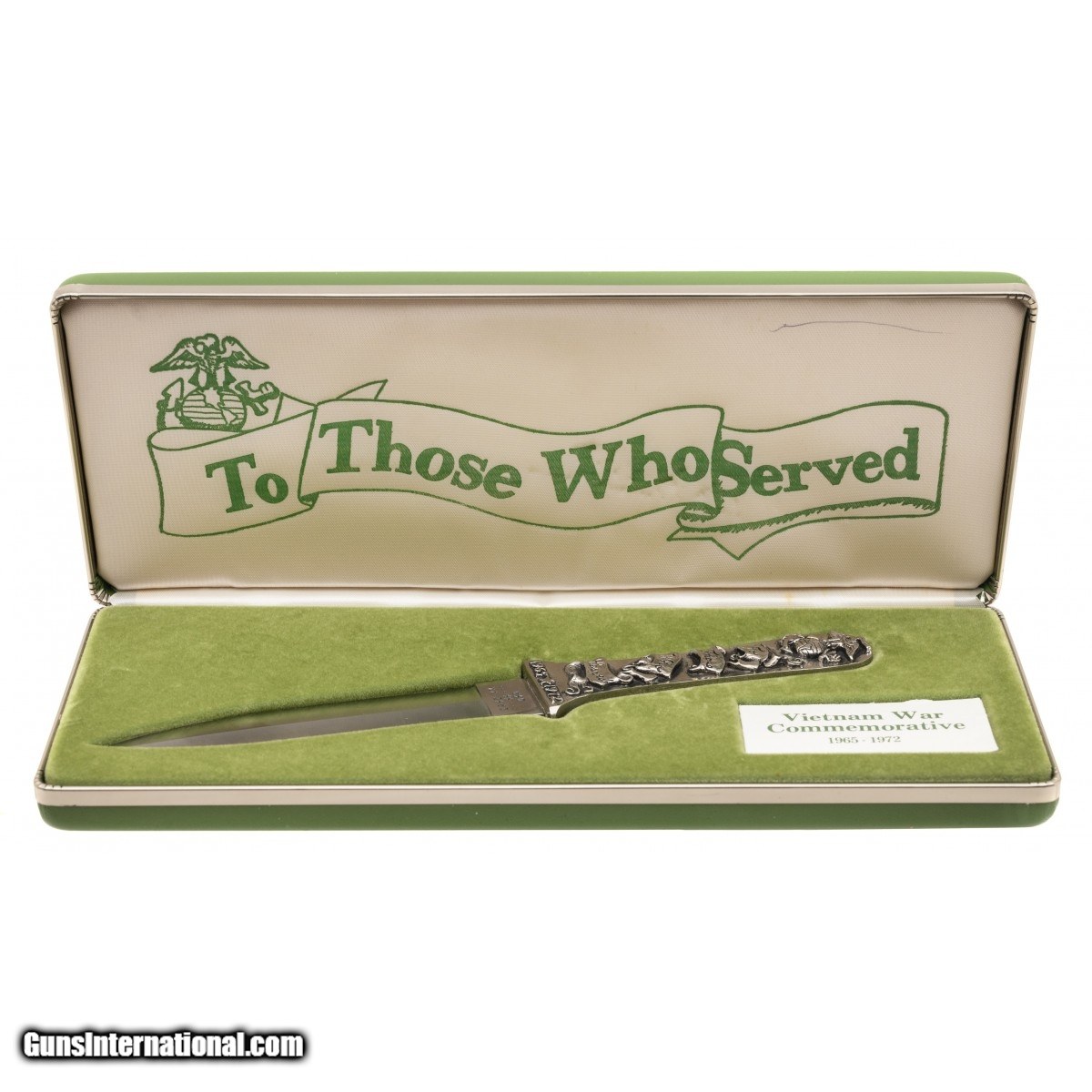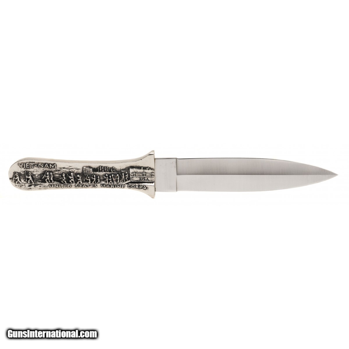 Description: " SN: 485. Made in 1980's. Stainless steel dagger commemorating Vietnam war with USMC insignia with decorative hard case. Excellent condition with display box. Consignment. SOLD |