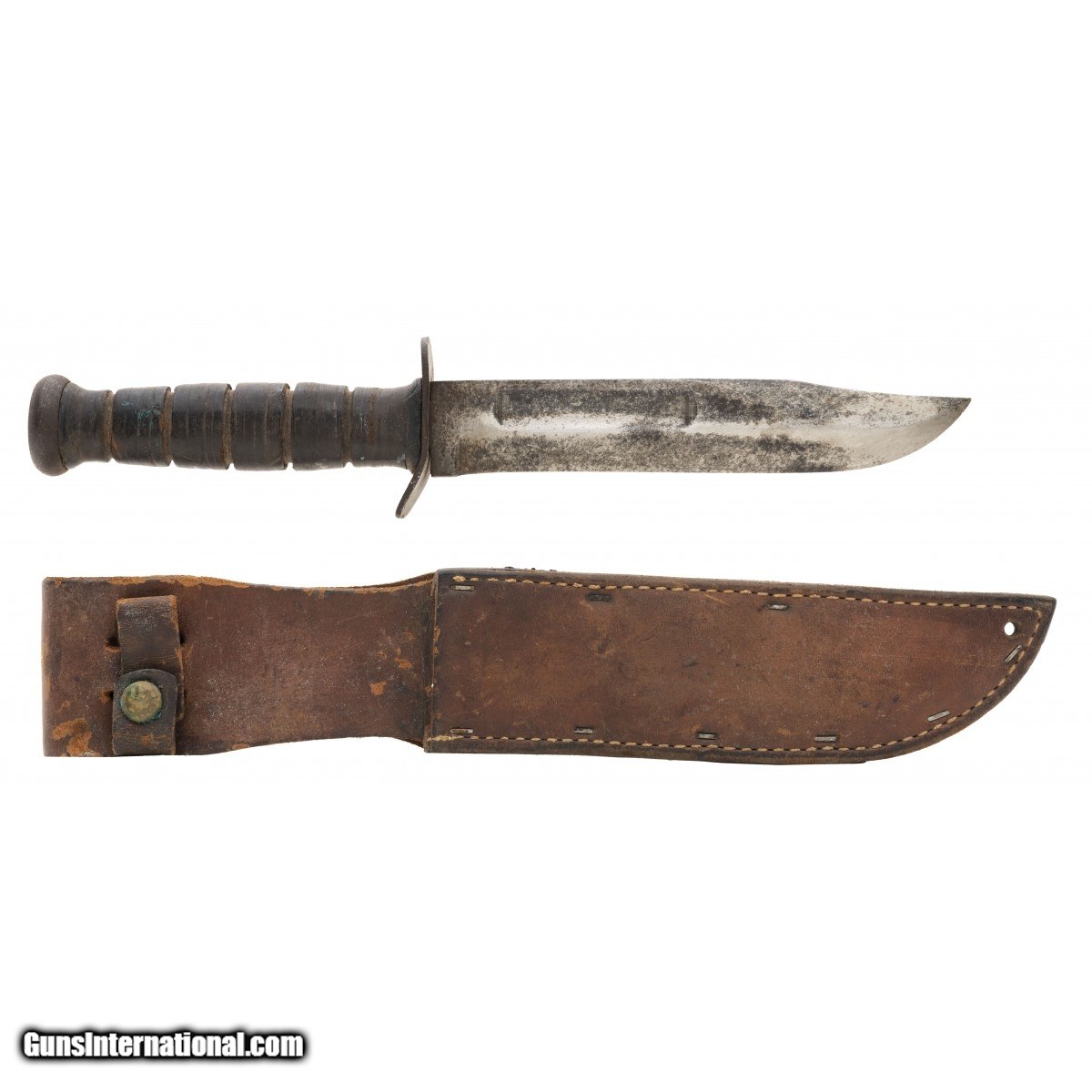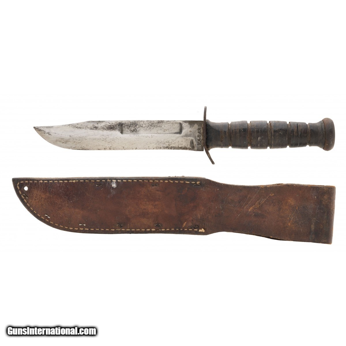 KA-BAR knife as used in WWII. Only marking is KA-BAR on blade and is dark Leather scabbard has staples and stitching and unmarked.