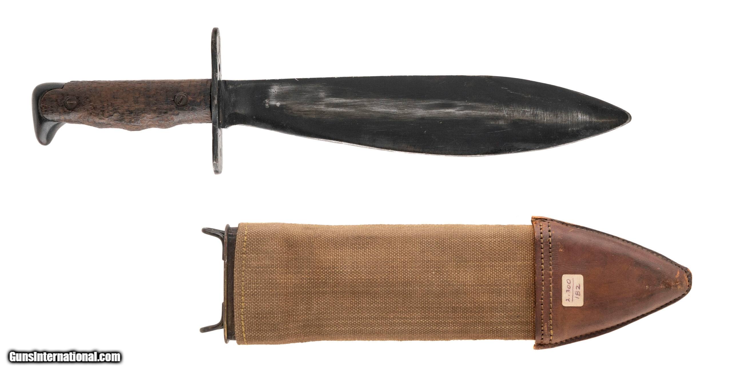 Description: "Original WW1 M1917 bolo knife made by Plumb in St. Louis in 1918 as the faded stamping on the ricasso originally read. The opposite side has a visible “USMC" stamp. 10" blade and 15" OAL with wood scales and an original Brauer Bros. 1918 marked canvas covered sheath with leather tip. Overall in good condition with normal wear. SOLD |