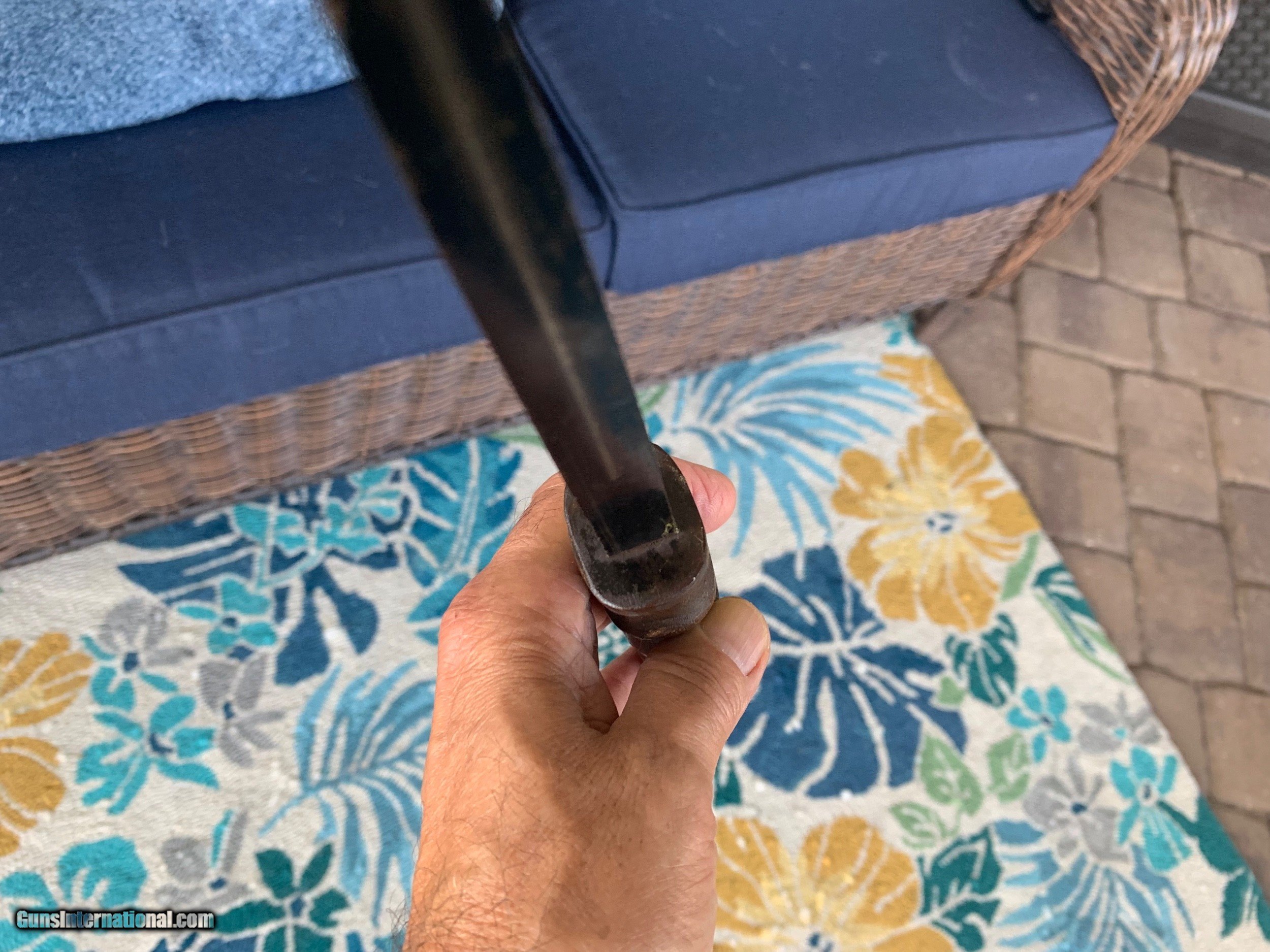 Description: Here's a 1918 Trench knife in great condition ! During the war in was made into a fighting knife the knuckles where removed or it came this way ! Either way it's a Awsome piece . Blade has most all of its original blue finish still remaining! Has a full tip . The wood handle has a few small cracks in it . Overal in excellent condition. The scabbard is in excellent plus condition. Super nice original scabbard dated 1918 . Looks like it's marked Wells . Scabbard has inspector stamp on metal . Super nice original scabbard. Overall a rare piece of American History! Please review my photos and please email me with any questions ? Thank you for looking, Little Jo SOLD |