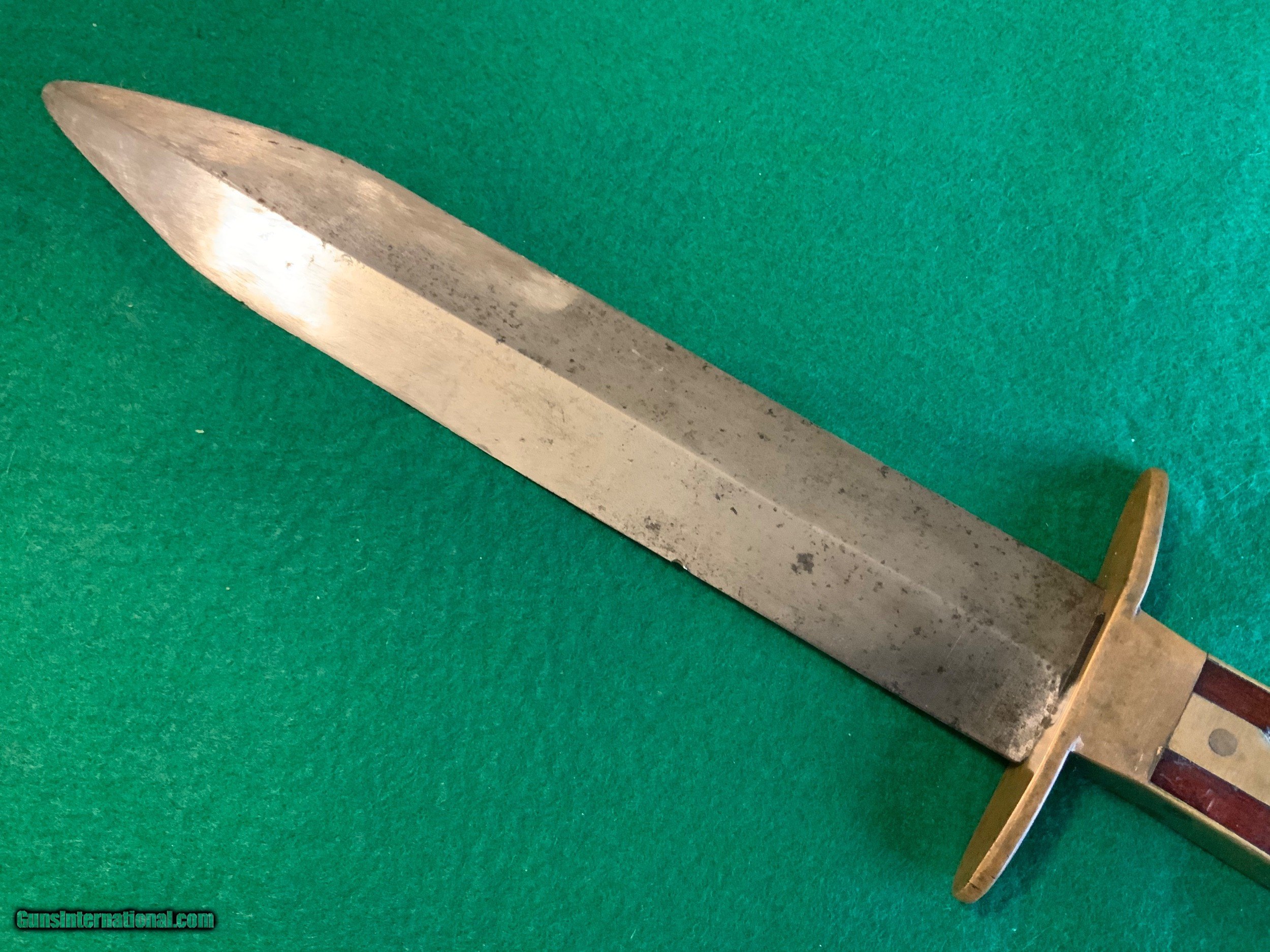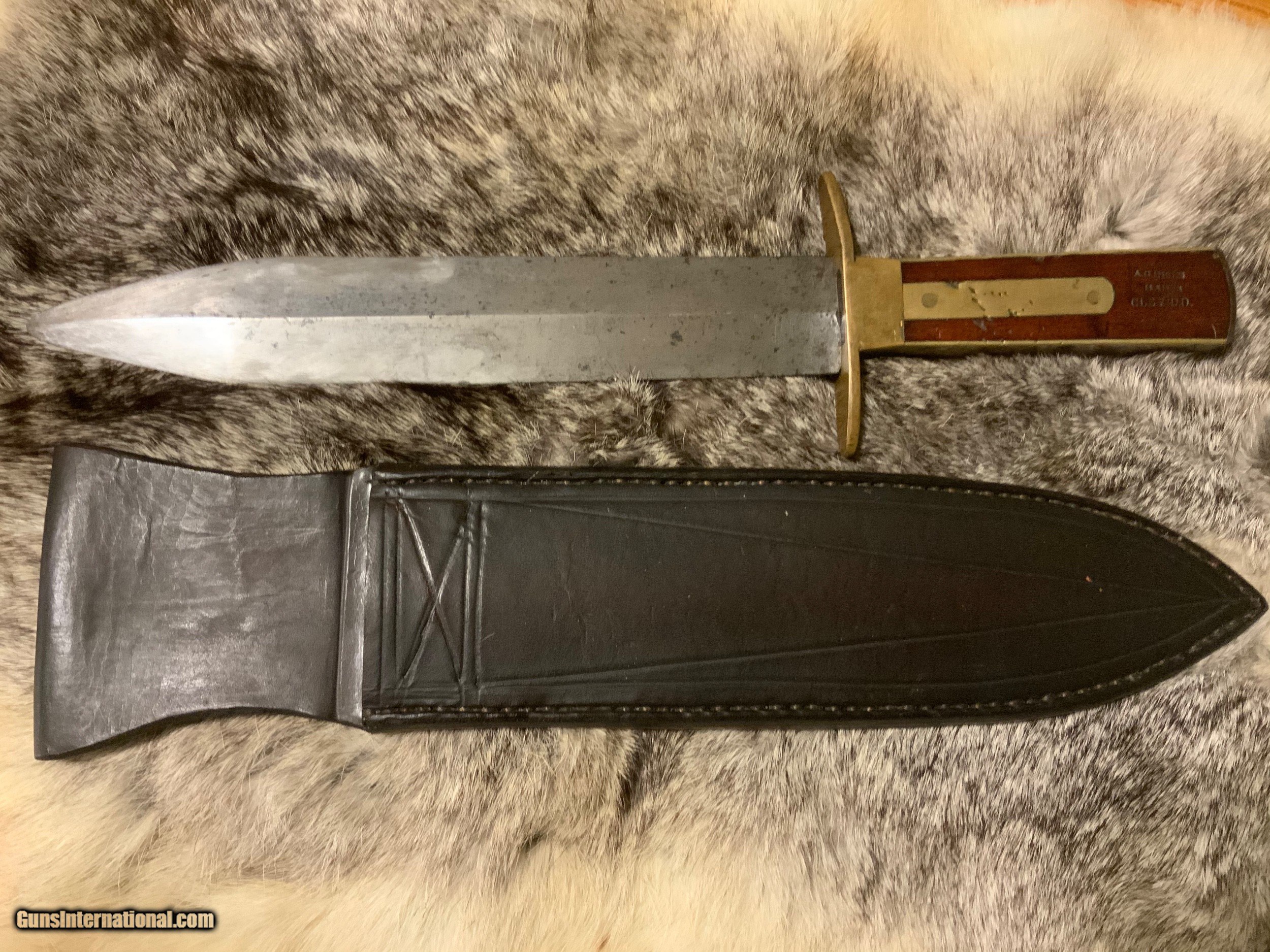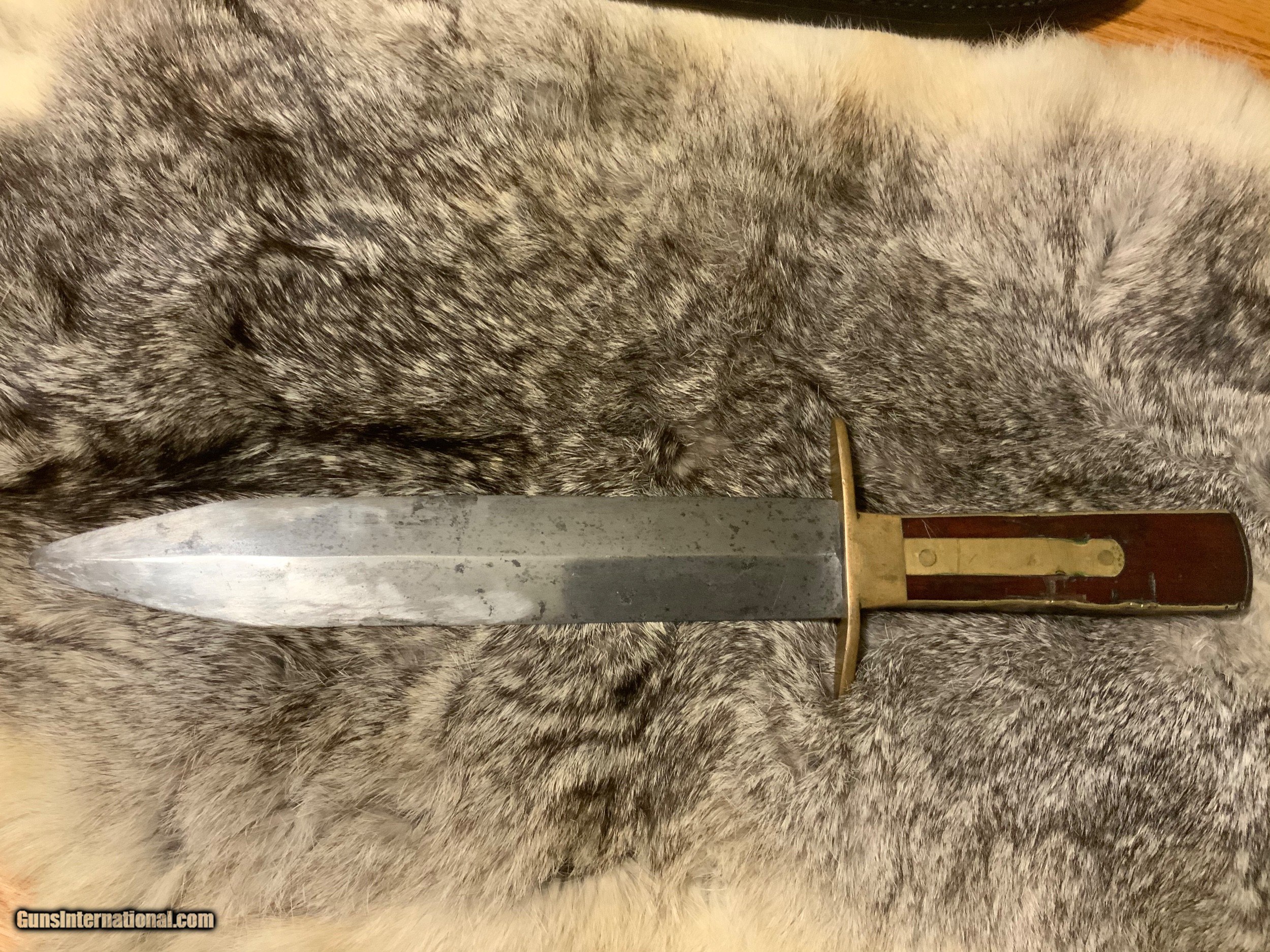Description: A.G.Hicks Maker Clev'd. O. 9''Riflemans knife. Made in 1840's. Correct markings,screws,brass fittings,etc. original finish. A G Hicks knives were the first regulation fighting knives purchased and issued by the US Army. This knife has an oval brass guard,iron butt,and rosewood grips bound with brass strips. The grips are fastened to the brass strips by 12,flush ground iron screws. The iron pommel is attached by 2 flush ground,iron screws. The reverse side of the grip is stamped''A. G. HICKS/MAKER/CLEV'D. O. In 3 lines. Replacement scabbard (Peterson states in''American Knives'', that ''only one scabbard has thus far been located''-1958. VERY RARE KNIFE !! SOLD |