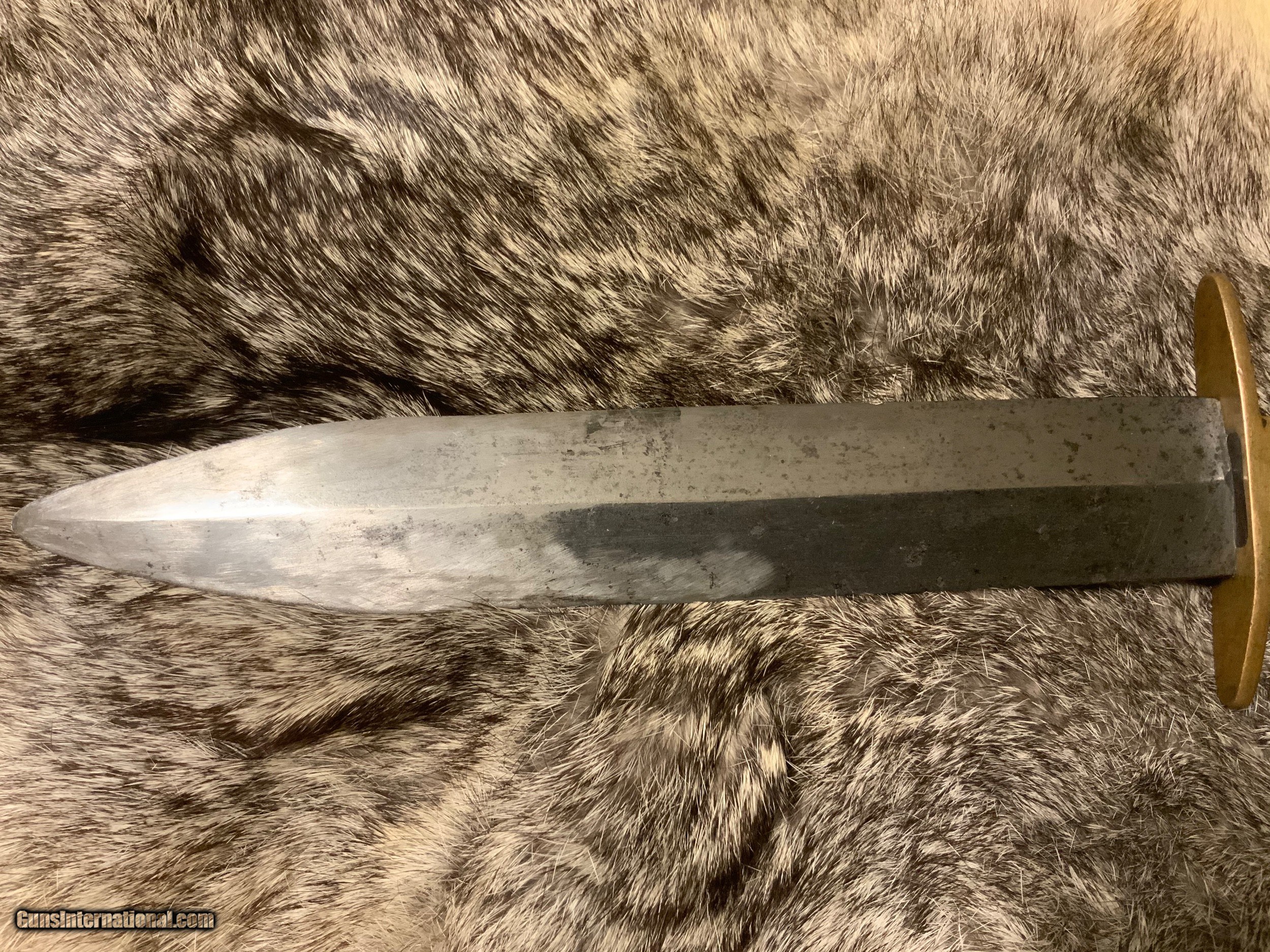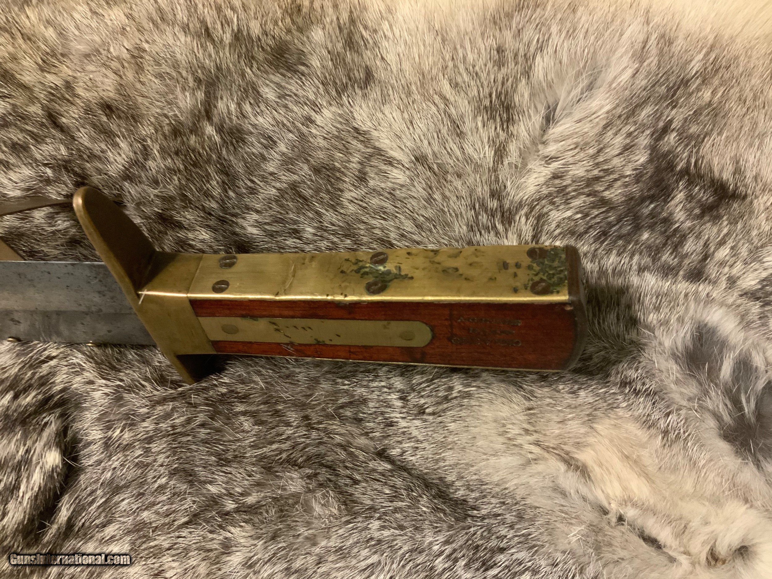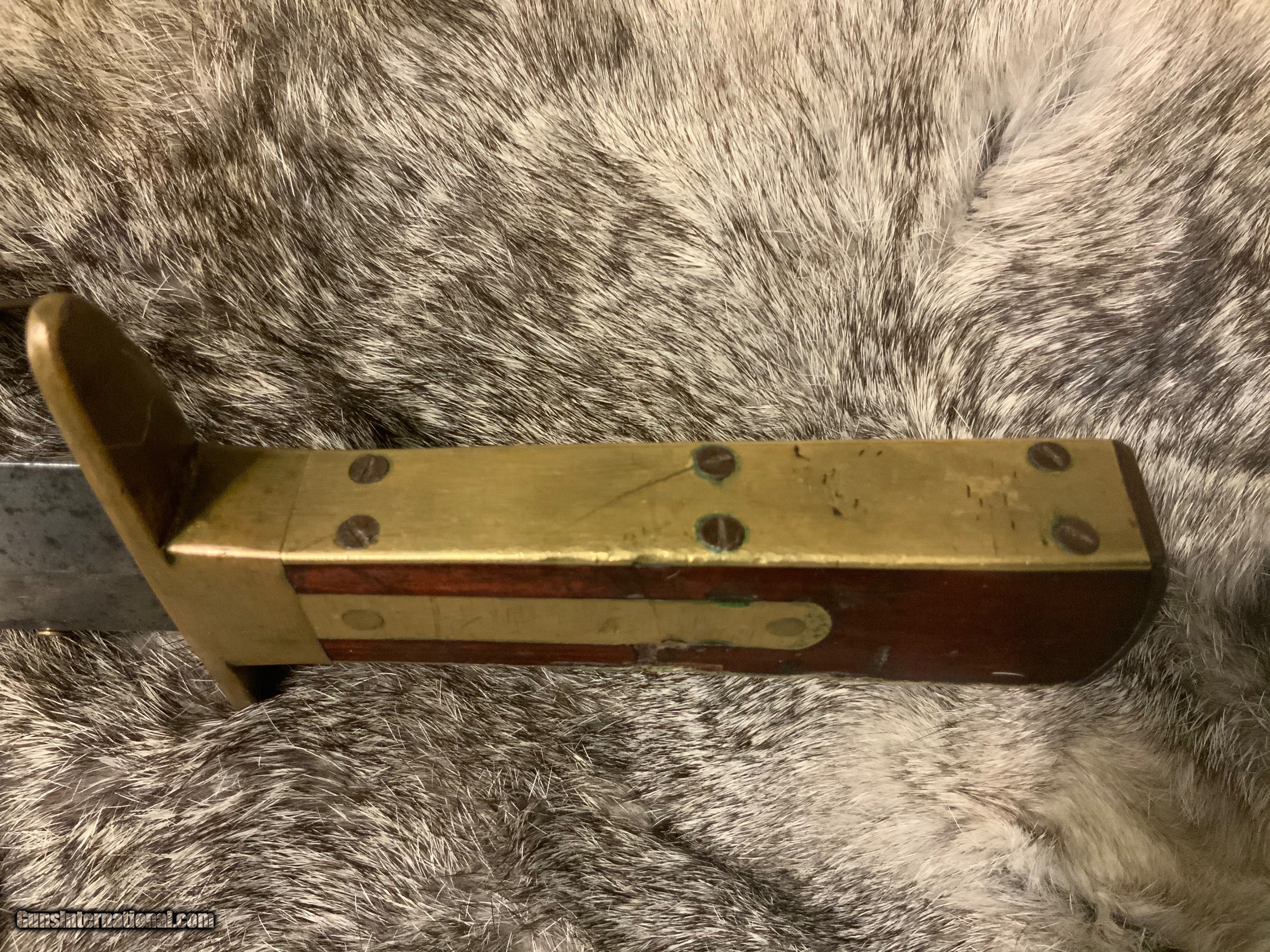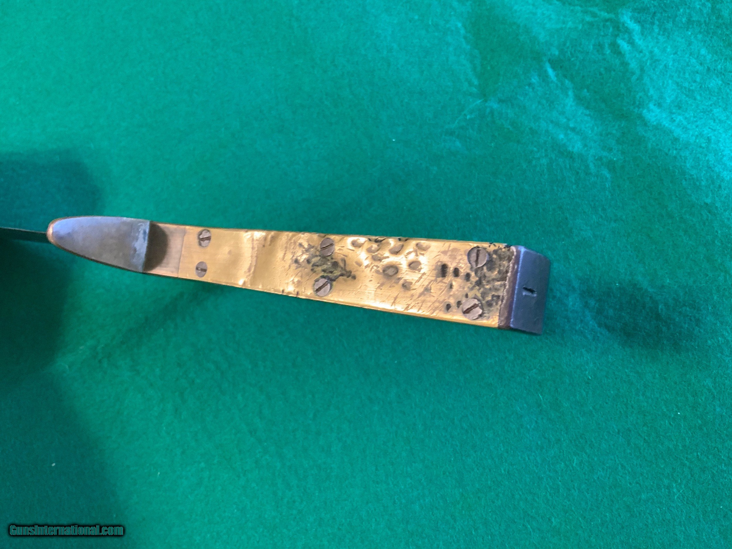 Description: A.G.Hicks Maker Clev'd. O. 9''Riflemans knife. Made in 1840's. Correct markings,screws,brass fittings,etc. original finish. A G Hicks knives were the first regulation fighting knives purchased and issued by the US Army. This knife has an oval brass guard,iron butt,and rosewood grips bound with brass strips. The grips are fastened to the brass strips by 12,flush ground iron screws. The iron pommel is attached by 2 flush ground,iron screws. The reverse side of the grip is stamped''A. G. HICKS/MAKER/CLEV'D. O. In 3 lines. Replacement scabbard (Peterson states in''American Knives'', that ''only one scabbard has thus far been located''-1958. VERY RARE KNIFE !! SOLD |