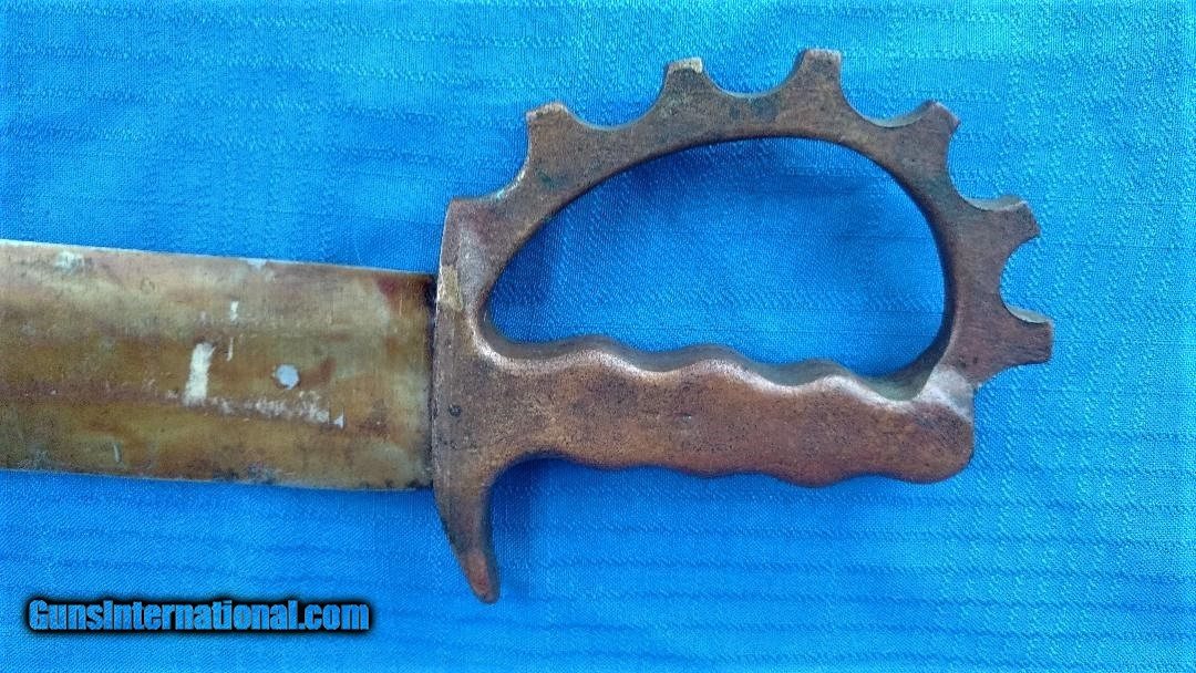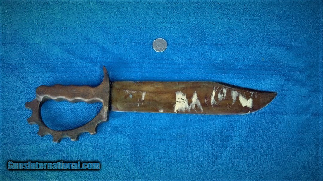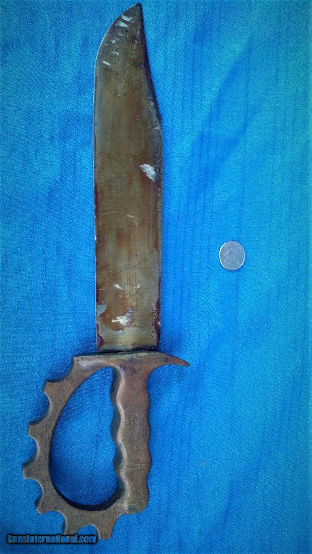Description: HERE A ONE OF A KIND KNUCKLE KNIFE . SPORTING A CASE XX LARGE CLIP POINT BLADE AND BRASS KNUCLES FOR A HANDLE. THIS IS A MEAN - FIGHTING MACHINE ! GREAT PIECE ! MEASURES 14" OVERALL AND CLIP POINT BLADE MEASURES 9 1/2". NO SHEATH. HAS A COAT OF SOME OLD VARNISH ON BLADE. TIGHT AND READY FOR A FIGHT ! PLEASE REVIEW MY PHOTOS AND PLEASE EMAIL ME WITH ANY QUESTIONS ? I WILLTRADE . AND OPEN TO OFFERS ! THANKS FOR LOOKING , LITTLE JO SOLD |