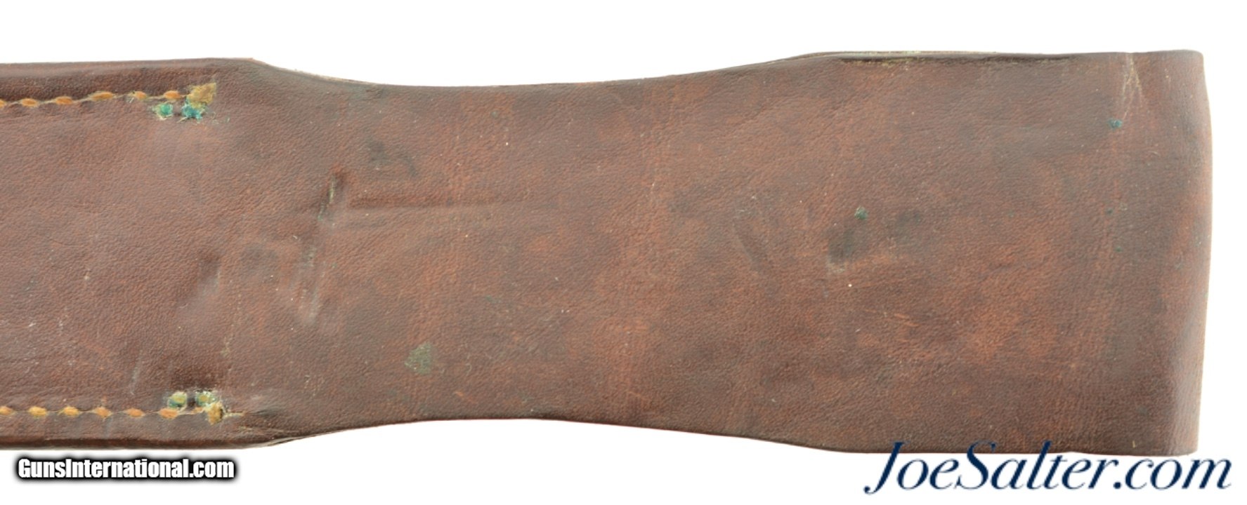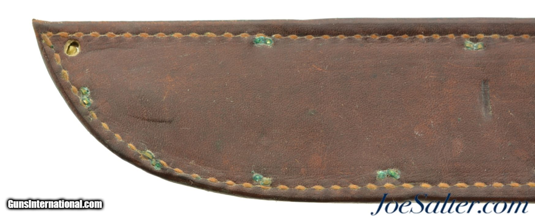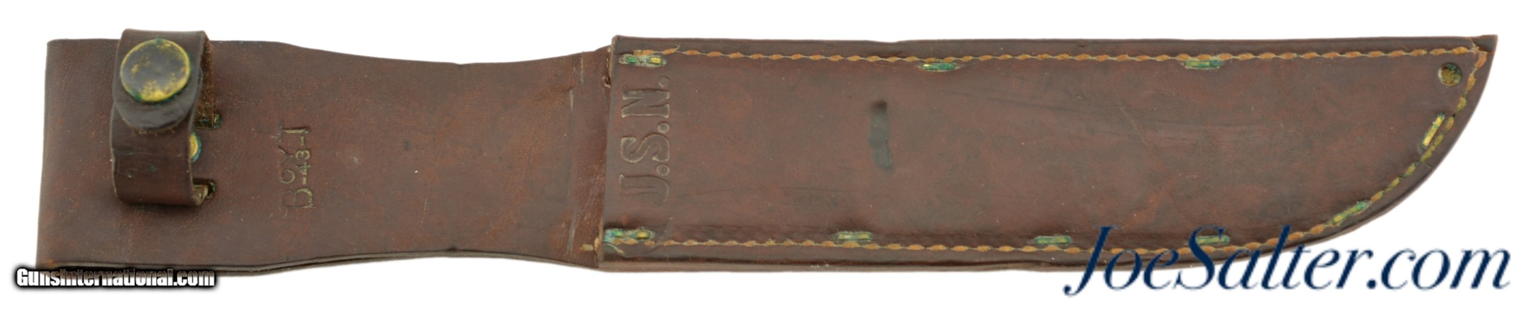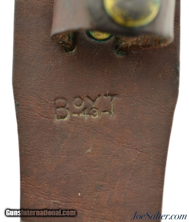 Description: An excellent original WW2 Boyt 1943 dated scabbard. This scabbard looks to be unissued. It had leather treatment put on it long ago and shows some verdigris around the brass fittings. It has an indent in the center (see photos). This is the staple fastened type as per page 126 of Cole's Best. Used by the USN and the US Marines. SOLD |