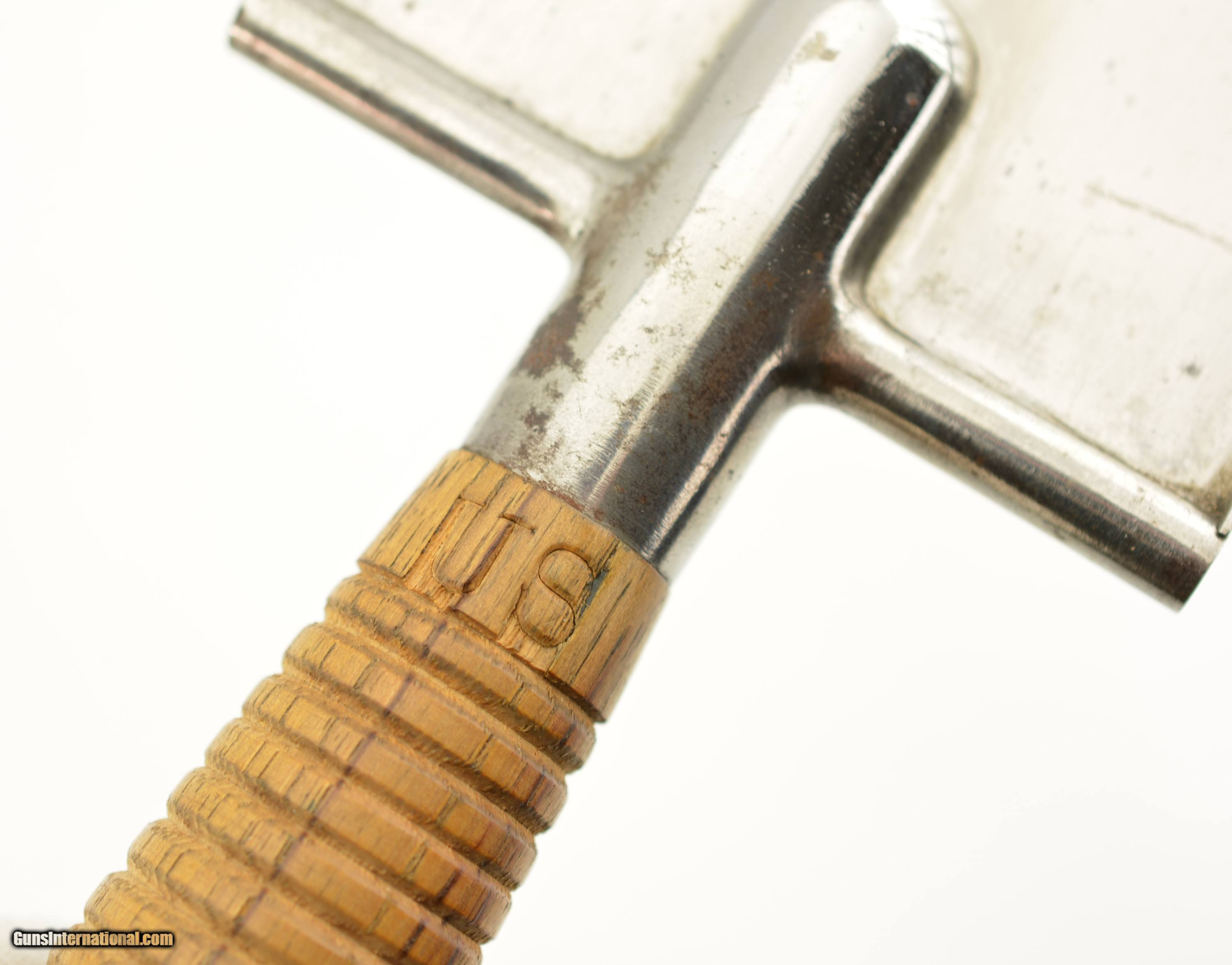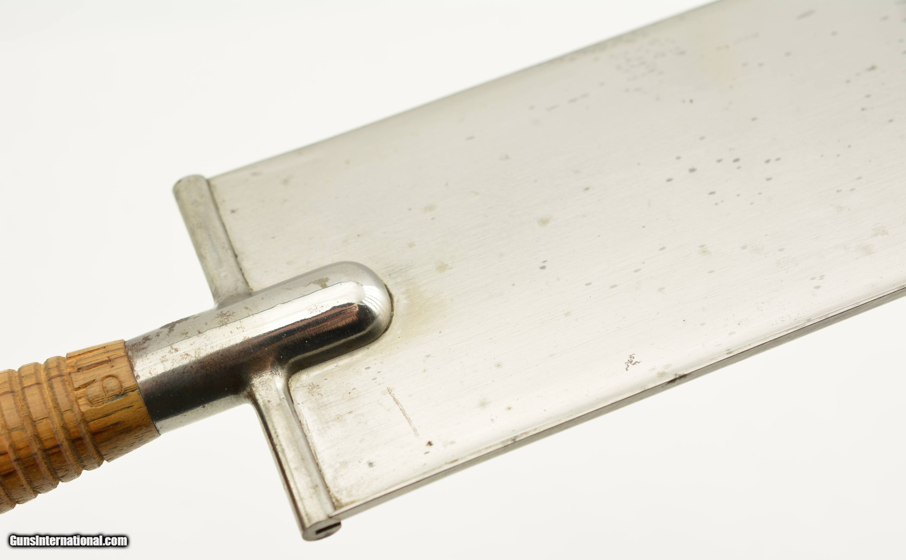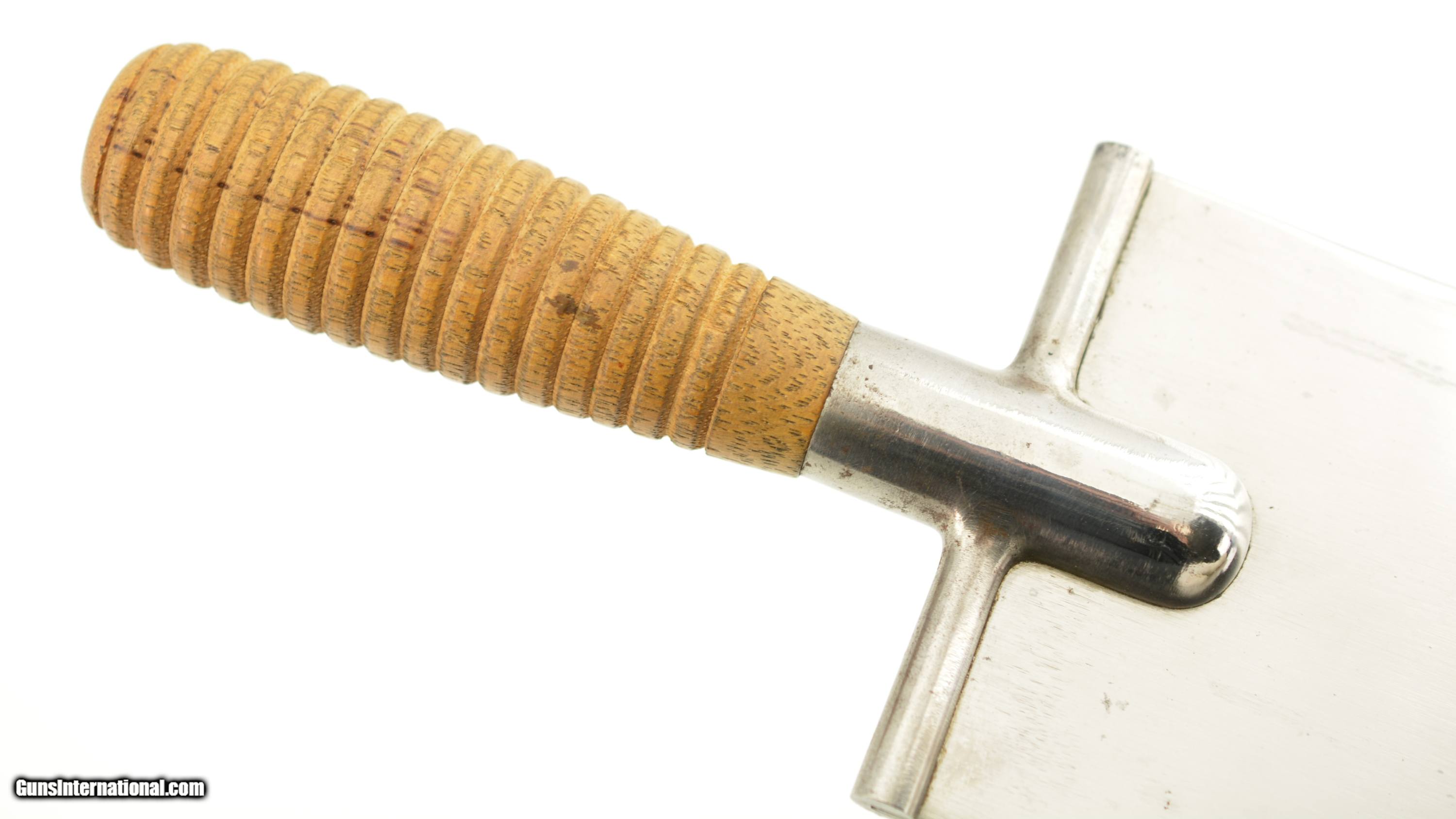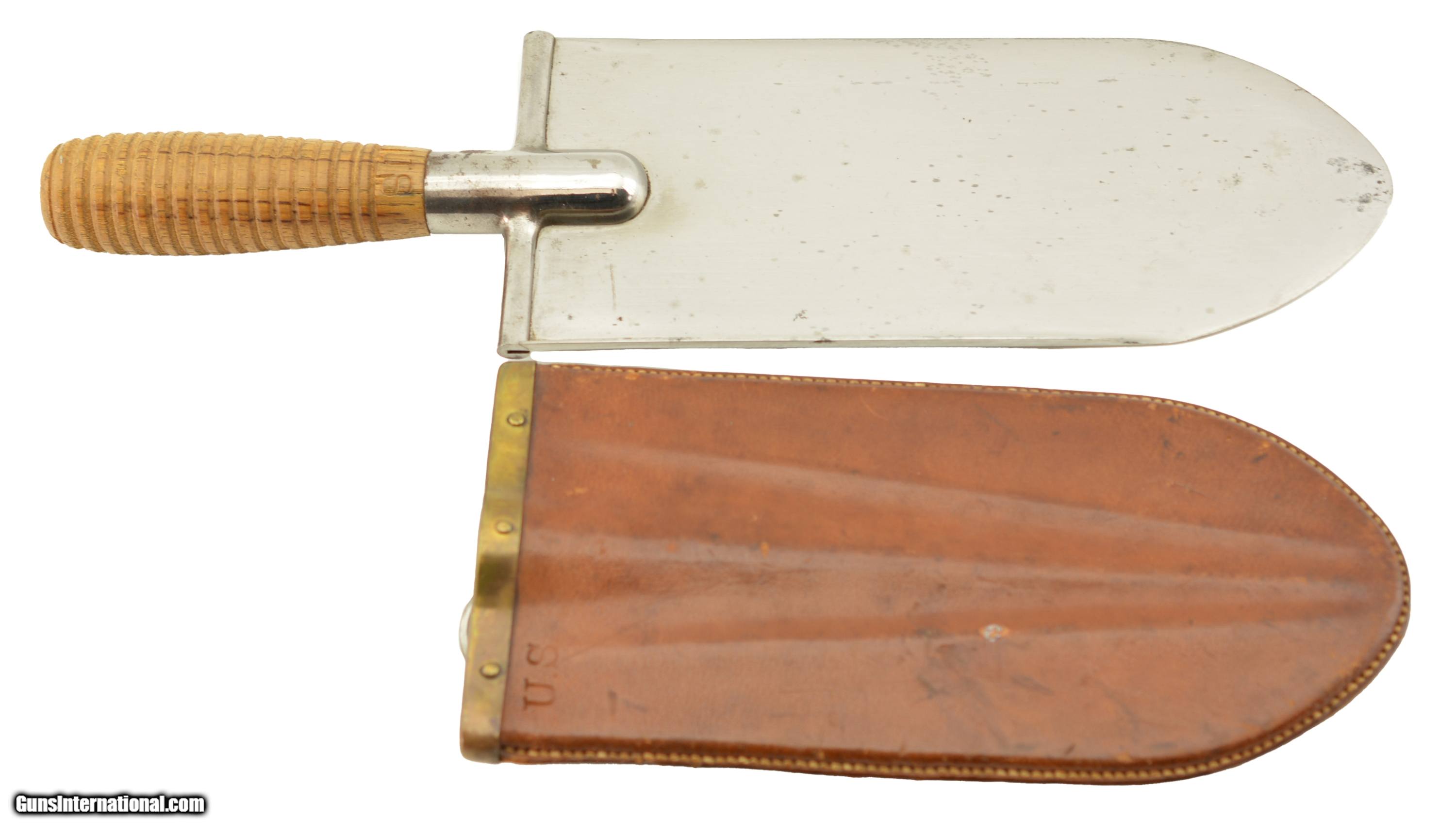 Description: This is the Model 1880 US Army Intrenching tool issued during the Indian War period which also saw the similarly designed Model 1880 Hunting Knife. The flat blade measures 8" long, with a width of 3 1/2", and a rounded tip. The steel blade is armory bright, original patina with some tiny spots of carbon staining. The throat of the cross guard nearest the handle has a small dime size area of surface pitting but is otherwise excellent. The 17 groove oak handle has a crisp “US" stamp at the top is excellent with a small impact mark on the top side of the handle but otherwise as issued with tiny chips of wood missing below the stamp. The original scabbard is excellent and has embossed “US" at the throat, and is fully intact with loop and ring showing some storage scratches and blemishes on the leather surface with intact stitching. An excellent example of this Indian Wars era tool that would be hard to improve upon. SOLD Manufacturer: US Military Model: Intrenching Tool |