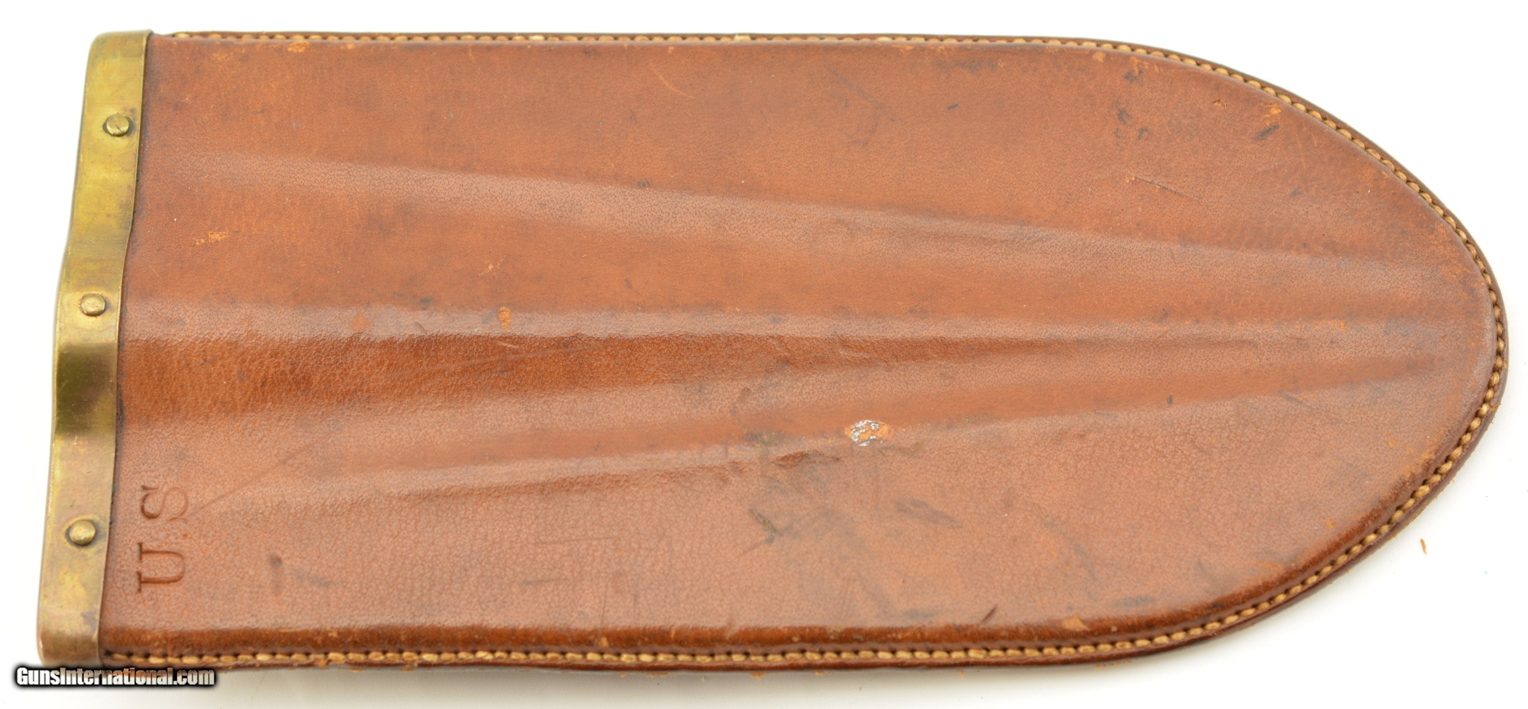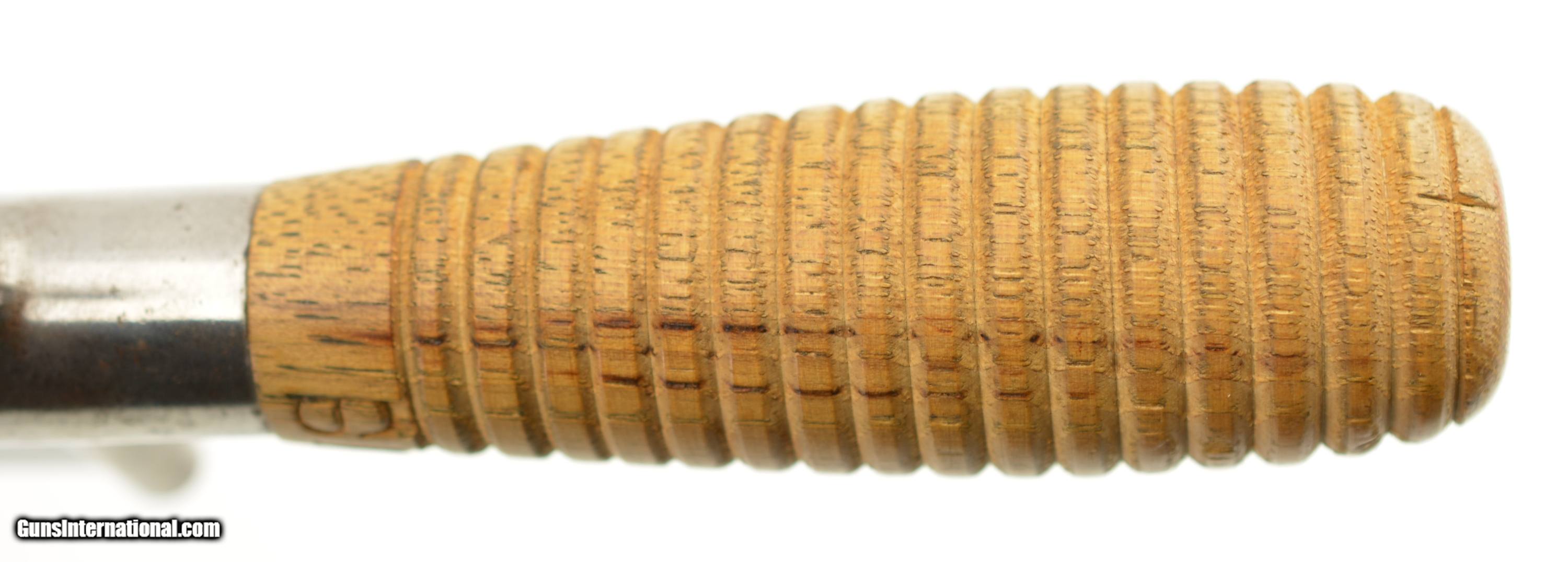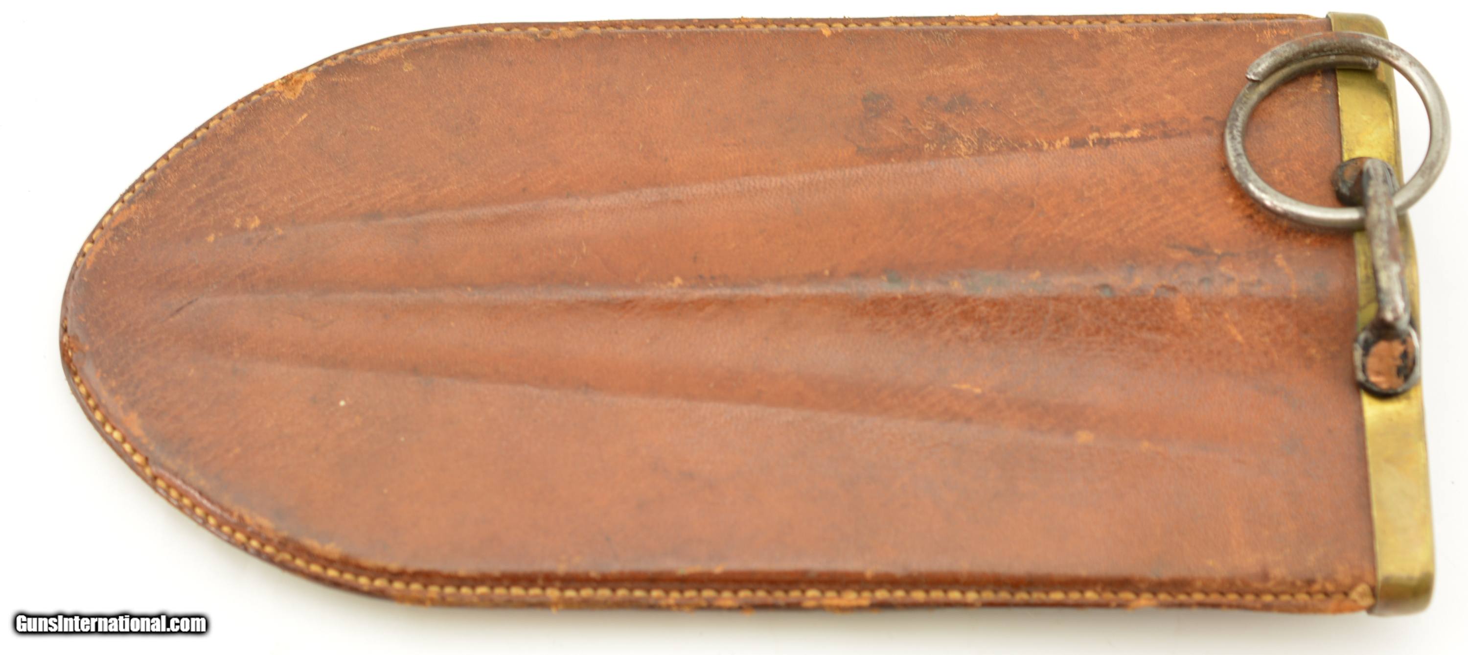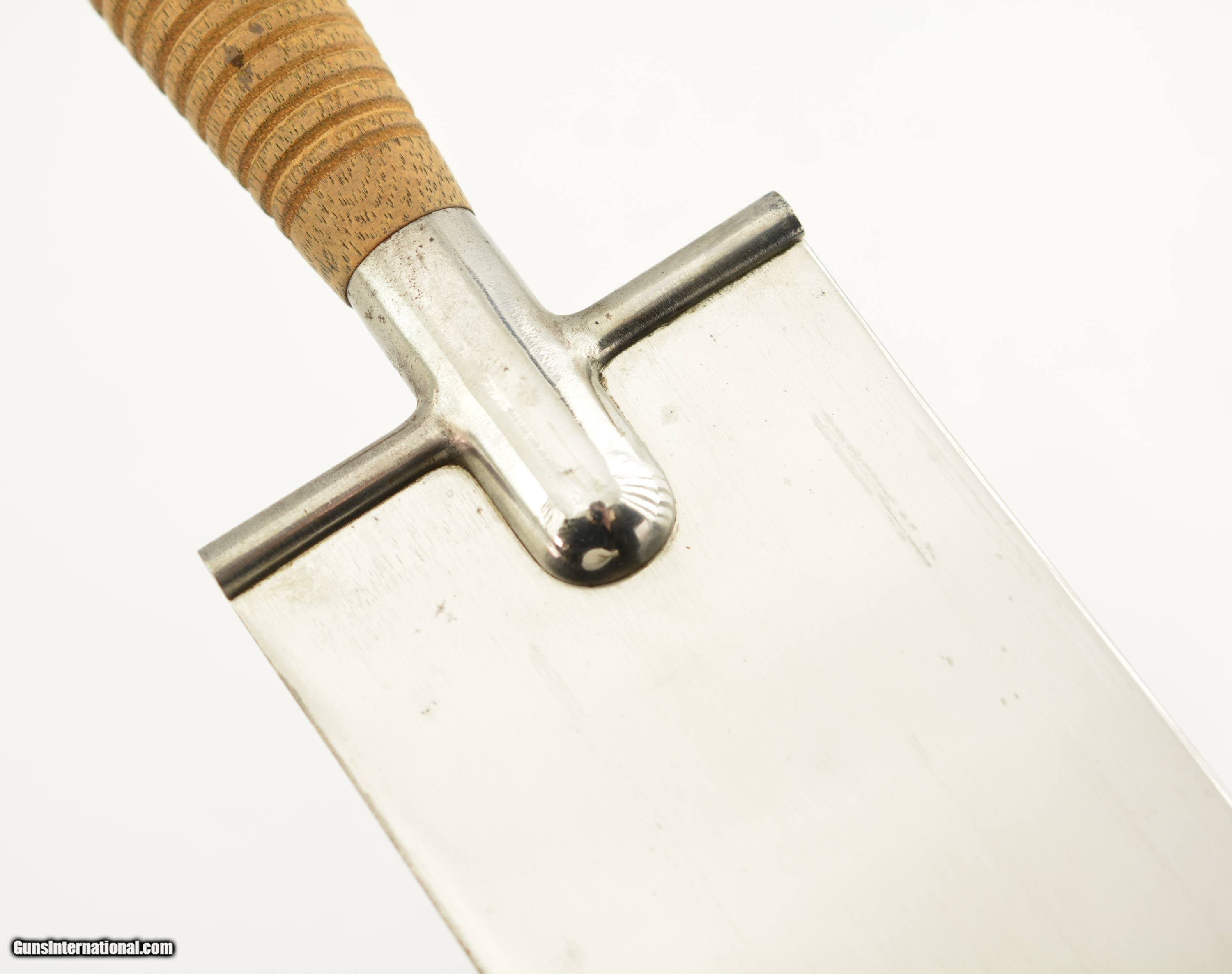 Description: This is the Model 1880 US Army Intrenching tool issued during the Indian War period which also saw the similarly designed Model 1880 Hunting Knife. The flat blade measures 8" long, with a width of 3 1/2", and a rounded tip. The steel blade is armory bright, original patina with some tiny spots of carbon staining. The throat of the cross guard nearest the handle has a small dime size area of surface pitting but is otherwise excellent. The 17 groove oak handle has a crisp “US" stamp at the top is excellent with a small impact mark on the top side of the handle but otherwise as issued with tiny chips of wood missing below the stamp. The original scabbard is excellent and has embossed “US" at the throat, and is fully intact with loop and ring showing some storage scratches and blemishes on the leather surface with intact stitching. An excellent example of this Indian Wars era tool that would be hard to improve upon. SOLD Manufacturer: US Military Model: Intrenching Tool |