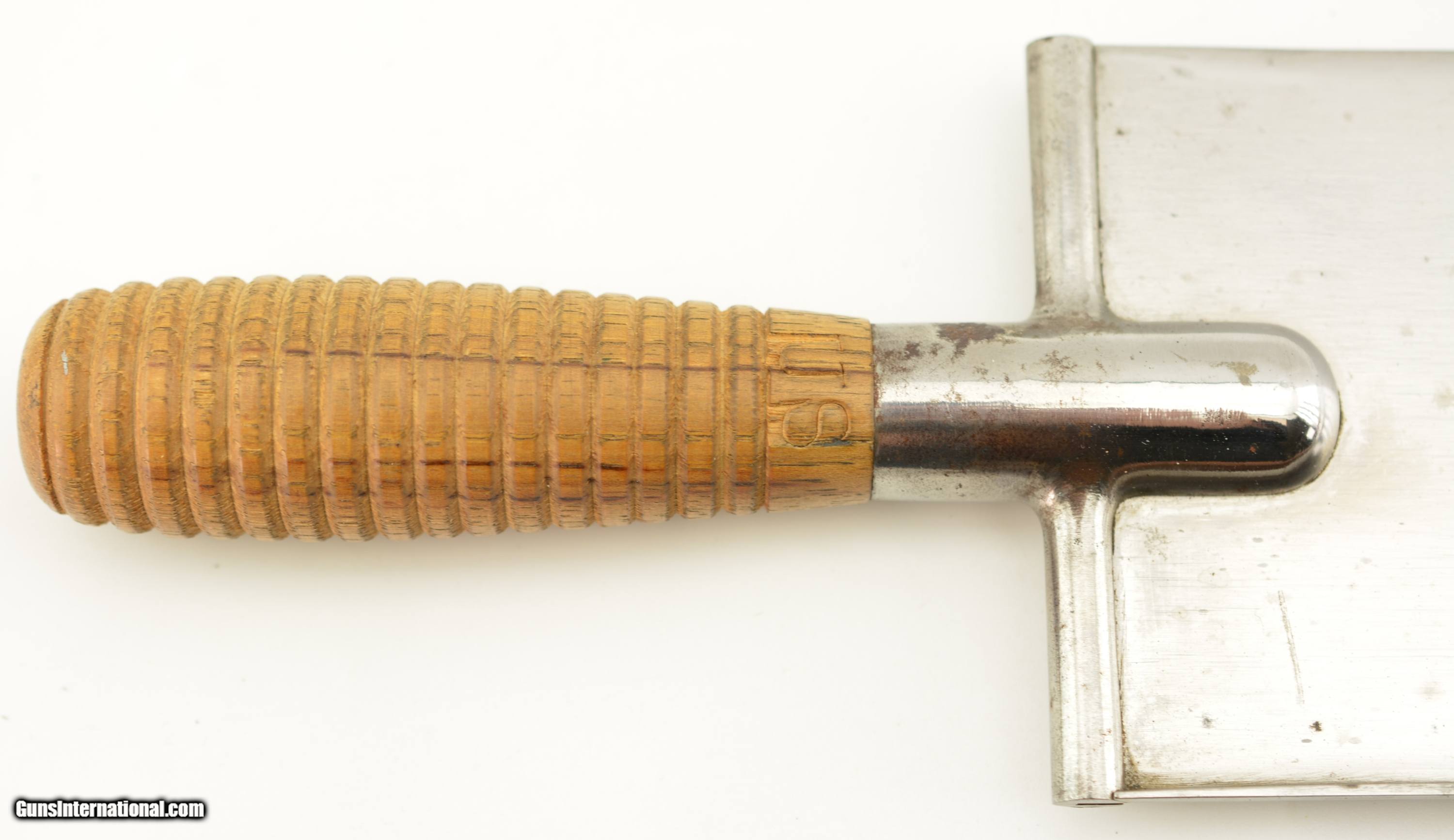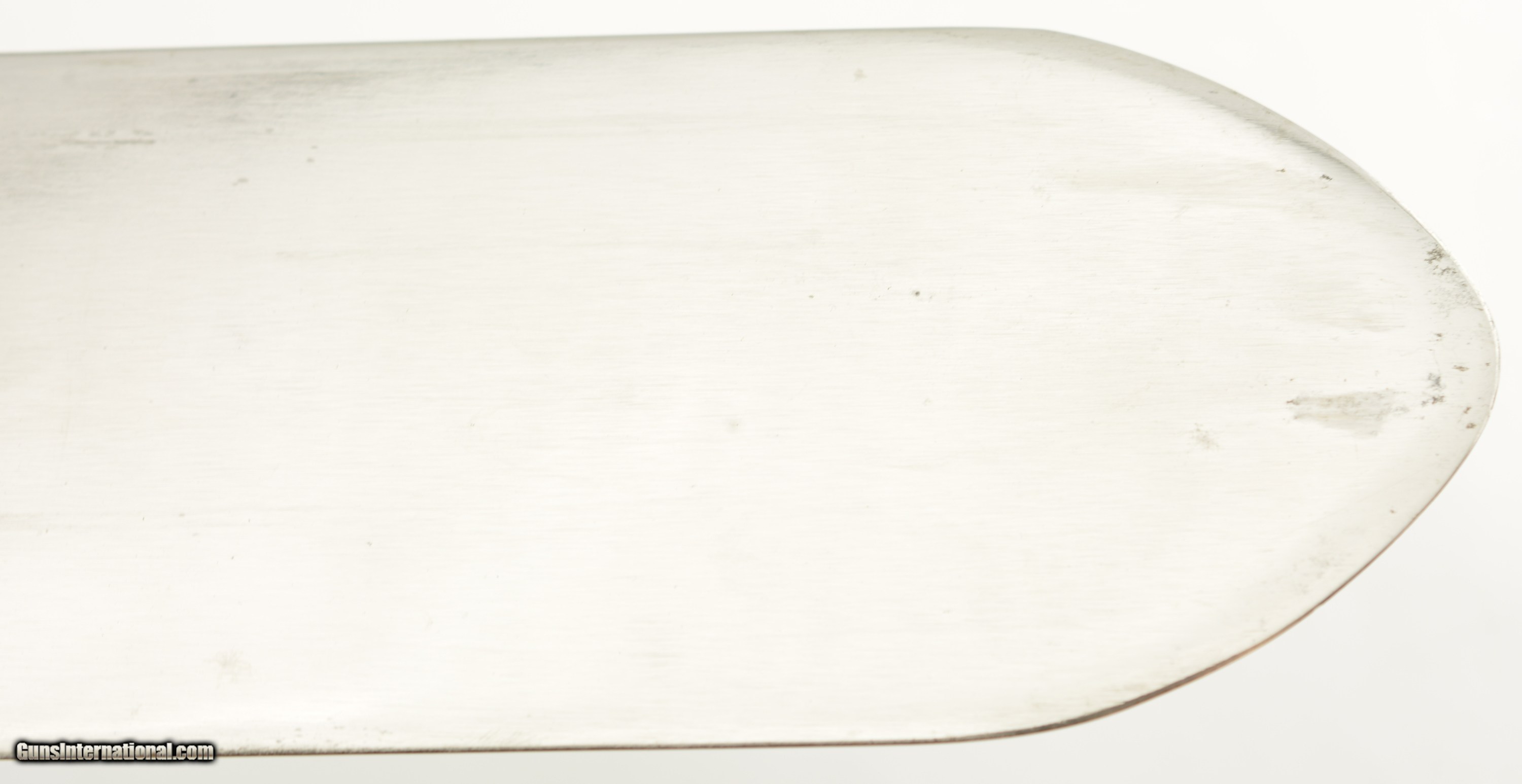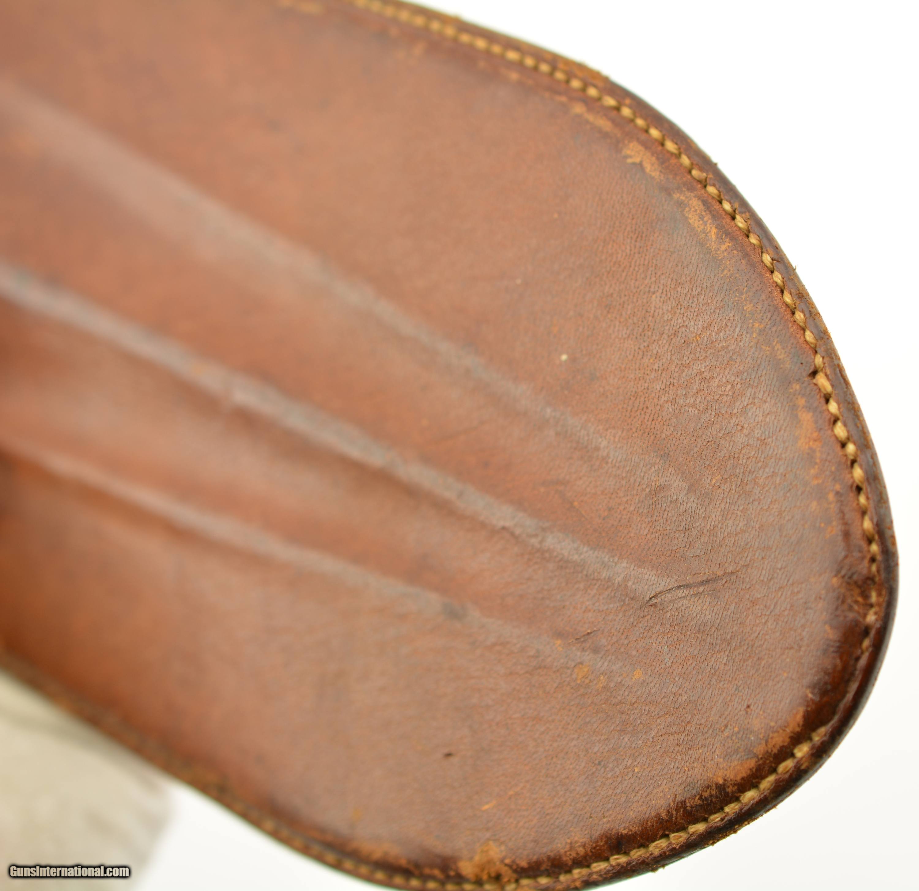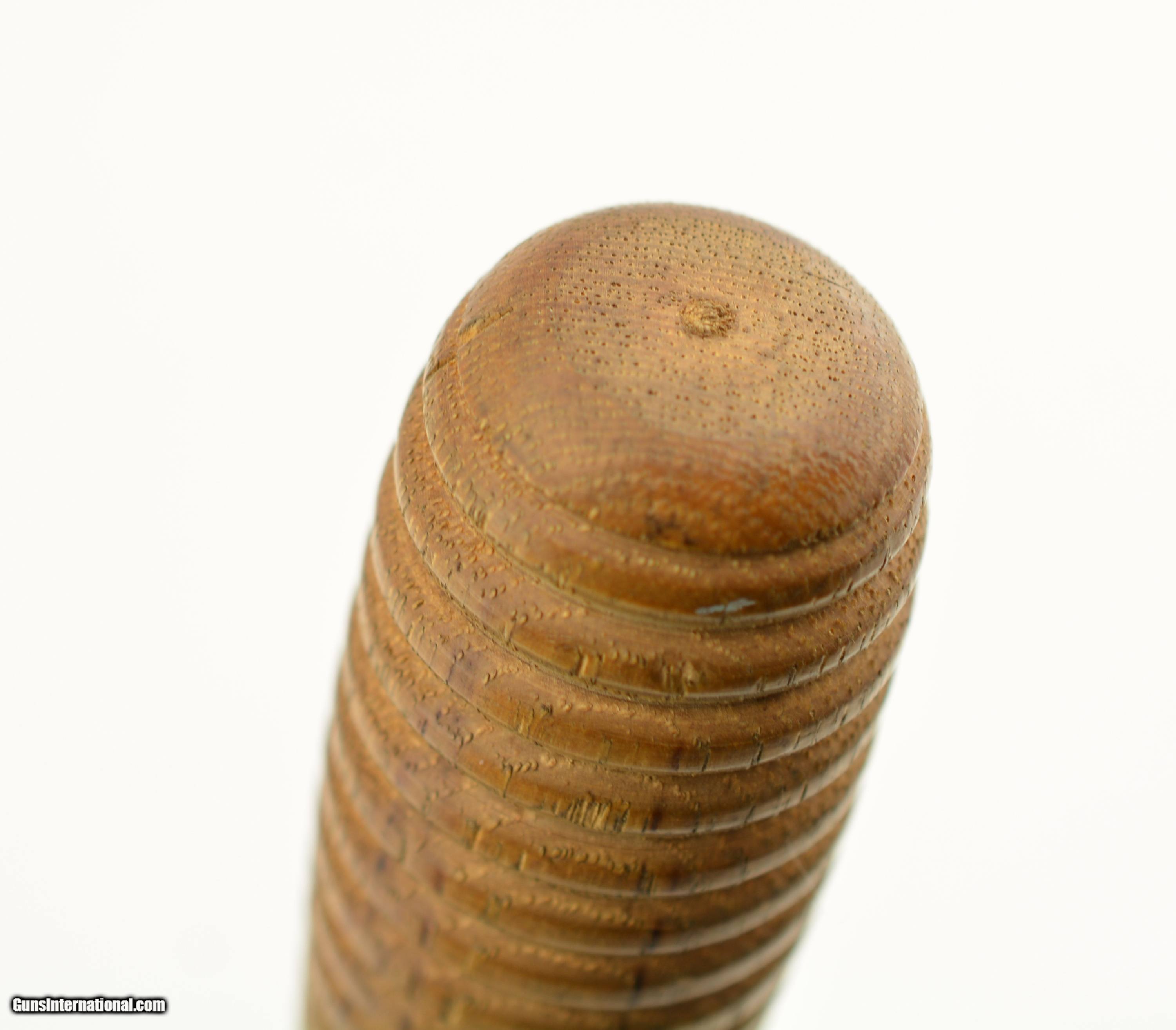Description: This is the Model 1880 US Army Intrenching tool issued during the Indian War period which also saw the similarly designed Model 1880 Hunting Knife. The flat blade measures 8" long, with a width of 3 1/2", and a rounded tip. The steel blade is armory bright, original patina with some tiny spots of carbon staining. The throat of the cross guard nearest the handle has a small dime size area of surface pitting but is otherwise excellent. The 17 groove oak handle has a crisp “US" stamp at the top is excellent with a small impact mark on the top side of the handle but otherwise as issued with tiny chips of wood missing below the stamp. The original scabbard is excellent and has embossed “US" at the throat, and is fully intact with loop and ring showing some storage scratches and blemishes on the leather surface with intact stitching. An excellent example of this Indian Wars era tool that would be hard to improve upon. SOLD Manufacturer: US Military Model: Intrenching Tool |