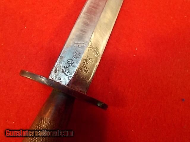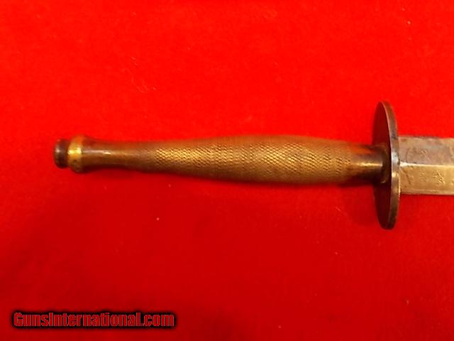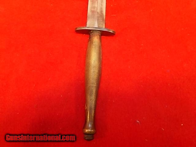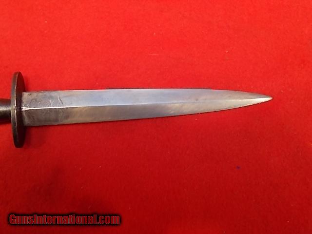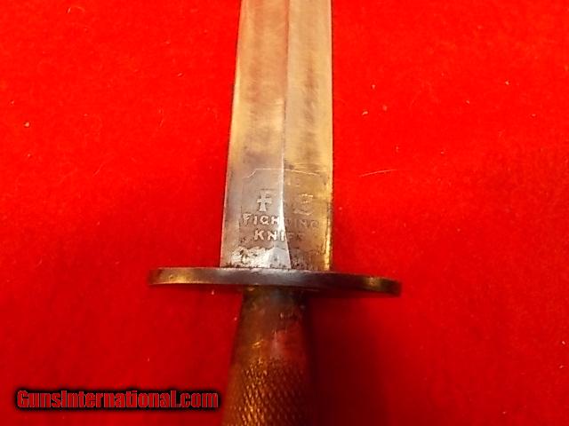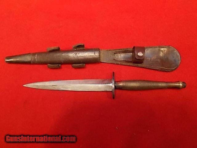 Description: PICTURED IS AN ORIGINAL FIRST ISSUE FAIRBAIRN SYKES COMMANDO FIGHTING KNIFE WITH SHEATH. BLADE IN IN EXCELLENT CINDITION, VERY SHARP AND CLEAN. ORIGINAL SHEATH IS EXCELENT , NO SPLITS OR TEARS. THE BRASS HILT COULD NEED SOME COSMETIC CKENING. THE FIRST ISSUE WAS MADE FROM AUGUST 1941 TO NOVEMBER 1942. A VERY NICE EXAMPLE OF AN EARLY KNIFE. SOLD |