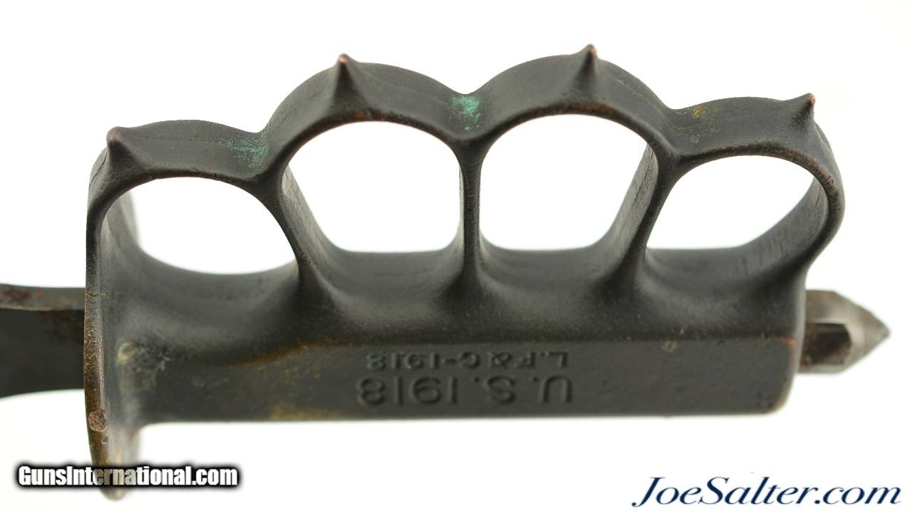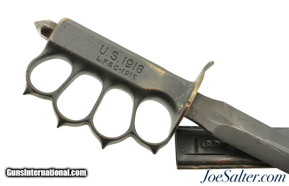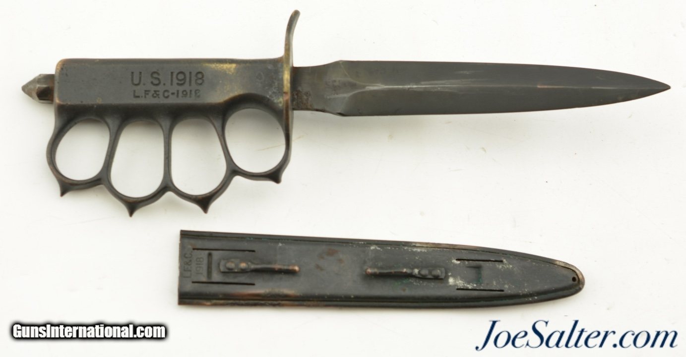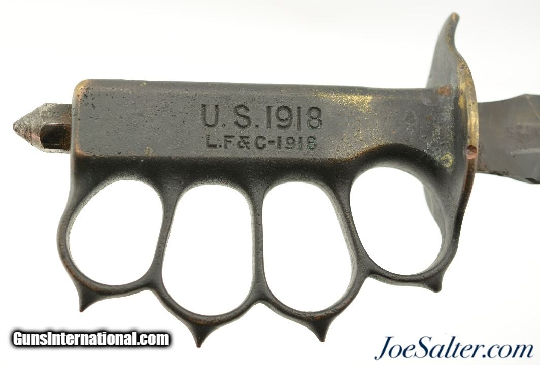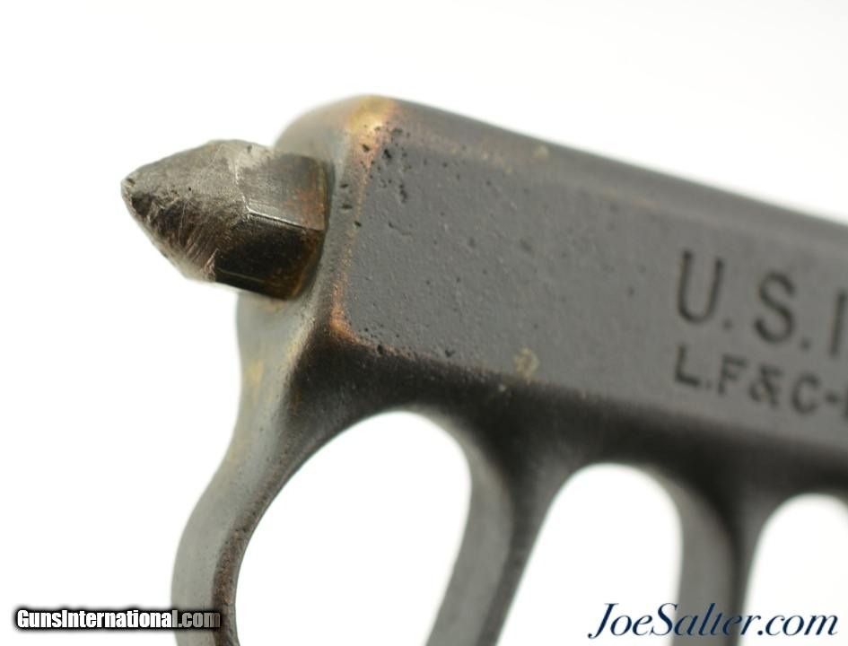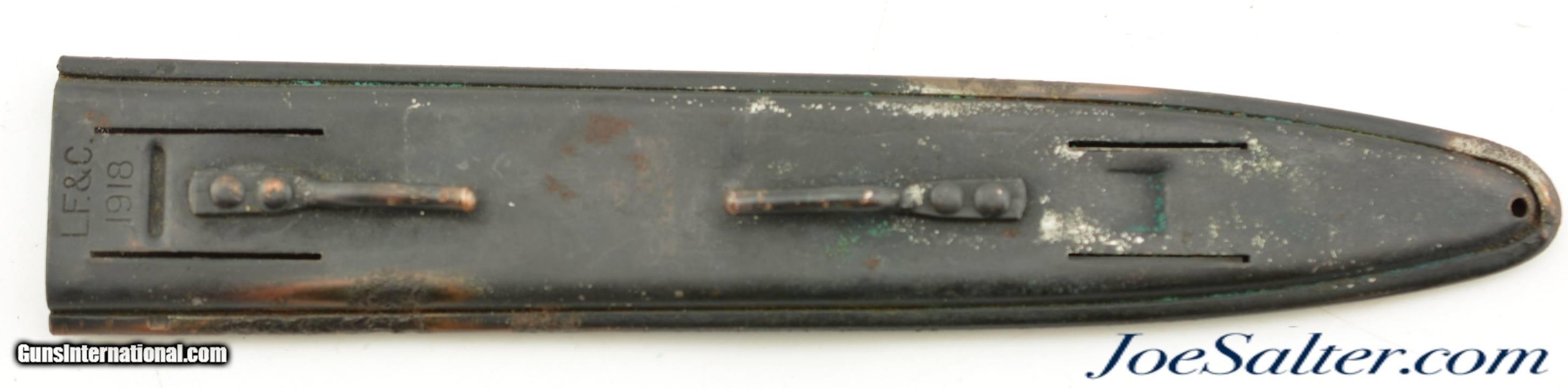 Description: This LF&C 1918 US Fighting Knife was produced by Landers, Frary, & Clark, a housewares company located in New Britain Connecticut. This 1918 US Fighting Knife exhibits an extremely nice blackened blade with light runner marks and an area of oxidation on the obverse ricasso. Scattered oxidation throughout its length. In standard M1918 configuration with a blackened solid cast brass knuckle grip marked "U.S. 1918 / L.F & C 1918". Pleasing dark patina on the grip with the guard showing one small chip or casting imperfection. The pommel nut remains tight with some oxidation. Complete with its original stamped steel scabbard with correct weep hole at tip. The scabbard on this 1918 US Fighting Knife is correctly marked "LF&C / 1918" on the throat with some pitting on the front. Both prongs remain intact and retain their original shape, a nice feature considering that most of these are found without any prongs as they were susceptible to being bent and broken with hard use or removal from a belt. This is a nice example of a LF&C 1918 US Fighting Knife that would fit perfectly in a World War I or fighting knife collection. Please see photo's for fine detail.; SOLD |
