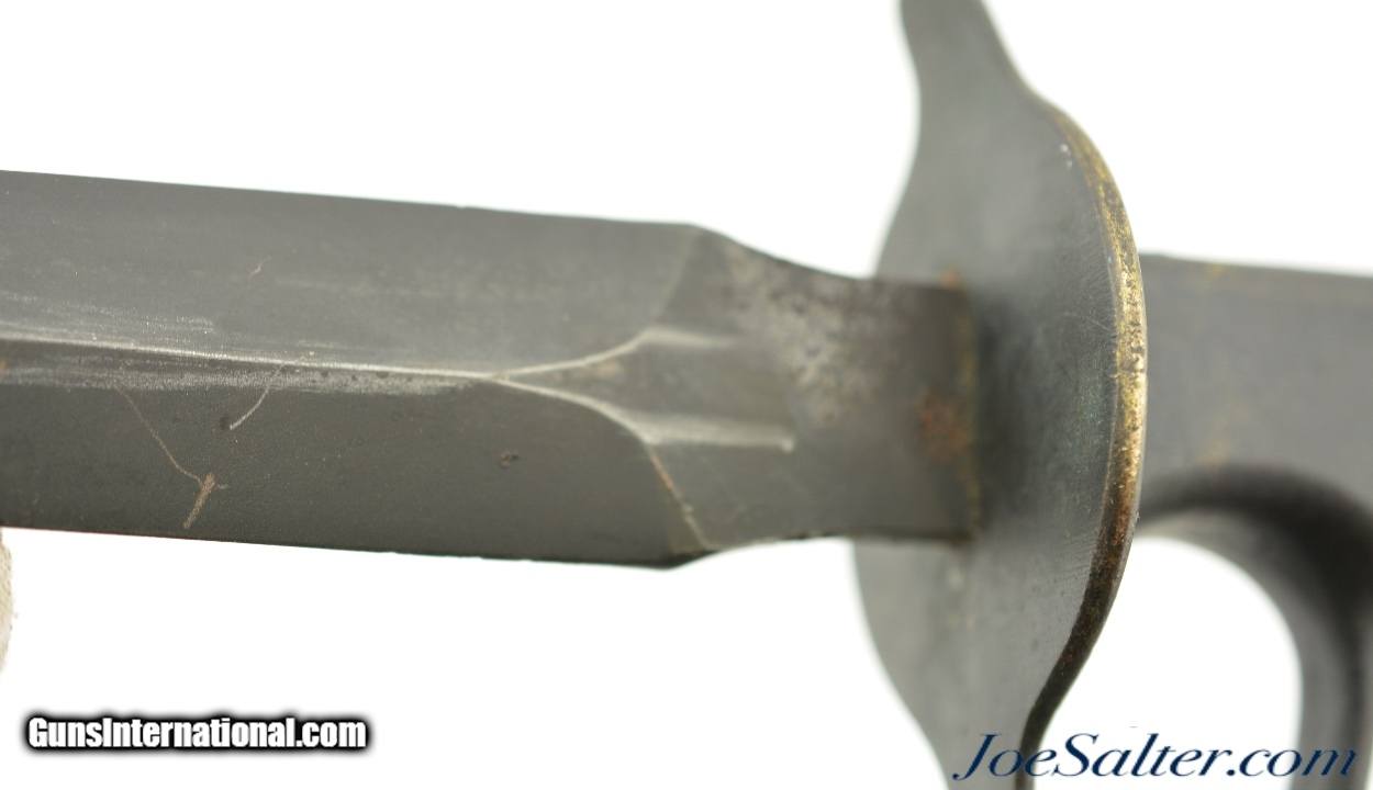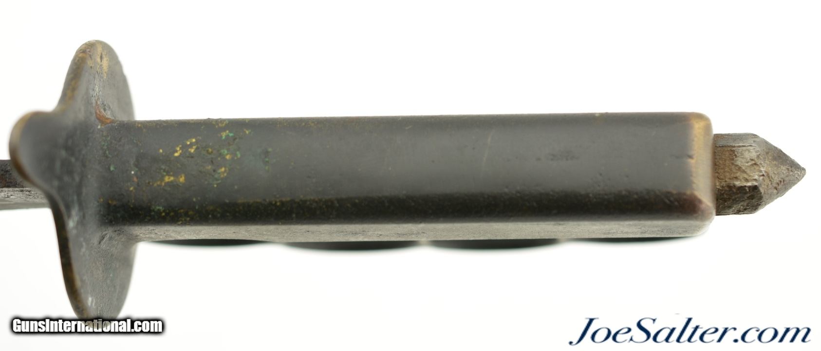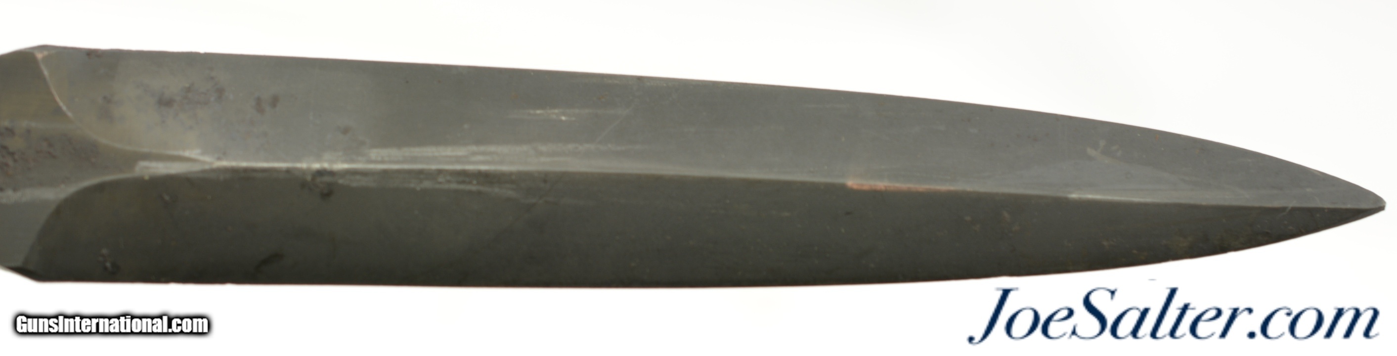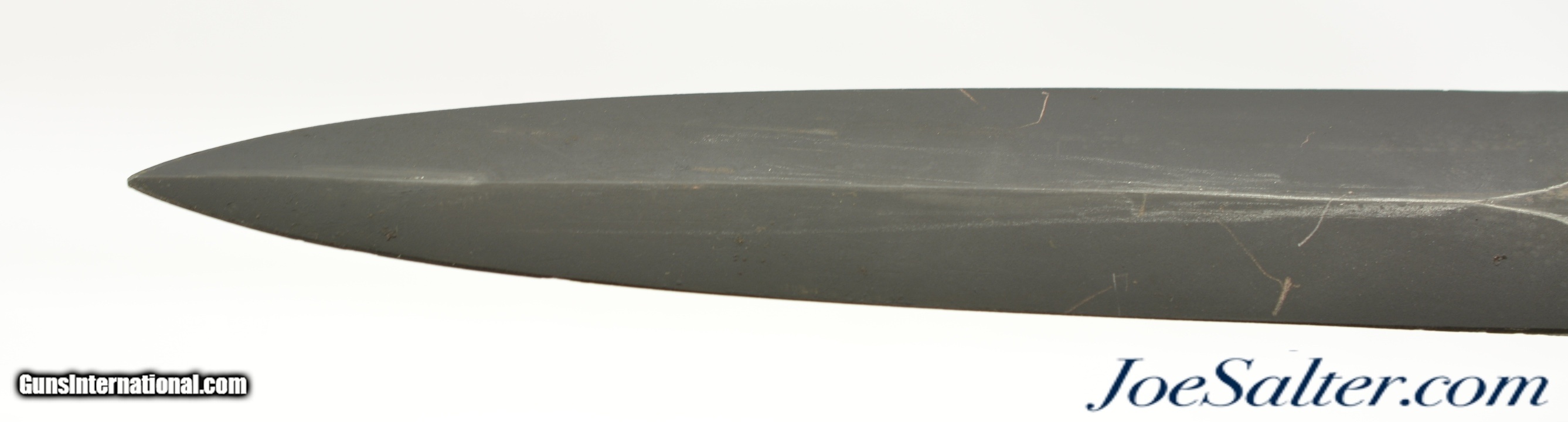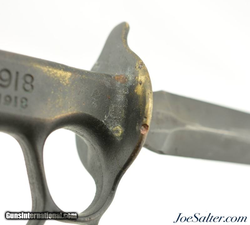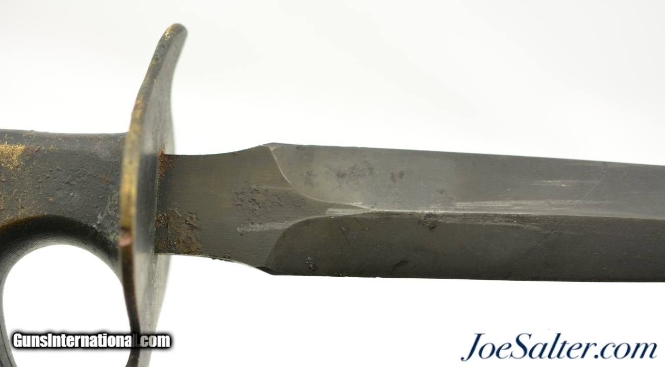 Description: This LF&C 1918 US Fighting Knife was produced by Landers, Frary, & Clark, a housewares company located in New Britain Connecticut. This 1918 US Fighting Knife exhibits an extremely nice blackened blade with light runner marks and an area of oxidation on the obverse ricasso. Scattered oxidation throughout its length. In standard M1918 configuration with a blackened solid cast brass knuckle grip marked "U.S. 1918 / L.F & C 1918". Pleasing dark patina on the grip with the guard showing one small chip or casting imperfection. The pommel nut remains tight with some oxidation. Complete with its original stamped steel scabbard with correct weep hole at tip. The scabbard on this 1918 US Fighting Knife is correctly marked "LF&C / 1918" on the throat with some pitting on the front. Both prongs remain intact and retain their original shape, a nice feature considering that most of these are found without any prongs as they were susceptible to being bent and broken with hard use or removal from a belt. This is a nice example of a LF&C 1918 US Fighting Knife that would fit perfectly in a World War I or fighting knife collection. Please see photo's for fine detail.; SOLD |