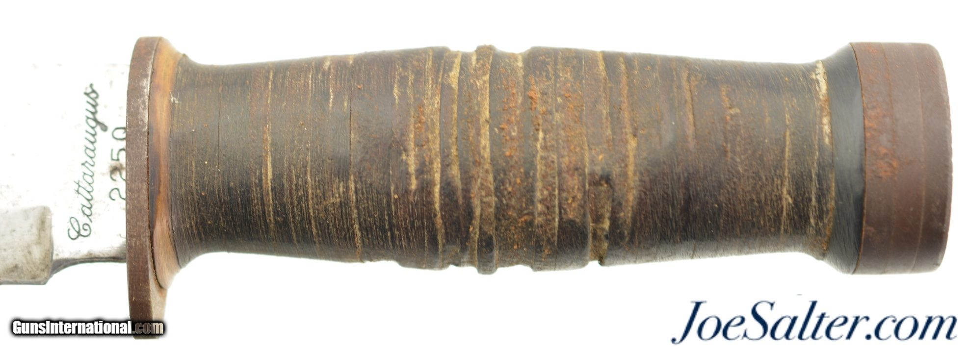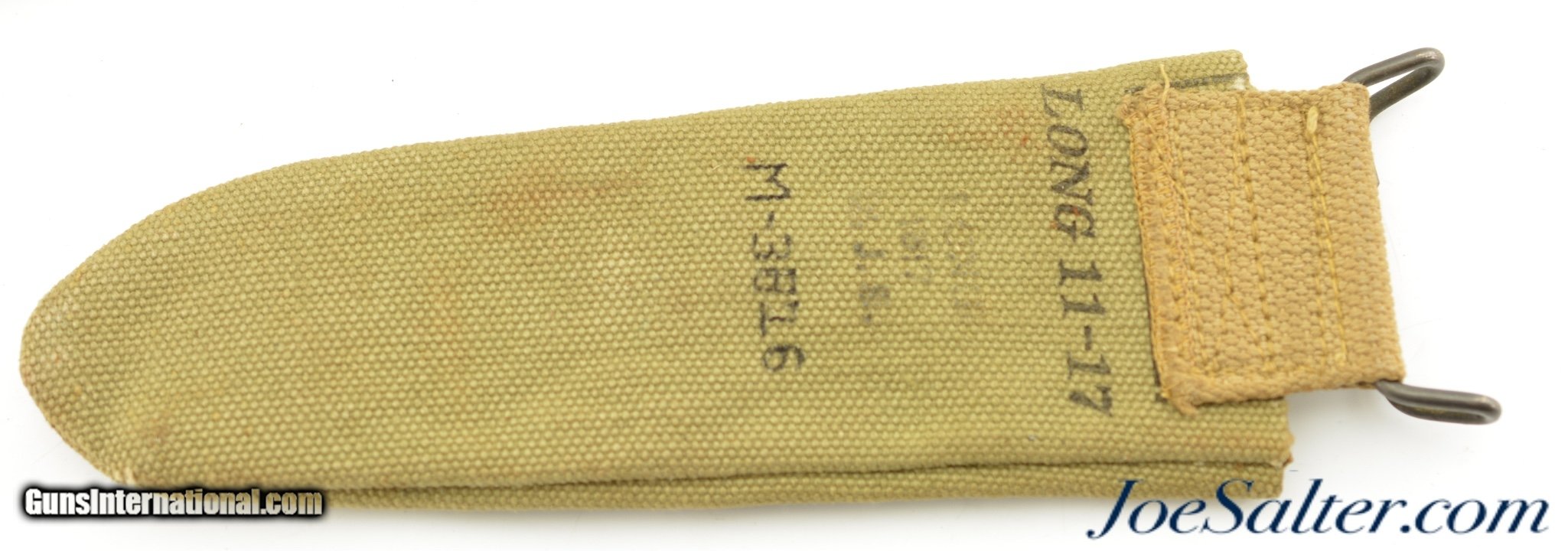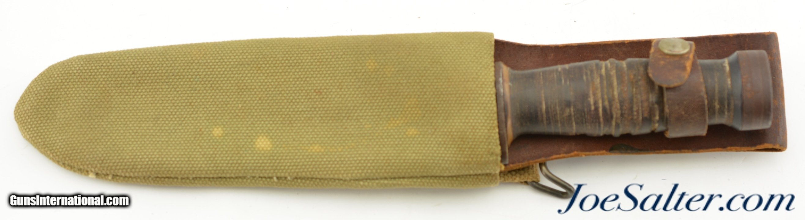 Description: This is a WWII U.S. issued Cattaraugus 225Q Commando fighting knife, blade 6"., 10 1/2" overall, bowie/utility style blade with leather washer handle. The bright blade is in very good to near excellent condition with light speckling, lightly sharpened blade and marked on the ricasso " Cattaraugus 225Q" The leather stacked washer handle shows nice patina and manual grooving, as normal, to improve grip. The three washer pommel has light oxidation with a waffled end. The correct leather scabbard is in excellent original condition with nice patina, tight stitching and rivets. This came to us in a 1917 dated tan canvas wire cutter pouch with M1910 belt hook, maker marked on the reverse Long 12017. ; SOLD |