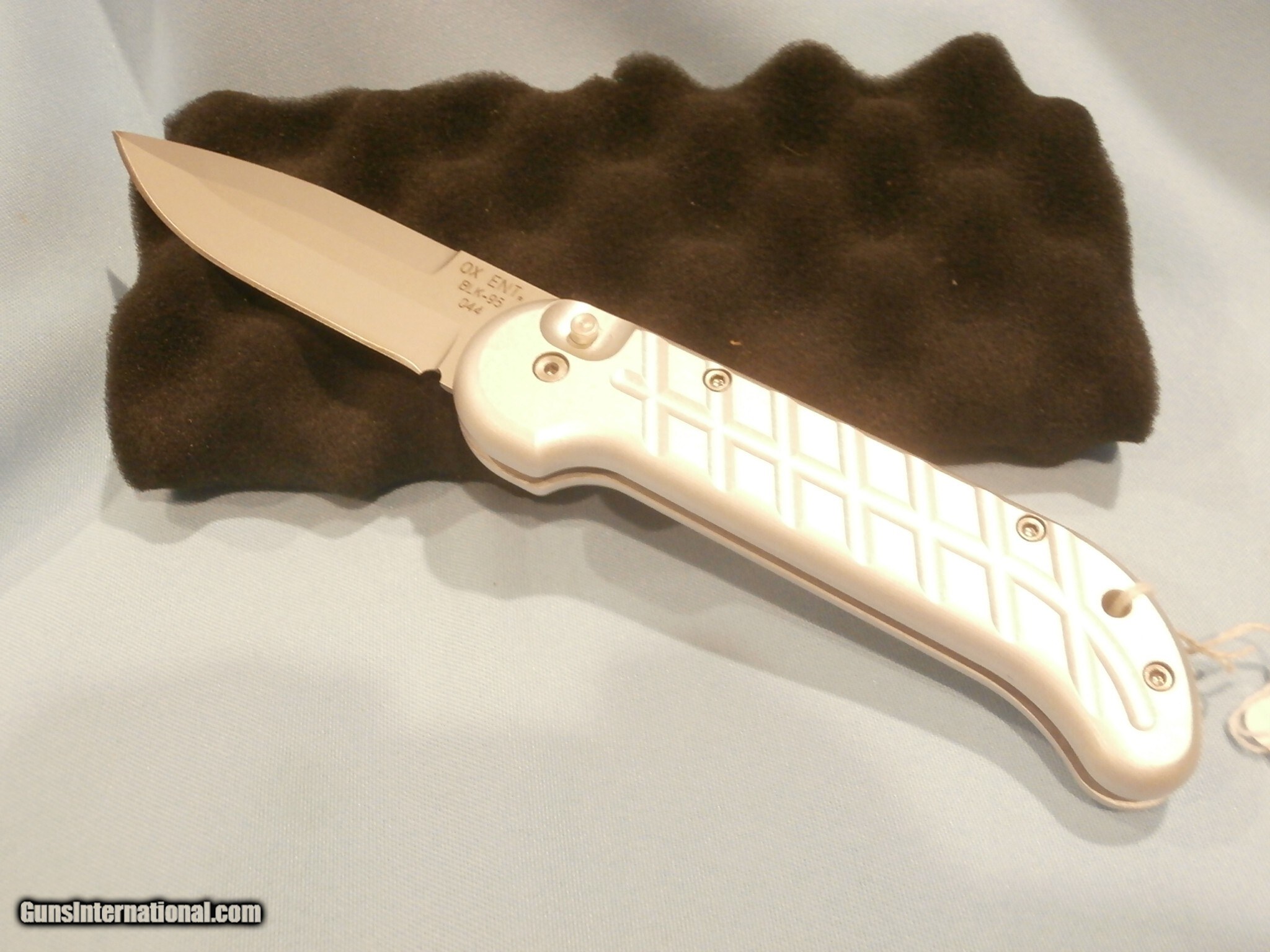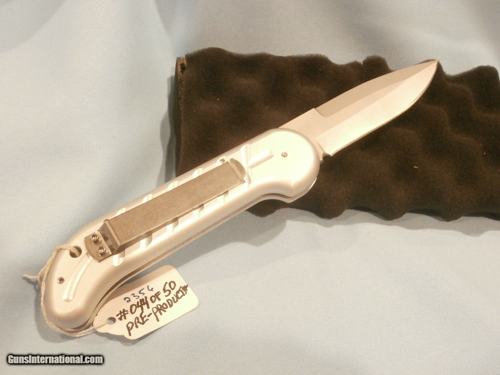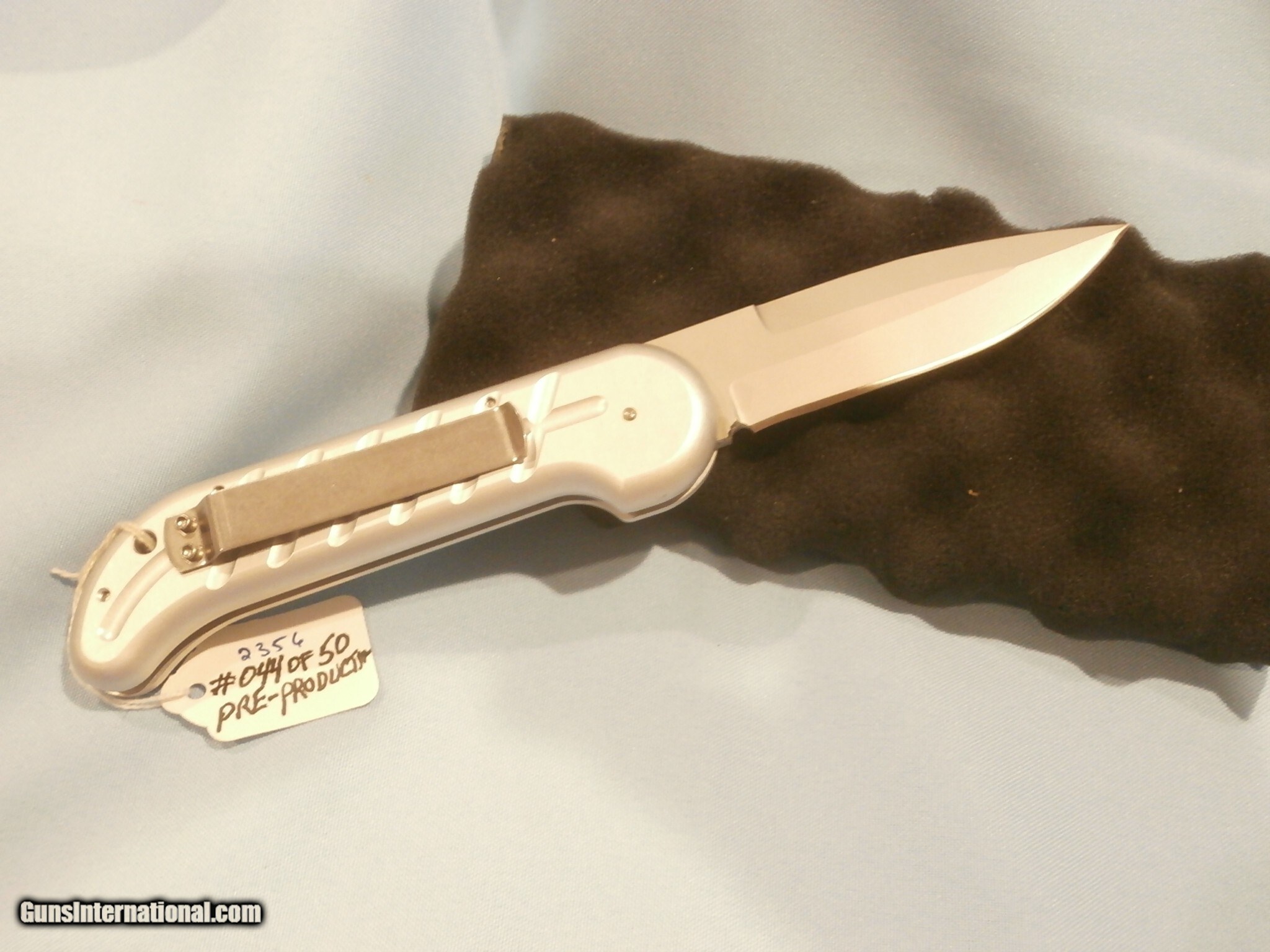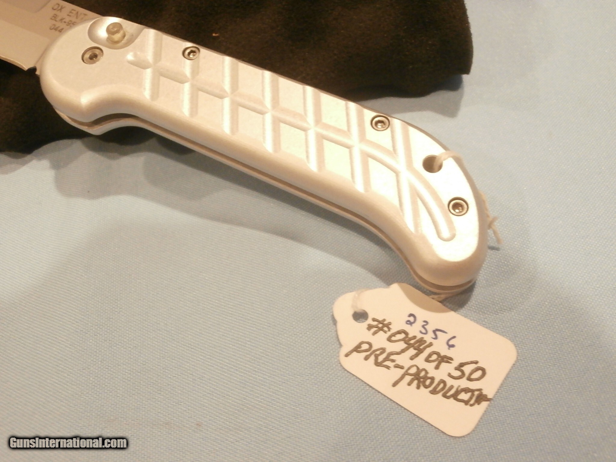 Description: OX FORGE BLACK KNIFE AUTOMATIC MODEL BLK-95 US MILITARY NAVY SEAL BLACK KNIFE MODEL 95 OX ENTERPRISES AUTOMATIC BLACK KNIFE NAVY SEALS BLACK KNIFE MODEL BLK-95 EXTREMELY RARE PRE-PRODUCTION BLK-95 #044 OF 050 IN BRIGHT SILVER (POLISHED) FINISH...SEE ALL PICS. NOTE: THE GRIP AND THE BLADE ARE BOTH FINISHED IN GREY AND SILVER...SEE ALL PICS. MADE IN THE USA BY MASTER BLADESMITH CHARLES OCHS III...OX FORGE, LARGO, FL EXTREMELY LIMITED PRODUCTION RUN...ALL WITH POLISHED, ALUMINUM GRIPS AND SERIAL-NUMBERED BLADES...SEE ALL PICS.!! THE EARLY, PRE-PRODUCTION RUN WAS LIMITED TO 50 NUMBERED KNIVES. NOTE: THIS IS KNIFE NUMBER 44 OF 50 PRESENTATION KNIVES WITH POLISHED ALUMINUM GRIPS AND GREY, NUMBERED, BLADES...SEE ALL PICS. 440C STAINLESS STEEL, NON-SERRATED, GREY-FINISH, BLADE LENGTH IS 3 7/8". BLADE IS FINISHED IN GRAY AND MARKED "OX ENT. BLK-95 044" ...SEE ALL PICS. CLOSED LENGTH IS 5 1/2" THE SPRING IS VERY STRONG...AND THE ACTION IS VERY FAST! THIS KNIFE IS BRAND NEW, OLD STOCK! NEVER USED!! NEVER CARRIED!! NO BOX. THIS PARTICULAR KNIFE CAME FROM TOM CLINTON'S PERSONAL COLLECTION. TOM CLINTON HAD A MASSIVE COLLECTION OF ALL VERSIONS, COLORS AND STYLES OF CHARLIE OCHS' NAVY SEALS "BLACK KNIFE". NOTE: TOM'S COLLECTION INCLUDED MANY EXPERIMENTAL AND VERY LIMITED PRODUCTION RUNS, INCLUDING "BLACK KNIVES" WITH BRIGHT YELLOW, BRIGHT ORANGE, MINT GREEN, AND POLISHED (SILVERED) ALUMINUM GRIPS...IN ADDITION TO SERIALLY-NUMBERED PRE-PRODUCTION AND OTHER, DATED SETS...AND MANY OTHERS. SOME OF THESE OTHER EXTREMELY RARE VERSIONS OF THE "BLACK KNIVES" WILL ALSO EVENTUALLY BE LISTED ON GI. Price: $695.00 Contact Seller |
