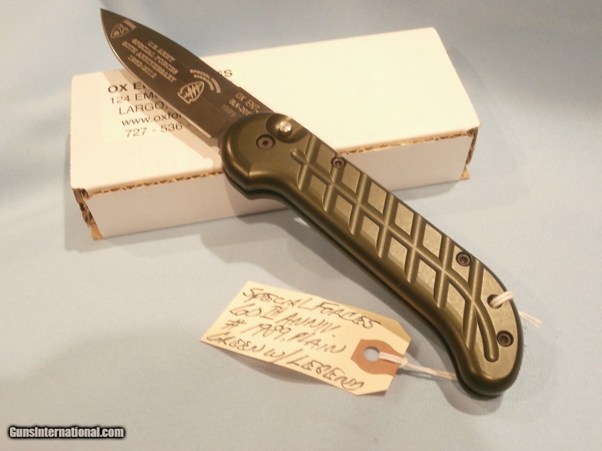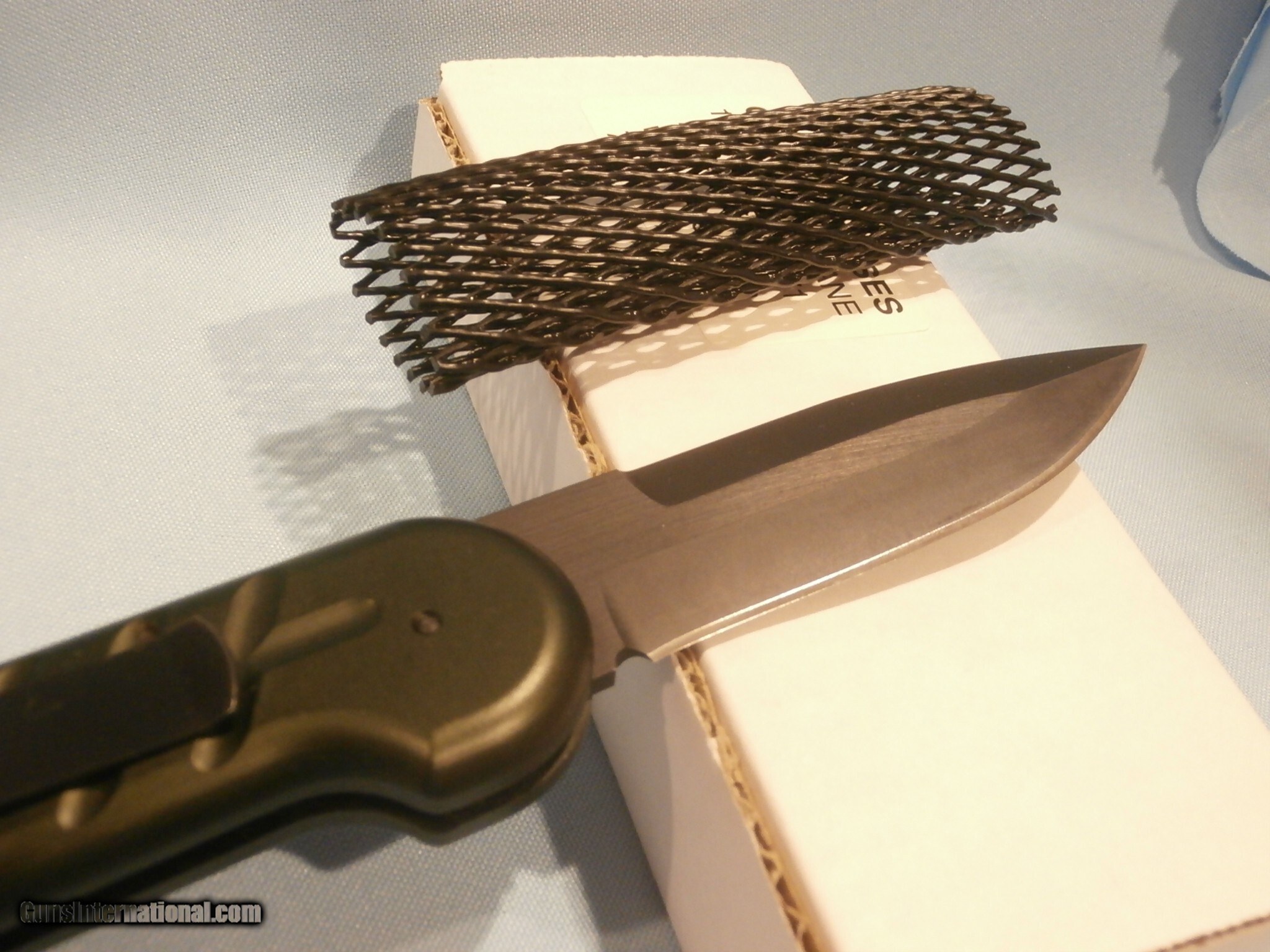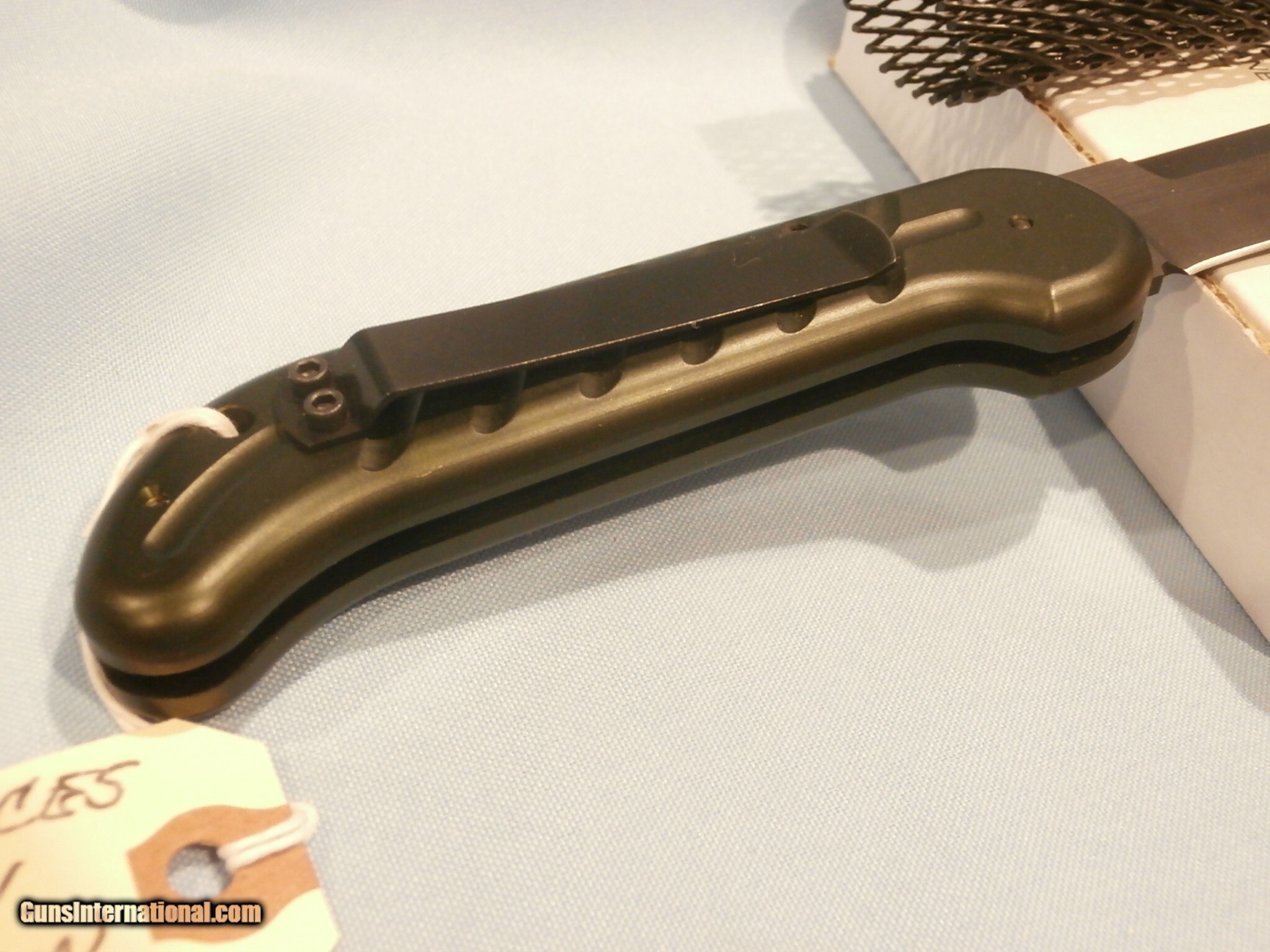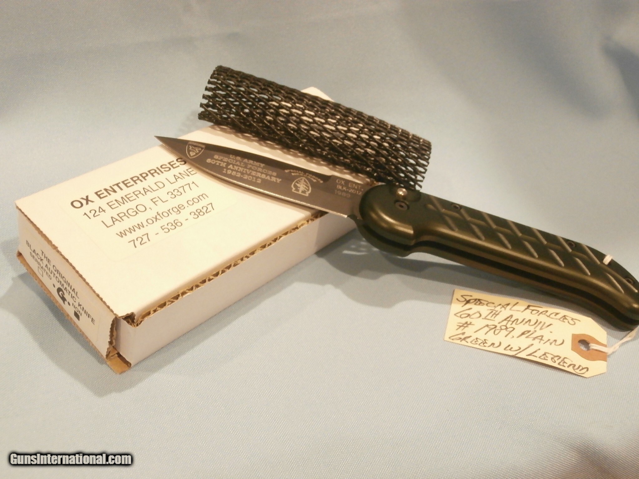 Description: OX FORGE BLACK KNIFE AUTOMATIC MODEL-95 US MILITARY NAVY SEAL BLACK KNIFE MODEL 95 OX ENTERPRISES AUTOMATIC BLACK KNIFE SPECIAL FORCES 60TH ANNIVERSARY EDITION EXTREMELY RARE!! SPECIAL, OLIVE GREEN, GRIP!...SEE ALL PICS. LIMITED-EDITION RUN FOR THE U.S. ARMY SPECIAL FORCES IN 2012...SEE ALL PICS. EXTREMELY RARE MODEL "BLK-2012" BLADE IS ETCHED "US ARMY SPECIAL FORCES 60TH ANNIVERSARY KNIFE #1989"...SEE ALL PICS. BLACK KNIFE MODEL 95, WITH OLIVE GREEN GRIP DATED 2012...SEE PICS. BLACK BLADE IS ETCHED WITH "U.S. ARMY SPECIAL FORCES 60TH ANNIVERSARY 1952-2012" "OX ENT. BLK-2012" "1989"...SEE ALL PICS. THE BLADE IS ALSO HEAVILY ETCHED WITH "SPECIAL FORCES" AND "AIRBORNE" LOGOS...SEE ALL PICS THE ORIGINAL BOX IS LABELED "G" "NON" (FOR NON-SERRATED)..SEE ALL PICS. THE BOX IS ALSO NUMBERED "SF 1989" BY CHARLIE OCHS...SEE ALL PICS. ORIGINAL, BLACK "NETTING" IS ALSO INCLUDED...SEE PICS. THIS KNIFE WAS PURCHASED DIRECTLY FROM CHARLIE OCHS AT OX FORGE. MADE IN THE USA BY MASTER BLADESMITH CHARLES OCHS III...OX FORGE, LARGO, FL EXTREMELY LIMITED PRODUCTION RUN...WITH ETCHED AND SERIAL-NUMBERED BLADE...SEE ALL PICS!! 440C STAINLESS STEEL, NON-SERRATED, BLACK FINISH, BLADE LENGTH IS 3 7/8"...SEE PICS! CLOSED LENGTH IS 5 1/2" THE SPRING IS VERY STRONG...AND THE ACTION IS VERY FAST! THIS KNIFE IS BRAND NEW, PURCHASED DIRECTLY FROM OX FORGE. NEVER USED!! NEVER CARRIED!! Price: $749.50 Contact Seller |
