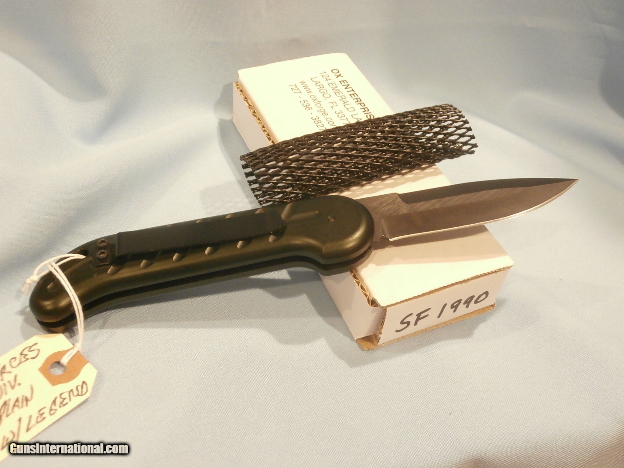 Description: OX FORGE BLACK KNIFE AUTOMATIC MODEL-95 US MILITARY NAVY SEAL BLACK KNIFE MODEL 95 OX ENTERPRISES AUTOMATIC BLACK KNIFE SPECIAL FORCES 60TH ANNIVERSARY EDITION EXTREMELY RARE!! SPECIAL, OLIVE GREEN, GRIP!...SEE ALL PICS. LIMITED-EDITION RUN FOR THE U.S. ARMY SPECIAL FORCES IN 2012...SEE ALL PICS. EXTREMELY RARE MODEL "BLK-2012" BLADE IS ETCHED "US ARMY SPECIAL FORCES 60TH ANNIVERSARY KNIFE #1990"...SEE ALL PICS. BLACK KNIFE MODEL 95, WITH OLIVE GREEN GRIP DATED 2012...SEE PICS. BLACK BLADE IS ETCHED WITH "U.S. ARMY SPECIAL FORCES 60TH ANNIVERSARY 1952-2012" "OX ENT. BLK-2012" "1990"...SEE ALL PICS. THE BLADE IS ALSO HEAVILY ETCHED WITH "SPECIAL FORCES" AND "AIRBORNE" LOGOS...SEE ALL PICS THE ORIGINAL BOX IS LABELED "G" "NON" (FOR NON-SERRATED)..SEE ALL PICS. THE BOX IS ALSO NUMBERED "SF 1990" BY CHARLIE OCHS...SEE ALL PICS. ORIGINAL, BLACK "NETTING" IS ALSO INCLUDED...SEE PICS. THIS KNIFE WAS PURCHASED DIRECTLY FROM CHARLIE OCHS AT OX FORGE. MADE IN THE USA BY MASTER BLADESMITH CHARLES OCHS III...OX FORGE, LARGO, FL EXTREMELY LIMITED PRODUCTION RUN...WITH ETCHED AND SERIAL-NUMBERED BLADE...SEE ALL PICS!! 440C STAINLESS STEEL, NON-SERRATED, BLACK FINISH, BLADE LENGTH IS 3 7/8"...SEE PICS! CLOSED LENGTH IS 5 1/2" THE SPRING IS VERY STRONG...AND THE ACTION IS VERY FAST! THIS KNIFE IS BRAND NEW, PURCHASED DIRECTLY FROM OX FORGE. NEVER USED!! NEVER CARRIED!! Price: $749.50 Contact Seller |