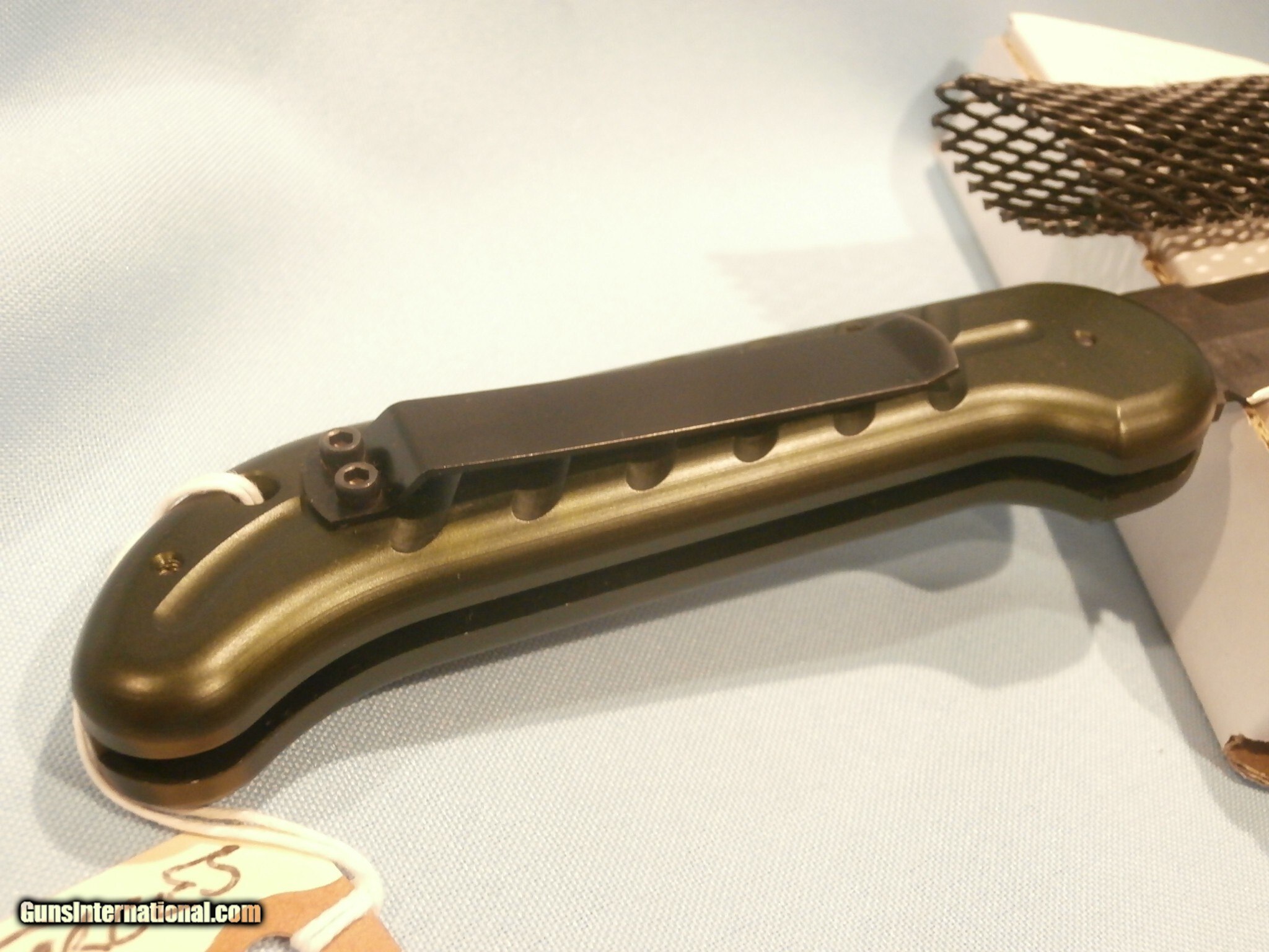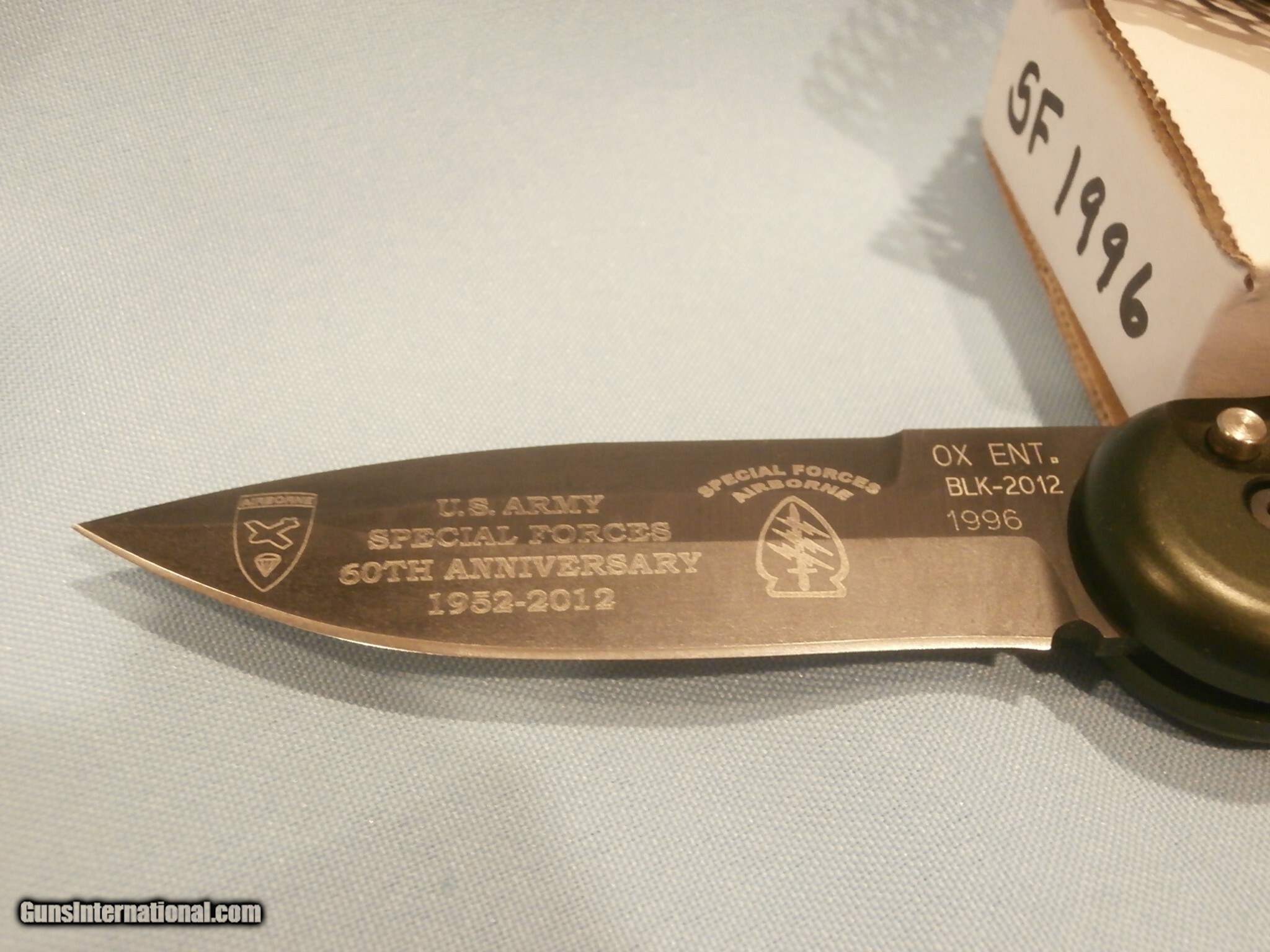 Description: OX FORGE BLACK KNIFE AUTOMATIC MODEL-95 US MILITARY NAVY SEAL BLACK KNIFE MODEL 95 OX ENTERPRISES AUTOMATIC BLACK KNIFE SPECIAL FORCES 60TH ANNIVERSARY EDITION EXTREMELY RARE!! SPECIAL, OLIVE GREEN, GRIP!...SEE ALL PICS. LIMITED-EDITION RUN FOR THE U.S. ARMY SPECIAL FORCES IN 2012...SEE ALL PICS. EXTREMELY RARE MODEL "BLK-2012" BLADE IS ETCHED "US ARMY SPECIAL FORCES 60TH ANNIVERSARY KNIFE #1996"...SEE ALL PICS. BLACK KNIFE MODEL 95, WITH OLIVE GREEN GRIP DATED 2012...SEE PICS. BLACK BLADE IS ETCHED WITH "U.S. ARMY SPECIAL FORCES 60TH ANNIVERSARY 1952-2012" "OX ENT. BLK-2012" "1996"...SEE ALL PICS. THE BLADE IS ALSO HEAVILY ETCHED WITH "SPECIAL FORCES" AND "AIRBORNE" LOGOS...SEE ALL PICS THE ORIGINAL BOX IS LABELED "G" "NON" (FOR NON-SERRATED)..SEE ALL PICS. THE BOX IS ALSO NUMBERED "SF 1996" BY CHARLIE OCHS...SEE ALL PICS. ORIGINAL, BLACK "NETTING" IS ALSO INCLUDED...SEE PICS. THIS KNIFE WAS PURCHASED DIRECTLY FROM CHARLIE OCHS AT OX FORGE. MADE IN THE USA BY MASTER BLADESMITH CHARLES OCHS III...OX FORGE, LARGO, FL EXTREMELY LIMITED PRODUCTION RUN...WITH ETCHED AND SERIAL-NUMBERED BLADE...SEE ALL PICS!! 440C STAINLESS STEEL, NON-SERRATED, BLACK FINISH, BLADE LENGTH IS 3 7/8"...SEE PICS! CLOSED LENGTH IS 5 1/2" THE SPRING IS VERY STRONG...AND THE ACTION IS VERY FAST! THIS KNIFE IS BRAND NEW, PURCHASED DIRECTLY FROM OX FORGE. NEVER USED!! NEVER CARRIED!! Price: $749.50 Contact Seller |