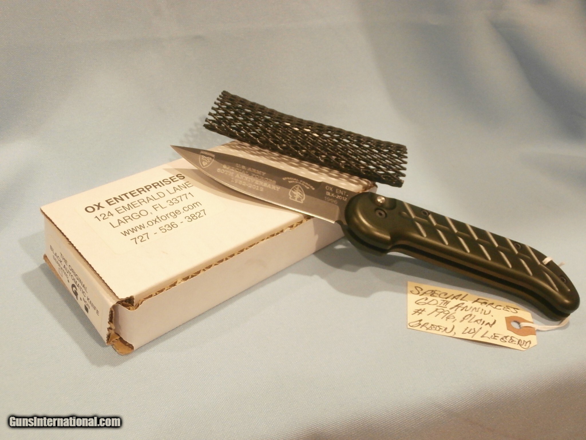 OX FORGE BLACK KNIFE BLK-95 US MILITARY NAVY SEAL BLACK KNIFE BLK-95 OX ENTERPRISES AUTOMATIC SPECIAL FORCES 60TH ANNIVERSARY GREEN GRIP RARE!