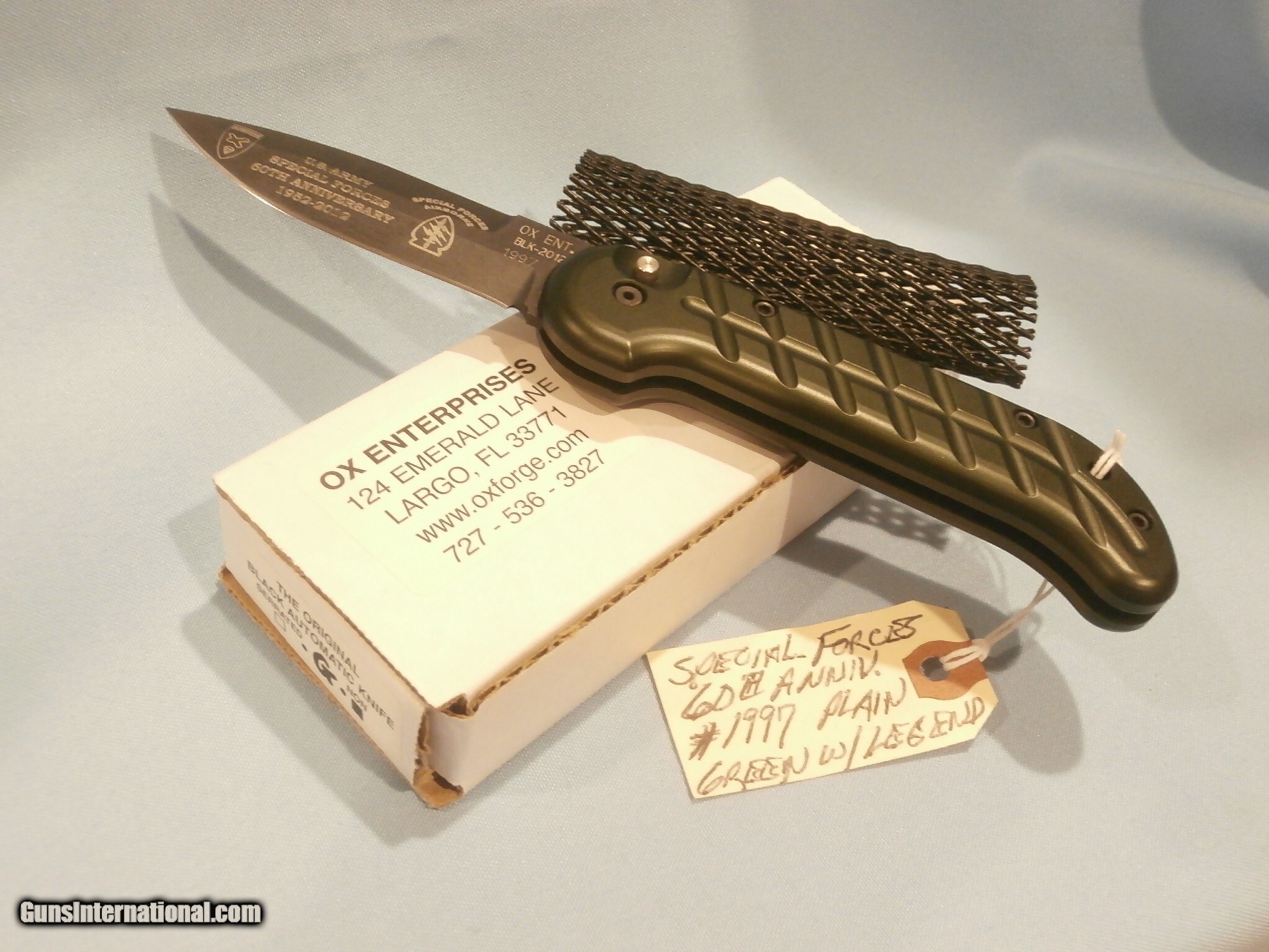 OX FORGE BLACK KNIFE BLK-95 US MILITARY NAVY SEAL BLACK KNIFE BLK-95 OX ENTERPRISES AUTOMATIC SPECIAL FORCES 60TH ANNIVERSARY GREEN GRIP RARE!