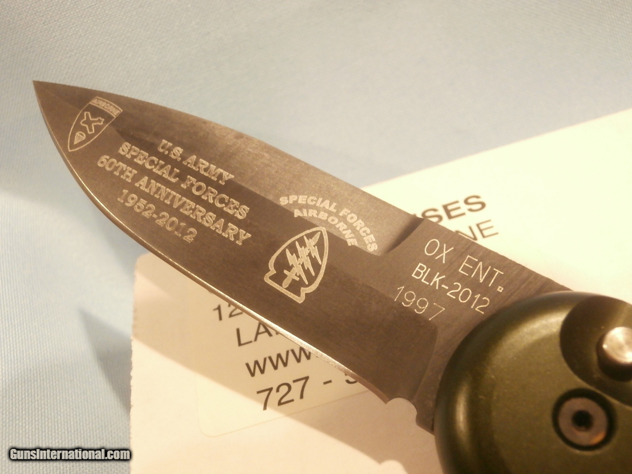 Description: OX FORGE BLACK KNIFE AUTOMATIC MODEL-95 US MILITARY NAVY SEAL BLACK KNIFE MODEL 95 OX ENTERPRISES AUTOMATIC BLACK KNIFE SPECIAL FORCES 60TH ANNIVERSARY EDITION EXTREMELY RARE!! SPECIAL, OLIVE GREEN, GRIP!...SEE ALL PICS. LIMITED-EDITION RUN FOR THE U.S. ARMY SPECIAL FORCES IN 2012...SEE ALL PICS. EXTREMELY RARE MODEL "BLK-2012" BLADE IS ETCHED "US ARMY SPECIAL FORCES 60TH ANNIVERSARY KNIFE #1997"...SEE ALL PICS. BLACK KNIFE MODEL 95, WITH OLIVE GREEN GRIP DATED 2012...SEE PICS. BLACK BLADE IS ETCHED WITH "U.S. ARMY SPECIAL FORCES 60TH ANNIVERSARY 1952-2012" "OX ENT. BLK-2012" "1997"...SEE ALL PICS. THE BLADE IS ALSO HEAVILY ETCHED WITH "SPECIAL FORCES" AND "AIRBORNE" LOGOS...SEE ALL PICS THE ORIGINAL BOX IS LABELED "G" "NON" (FOR NON-SERRATED)..SEE ALL PICS. THE BOX IS ALSO NUMBERED "SF 1997" BY CHARLIE OCHS...SEE ALL PICS. ORIGINAL, BLACK "NETTING" IS ALSO INCLUDED...SEE PICS. THIS KNIFE WAS PURCHASED DIRECTLY FROM CHARLIE OCHS AT OX FORGE. MADE IN THE USA BY MASTER BLADESMITH CHARLES OCHS III...OX FORGE, LARGO, FL EXTREMELY LIMITED PRODUCTION RUN...WITH ETCHED AND SERIAL-NUMBERED BLADE...SEE ALL PICS!! 440C STAINLESS STEEL, NON-SERRATED, BLACK FINISH, BLADE LENGTH IS 3 7/8"...SEE PICS! CLOSED LENGTH IS 5 1/2" THE SPRING IS VERY STRONG...AND THE ACTION IS VERY FAST! THIS KNIFE IS BRAND NEW, PURCHASED DIRECTLY FROM OX FORGE. NEVER USED!! NEVER CARRIED!! Price: $749.50 Contact Seller |