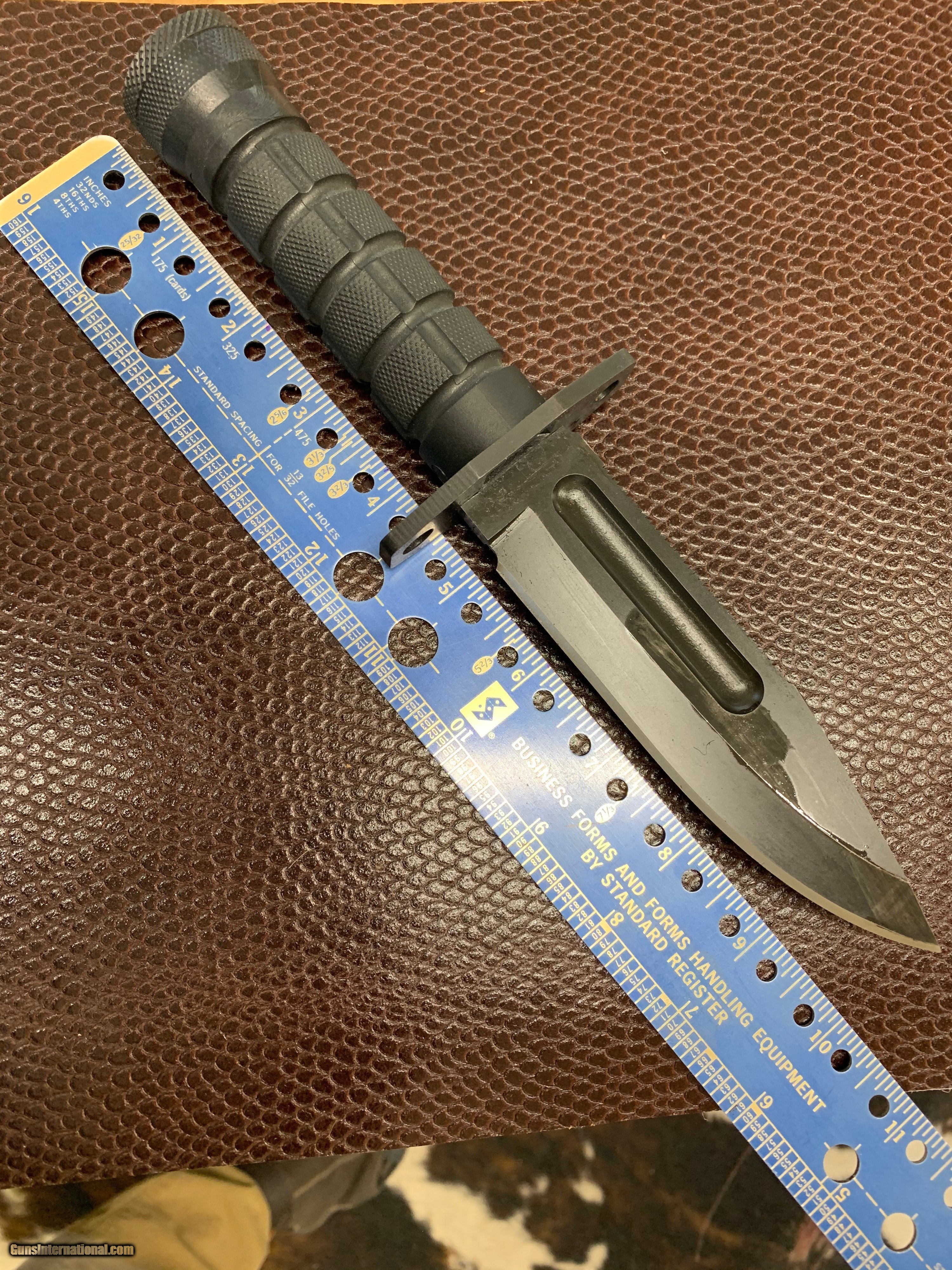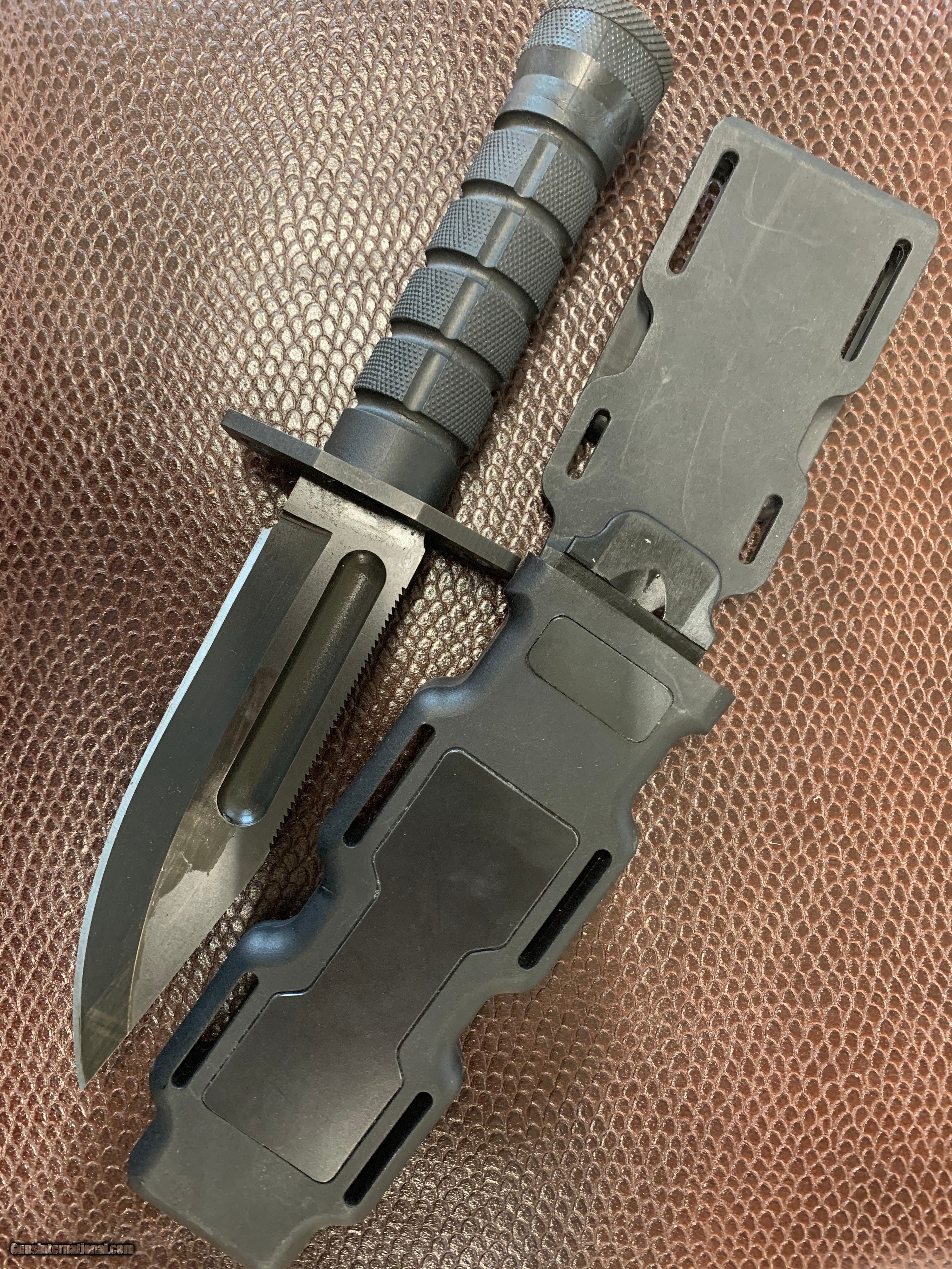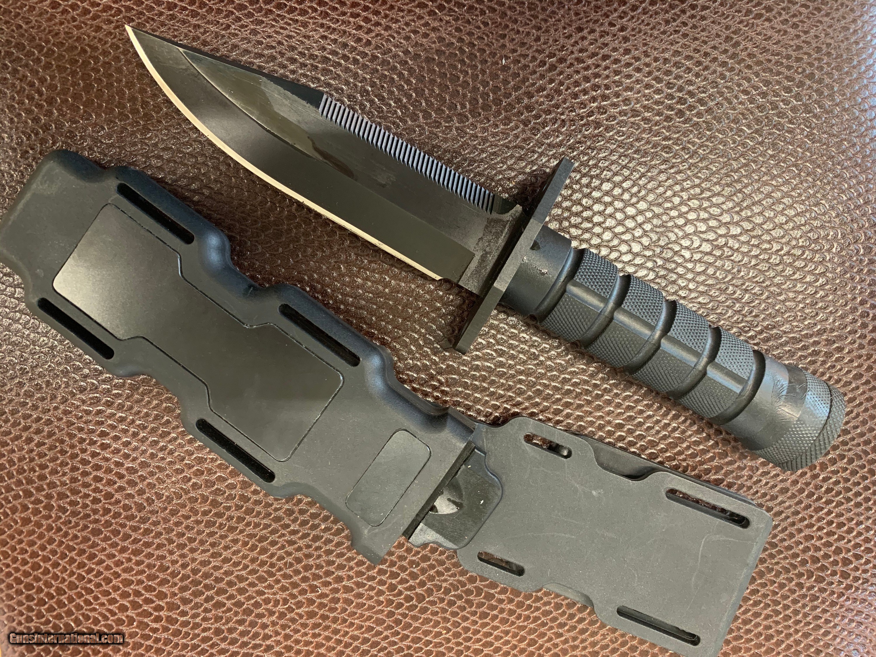 Description: PHROBIS - GEN. II, SURVIVAL KNIFE. This is a Like NEW, Never Used, M9A1 Made in U.S.A. Early Generation III. Still has the factory oil on the Blade and the Black and White Phrobis Dolphin Manufacture Stamp on the Factory Black Nylon Scabbard/Sheath. This is the Survival Knife made popular and widely used in the SpecWar Community. The Blade is a 5 1/2" 420M Stainless in Mint Condition as it was never used. The Survival Knife is 10 1/4" Overall. The sheath is the black Zytel material and it too is in Mint / Never Used Condition. PRICE REDUCED to $135.00 / OBO. Plus $20.00 Shipping and Insurance. / SOLD ! SOLD |
