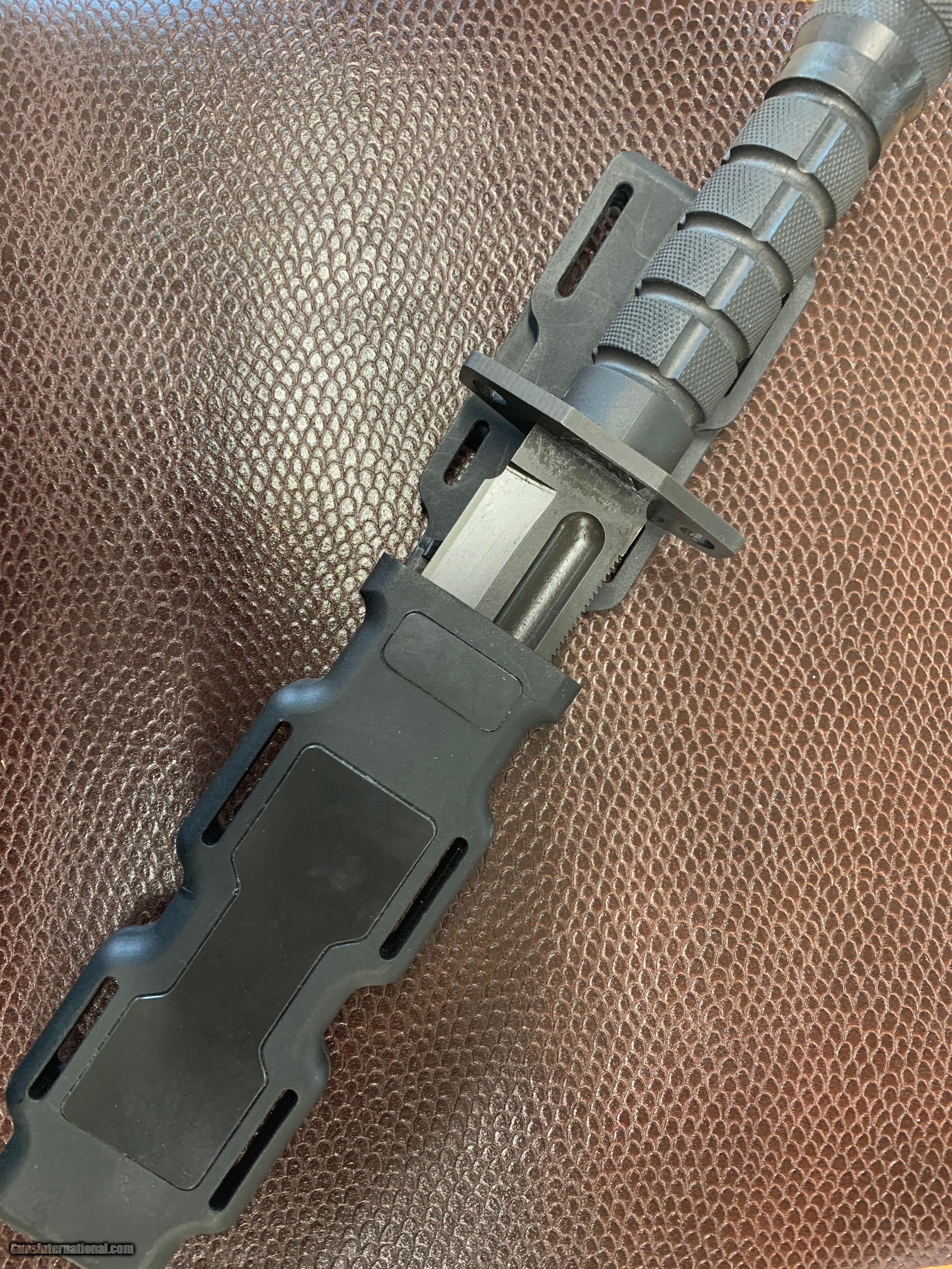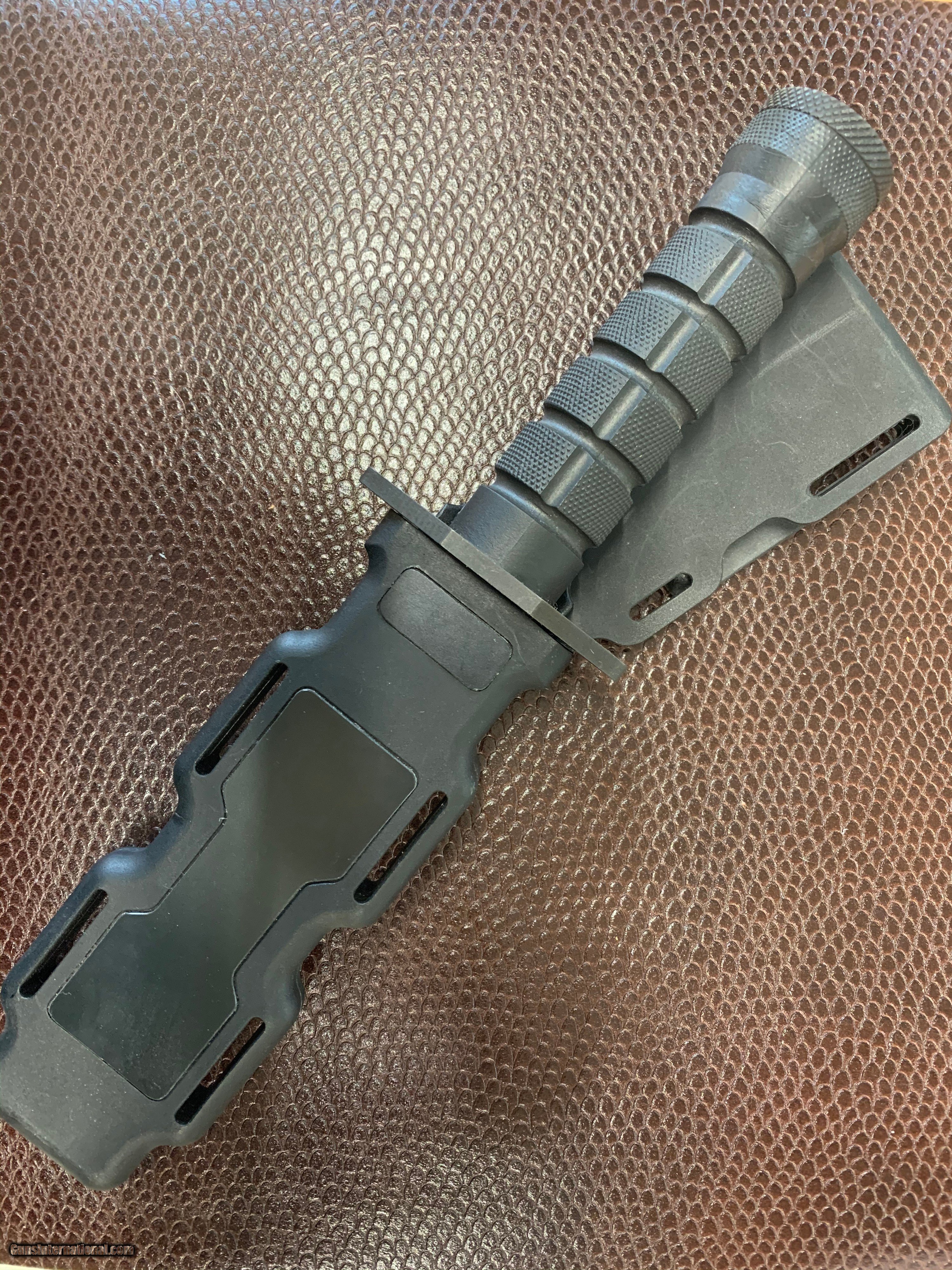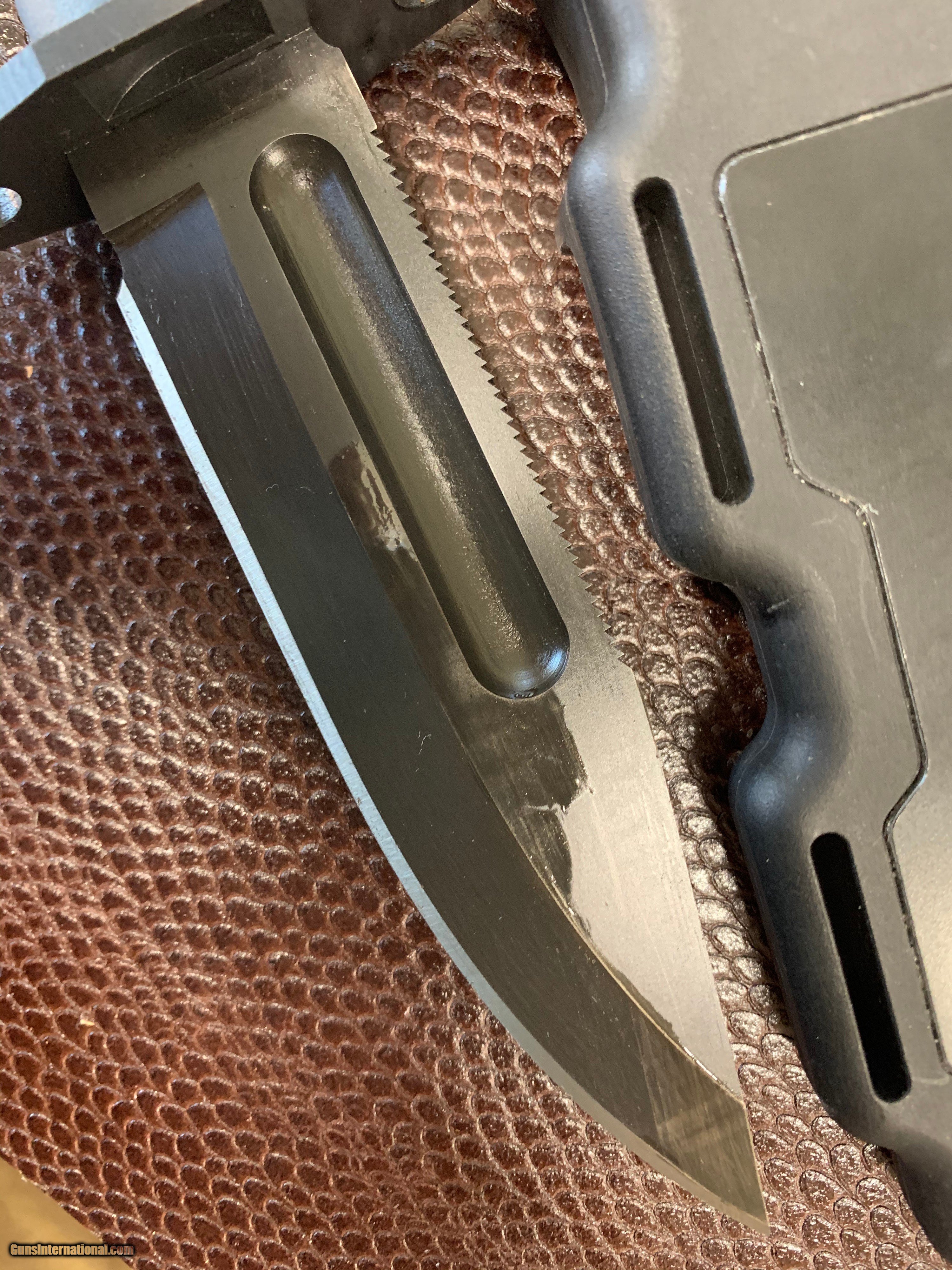 Description: PHROBIS - GEN. II, SURVIVAL KNIFE. This is a Like NEW, Never Used, M9A1 Made in U.S.A. Early Generation III. Still has the factory oil on the Blade and the Black and White Phrobis Dolphin Manufacture Stamp on the Factory Black Nylon Scabbard/Sheath. This is the Survival Knife made popular and widely used in the SpecWar Community. The Blade is a 5 1/2" 420M Stainless in Mint Condition as it was never used. The Survival Knife is 10 1/4" Overall. The sheath is the black Zytel material and it too is in Mint / Never Used Condition. PRICE REDUCED to $135.00 / OBO. Plus $20.00 Shipping and Insurance. / SOLD ! SOLD |