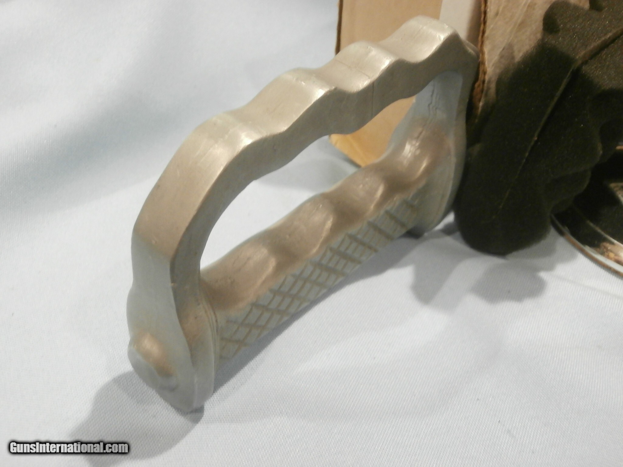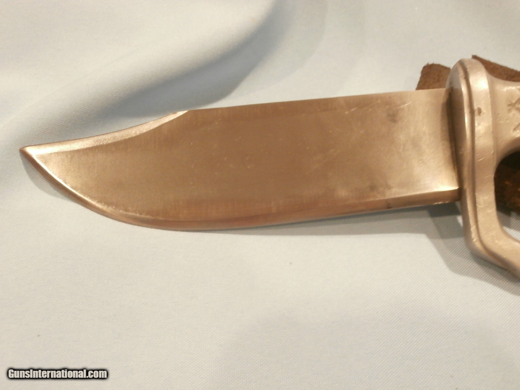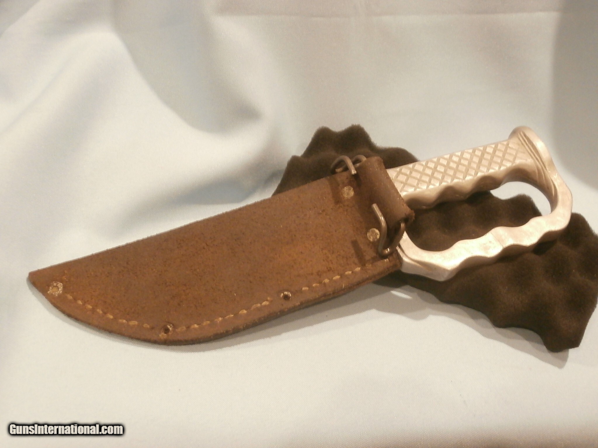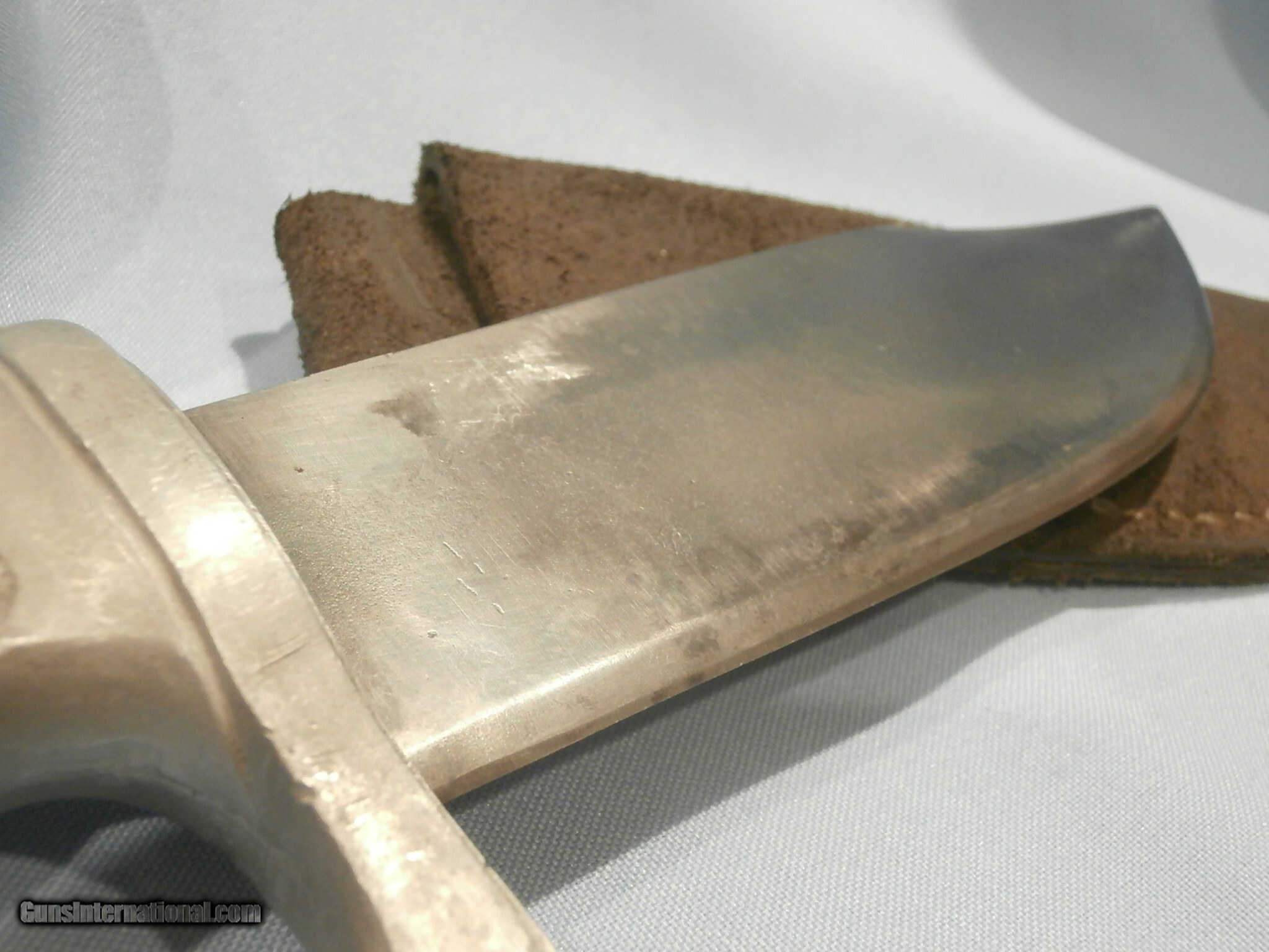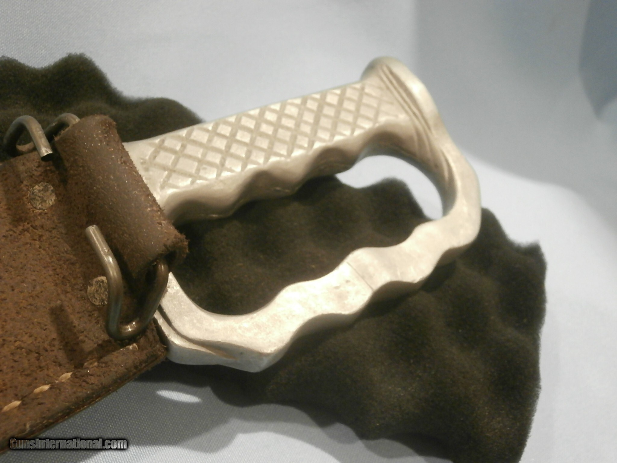 Description: MASSIVE WWII FIGHTING KNIFE WITH VERY HEAVY, CHECKERED ALUMINUM, KNUCKLE GRIP. ORIGINAL, LEATHER SCABBARD WITH BELT HOOKS IS ALSO IN EXCELLENT, VINTAGE CONDITION!...SEE PICS. LARGE 6 7/8" x 2" CLIP-POINT, BOWIE BLADE REMAINS IN EXCELLENT, VINTAGE, CONDITION!!...SEE PICS. BLADE IS EXTREMELY SHARP! 12" OVERALL LENGTH...SEE PICS. KNUCKLE GUARD MAX WIDTH IS 3 1/2"...SEE PICS. KNUCKLE GRIP IS 5" LONG...SEE PICS. VERY HEAVY, REINFORCED, SOLID, ALUMINUM GRIP WITH DEEPLY IMPRESSED "CHECKERING"...SEE PICS. FOUR (4) KNUCKLES PROTRUDE FROM THE HEAVY, REINFORCED, GUARD...SEE ALL PICS. THIS IS A VERY HEAVY, SOLID, REINFORCED, KNUCKLE KNIFE IN EXCELLENT CONDITION, WITH ORIGINAL SCABBARD!!...SEE ALL PICS. NO MAKER'S MARKS Price: $899.50 Contact Seller |