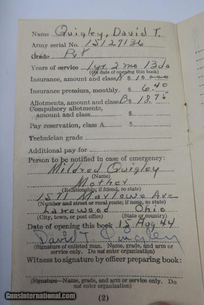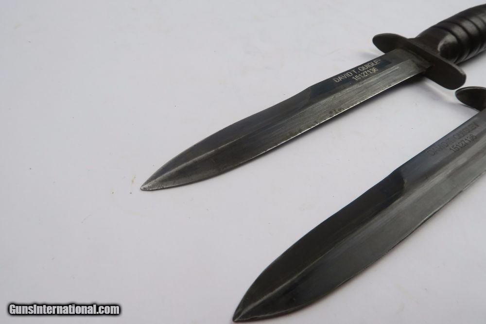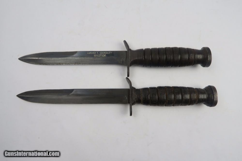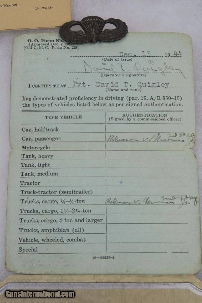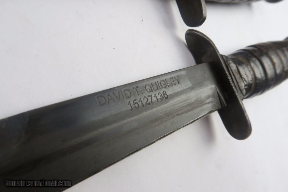 Description: This is a rare offering of a WW2 Paratrooper veteran's belongings including two US M3 Fighting knives the solider was issued during his time of service. Each blade is engraved on one side with the soldier's name: "David T. Quigley" and serial number. David Quigley fought with the US Airborne paratroopers and we have his parachute log record, US Airborne patch and pin, Soldier's Pay Record booklet, Motor Vehicle Permit, dog tags, photo, and two identification cards for when he was enlisted in the Army Reserve Corps. Furhter research on this soldier found that he was born June 6th 1925, received a Purple Heart during WW2, and died on February 10th, 1991. Everything shown in photos is included with this listing. The two blades are different maker stamps, one being CASE blade marked and the other being KINFOLKS blade marked. The family had each blade engraved with his name after he returned from WW2. This is a very cool grouping of REAL US history! Guaranteed all original and authentic. SOLD |