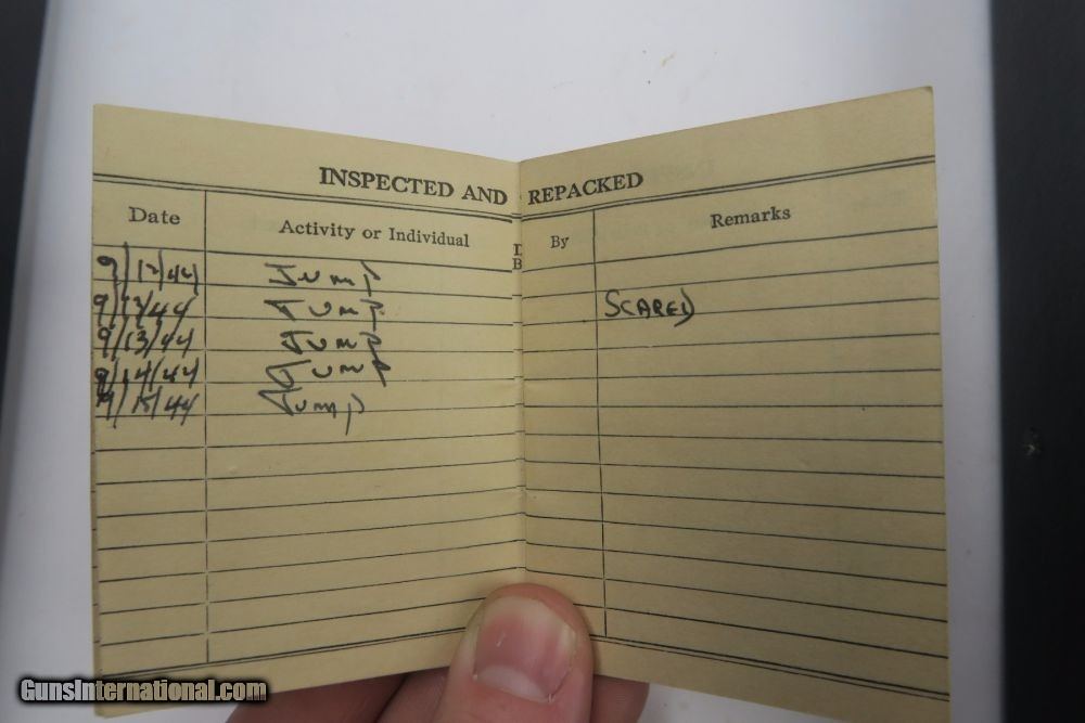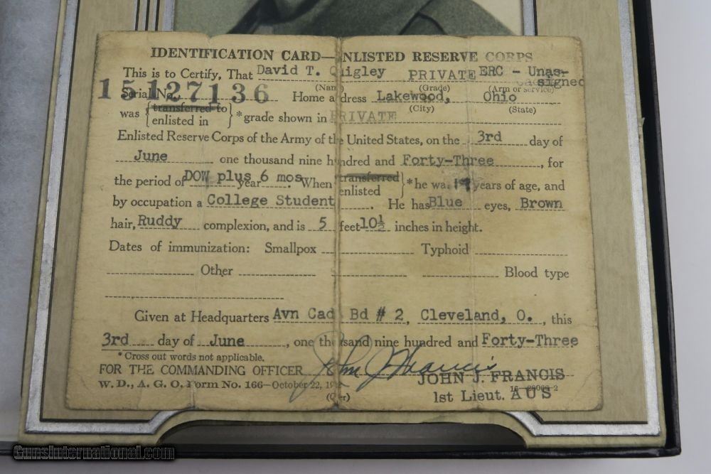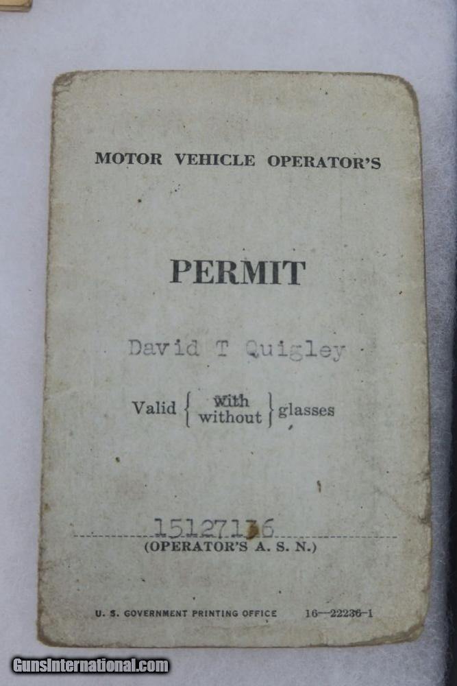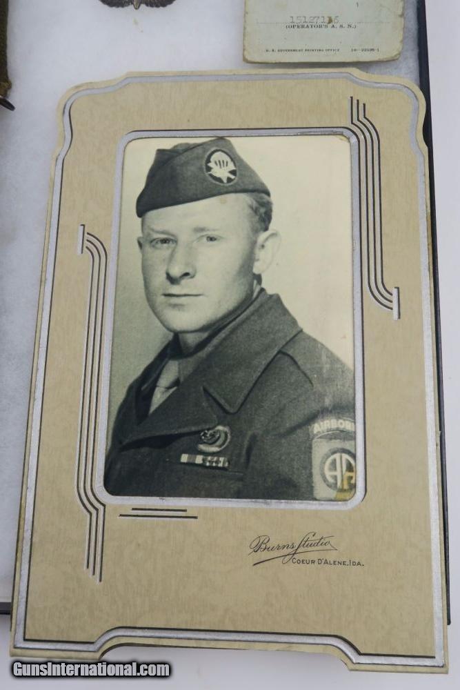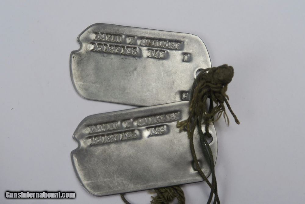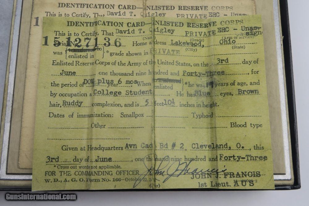 Description: This is a rare offering of a WW2 Paratrooper veteran's belongings including two US M3 Fighting knives the solider was issued during his time of service. Each blade is engraved on one side with the soldier's name: "David T. Quigley" and serial number. David Quigley fought with the US Airborne paratroopers and we have his parachute log record, US Airborne patch and pin, Soldier's Pay Record booklet, Motor Vehicle Permit, dog tags, photo, and two identification cards for when he was enlisted in the Army Reserve Corps. Furhter research on this soldier found that he was born June 6th 1925, received a Purple Heart during WW2, and died on February 10th, 1991. Everything shown in photos is included with this listing. The two blades are different maker stamps, one being CASE blade marked and the other being KINFOLKS blade marked. The family had each blade engraved with his name after he returned from WW2. This is a very cool grouping of REAL US history! Guaranteed all original and authentic. SOLD |