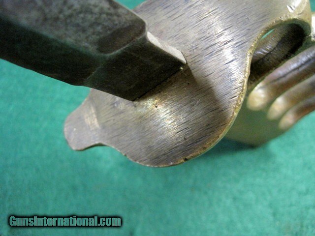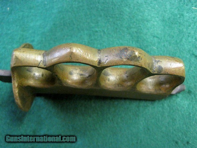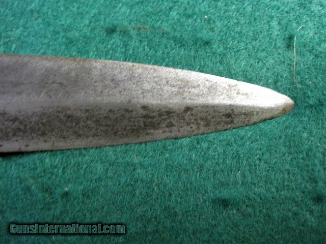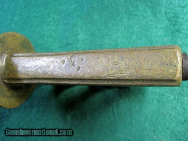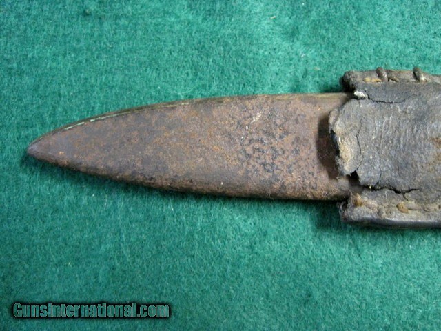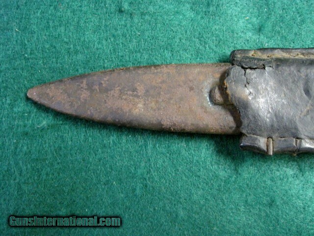 Description: Antique WWI AU LION Trench Knife. Blade is marked AU LION with Lion logo on one side. Blade has some marks, spots, discoloration, and edge wear from age and use. Handle is brass and is not marked. Approx. 11 1/2" total length. Scabbard & Leather Frog are in relic condition. SOLD |