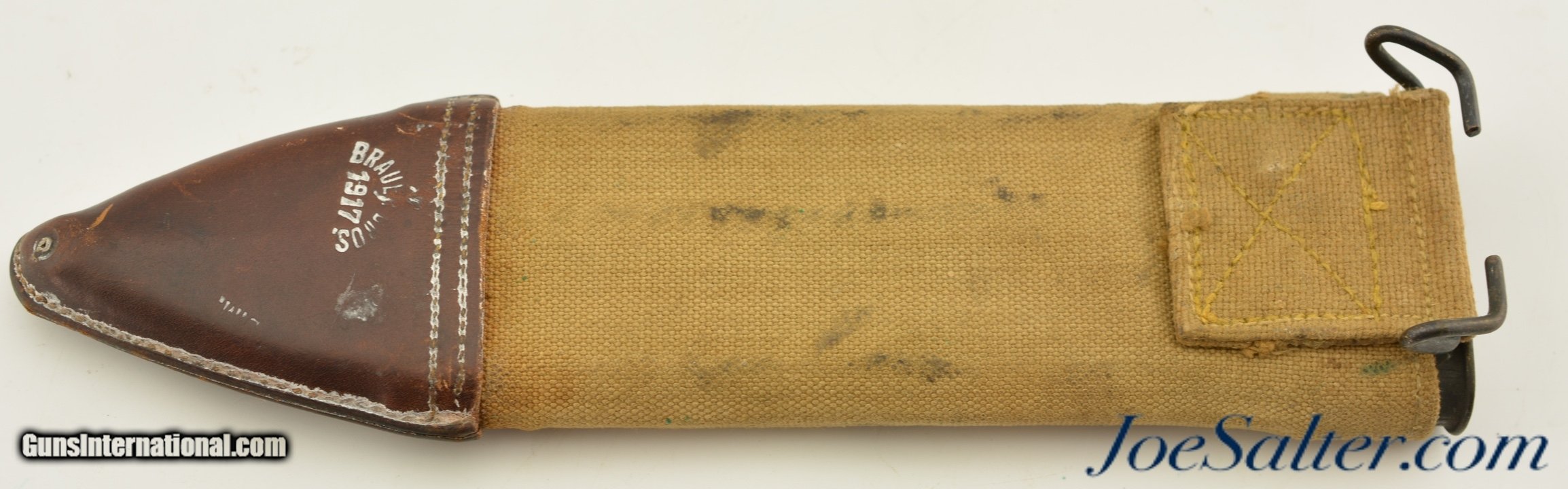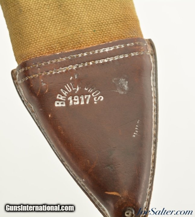 Description: This is a US WWI M1917 Bolo Knife/Scabbard. This example was manufactured by the Fayette R. Plumb Co., St. Louis, MO, in 1918. The blade is in very good+ condition with most of the original finish intact, very nice edge and correct point. The guard has signs of wear on edges but nice finish elsewhere. The handle has a dark patina with few imperfection, has a M carved into one scale. The very good to excellent condition Brauer Bros. 1917 D.M marked scabbard has nice stitching and few stains with fully functioning hardware. SOLD |